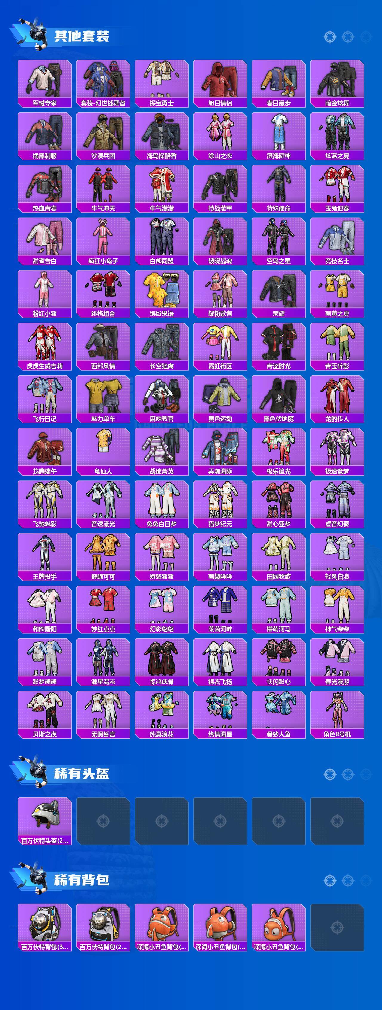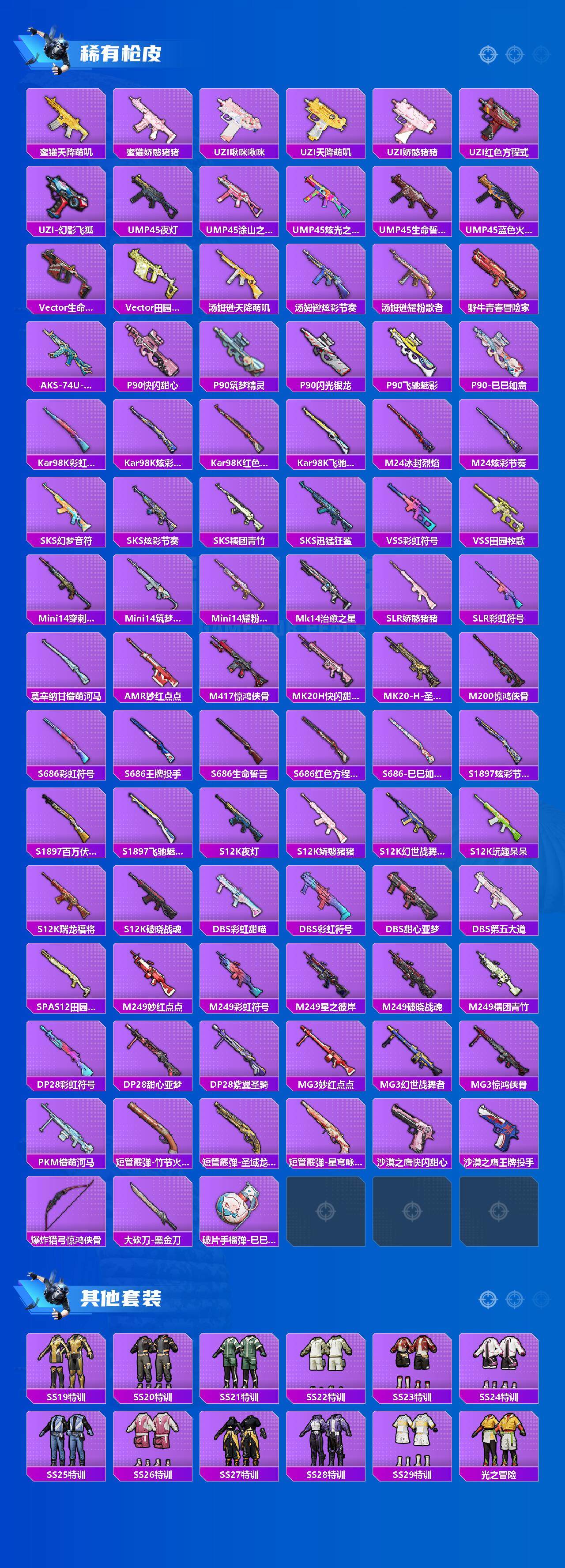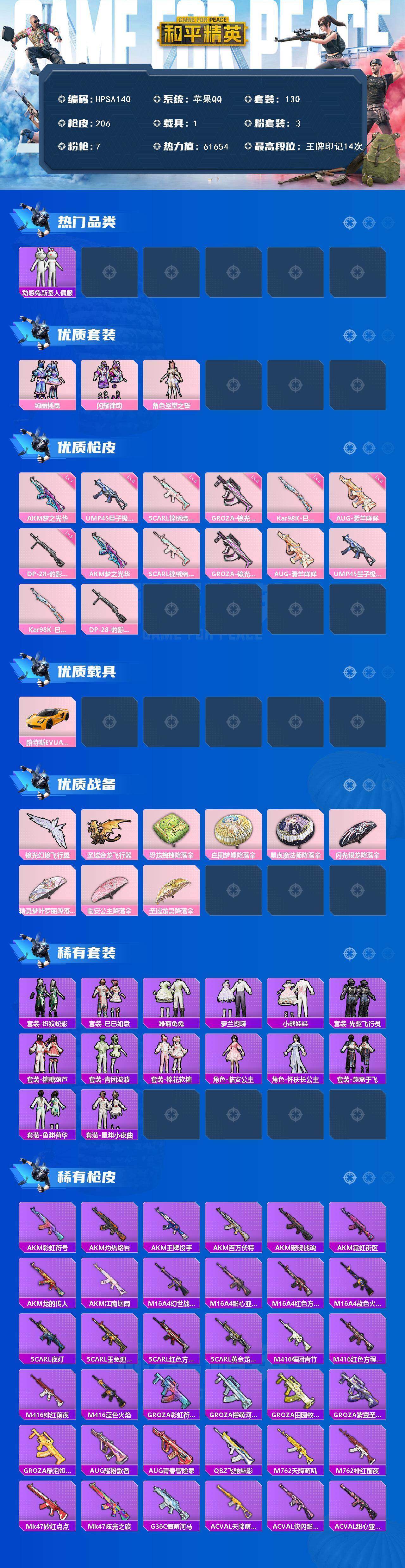 【hpsa140】130套装/呛械7/装备233/载具1/战备158/王牌印记14/热力值61654/七级akm-梦之光华/五级scar-l-锦绣绵绵/五级groza-镜光银凌/五级aug-暖羊咩咩/五级ump45-量子极限/五级kar98k-巳巳如意/五级dp-28-豹影疾电/套装-动感兔斯基人偶服/套装-龟仙人/套装-粉红小猪/角色-8号机/粉装-绚丽摇曳/粉装-闪耀律动/角色-圣堂之誓/路特斯evija(星际黄)/akm-梦之光华/scar-l-锦绣绵绵/groza-镜光银凌/aug-暖羊咩咩/ump45-量子极限/kar98k-巳巳如意/dp-28-豹影疾电/镜光幻境飞行翼/圣域金龙飞行器/恐龙拽拽降落伞/庄周梦蝶降落伞/星夜魔法师降落伞/闪光银龙降落伞/精灵梦叶罗丽降落伞/临安公主降落伞/圣域龙灵降落伞/套装-炽纹蛇影/套装-巳巳如意/套装-雪国风尚/套装-雏菊兔兔/套装-萝兰蝴蝶/套装-小熊娃娃/套装-先驱飞行员/套装-糖糖葫芦/套装-青团波波/套装-棉花软糖/角色-临安公主/角色-怀庆长公主/套装-燕燕于飞/套装-鱼渊荷华/套装-星渊小夜曲/akm-彩虹符号/akm-江南烟雨/akm-灼热熔岩/akm-王牌投手/akm-百万伏特/akm-破晓战魂/akm-霓虹街区/akm-龙的传人/m16a4-幻世战舞者/m16a4-甜心亚梦/m16a4-红色方程式/m16a4-蓝色火焰/scar-l-夜灯/scar-l-玉兔迎春/scar-l-红色方程式/scar-l-黄金龙骨/m416-糯团青竹/m416-红色方程式/m416-绯红前夜/m416-蓝色火焰/groza-彩虹符号/groza-懵萌河马/groza-田园牧歌/groza-紫翼圣骑/groza-酷泡奶龙/aug-耀粉歌者/aug-青春冒险家/q-飞驰魅影/m762-天降萌叽/m762-绯红前夜/mk47-妙红点点/mk47-炫光之旅/g36c-懵萌河马/ac-val-天降萌叽/ac-val-快闪甜心/ac-val-甜心亚梦/蜜獾-天降萌叽/蜜獾-娇憨猪猪/uzi-啾咪啾咪/uzi-天降萌叽/uzi-娇憨猪猪/uzi-红色方程式/uzi-幻影飞狐/ump45-夜灯/ump45-涂山之恋/ump45-炫光之旅/ump45-生命誓言/ump45-蓝色火焰/vect-生命誓言/vect-田园牧歌/汤姆逊-天降萌叽/汤姆逊-炫彩节奏/汤姆逊-耀粉歌者/野牛-青春冒险家/aks-74u-辉羽雀灵/p90-快闪甜心/p90-筑梦精灵/p90-闪光银龙/p90-飞驰魅影/p90-巳巳如意/kar98k-彩虹符号/kar98k-炫彩节奏/kar98k-红色方程式/kar98k-飞驰魅影/m24-炫彩节奏/m24-冰封烈焰/sks-幻梦音符/sks-炫彩节奏/sks-糯团青竹/sks-迅猛狂鲨/vss-彩虹符号/vss-田园牧歌/mini14-穿刺龙虾/mini14-筑梦精灵/mini14-耀粉歌者/mk14-治愈之星/slr-娇憨猪猪/slr-彩虹符号/莫辛纳甘-懵萌河马/amr-妙红点点/m417-惊鸿侠骨/mk20-h-快闪甜心/mk20-h-圣域龙灵/m200-惊鸿侠骨/s686-彩虹符号/s686-王牌投手/s686-生命誓言/s686-红色方程式/s686-巳巳如意/s1897-炫彩节奏/s1897-百万伏特/s1897-飞驰魅影/s12k-玩趣呆呆/s12k-瑞龙福将/s12k-破晓战魂/s12k-夜灯/s12k-娇憨猪猪/s12k-幻世战舞者/dbs-彩虹甜喵/dbs-彩虹符号/dbs-甜心亚梦/dbs-第五大道/spas-12-田园牧歌/m249-妙红点点/m249-彩虹符号/m249-星之彼岸/m249-破晓战魂/m249-糯团青竹/dp-28-彩虹符号/dp-28-甜心亚梦/dp-28-紫翼圣骑/mg3-妙红点点/mg3-幻世战舞者/mg3-惊鸿侠骨/pkm-懵萌河马/短管霰弹-竹节火铳/短管霰弹-圣域龙灵/短管霰弹-星穹咏叹调/沙墨之鹦-快闪甜心/沙墨之鹦-王牌投手/爆炸猎弓-惊鸿侠骨/大砍刀-黑金刀/破片手留单-巳巳如意/套装-ss19特训/套装-ss20特训/套装-ss21特训/套装-ss22特训/套装-ss23特训/套装-ss24特训/套装-ss25特训/套装-ss26特训/套装-ss27特训/套装-ss28特训/套装-ss29特训/套装-光之冒险/套装-军械专家/套装-幻世战舞者/套装-探宝勇士/套装-旭日情侣/套装-春日漫步/套装-暗金炫舞/套装-橘黑制服/套装-沙漠兵团/套装-海岛探路者/套装-涂山之恋/套装-滨海厨神/套装-炫蓝之夏/套装-热血青春/套装-牛气冲天/套装-牛气满满/套装-特战装甲/套装-特殊使命/套装-玉兔迎春/套装-甜蜜告白/套装-疯狂小兔子/套装-白熊同盟/套装-破晓战魂/套装-空岛之星/套装-竞技名士/套装-绯格组合/套装-缤纷果语/套装-耀粉歌者/套装-荣耀/套装-萌黄之夏/套装-虎虎生威吉莉/套装-西部风情/套装-长空猛禽/套装-霓虹街区/套装-青涩时光/套装-青玉碎影/套装-飞行日记/套装-魅力单车/套装-麻辣教官/套装-黄色运动/套装-黑色伏地魔/套装-龙的传人/套装-龙腾端午/套装-战地菁英/套装-弄潮海豚/套装-极乐追光/套装-极速竞梦/套装-飞驰魅影/套装-音速流光/套装-兔兔白日梦/套装-猎梦纪元/套装-甜心亚梦/套装-虚音幻奏/套装-王牌投手/套装-醇脆可可/套装-娇憨猪猪/套装-萌趣咩咩/套装-田园牧歌/套装-轻风白浪/套装-和煦暖阳/套装-妙红点点/套装-幻彩翩翩/套装-莱茵河畔/套装-懵萌河马/套装-神气柴柴/套装-甜梦熊熊/套装-源星混沌/套装-惊鸿侠骨/套装-锦衣飞扬/套装-快闪甜心/套装-春光漫游/套装-贝斯之夜/套装-无暇誓言/套装-纯真浪花/套装-热情海星/套装-曼妙人鱼/百万伏特头盔2级/百万伏特背包3级/百万伏特背包2级/深海小丑鱼背包3级/深海小丑鱼背包2级/深海小丑鱼背包1级