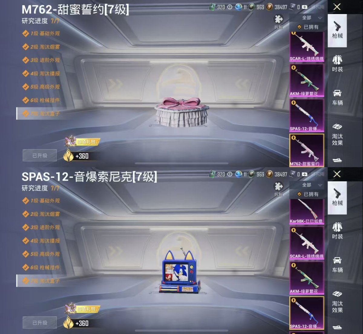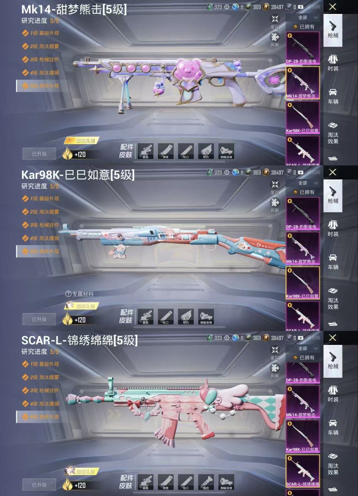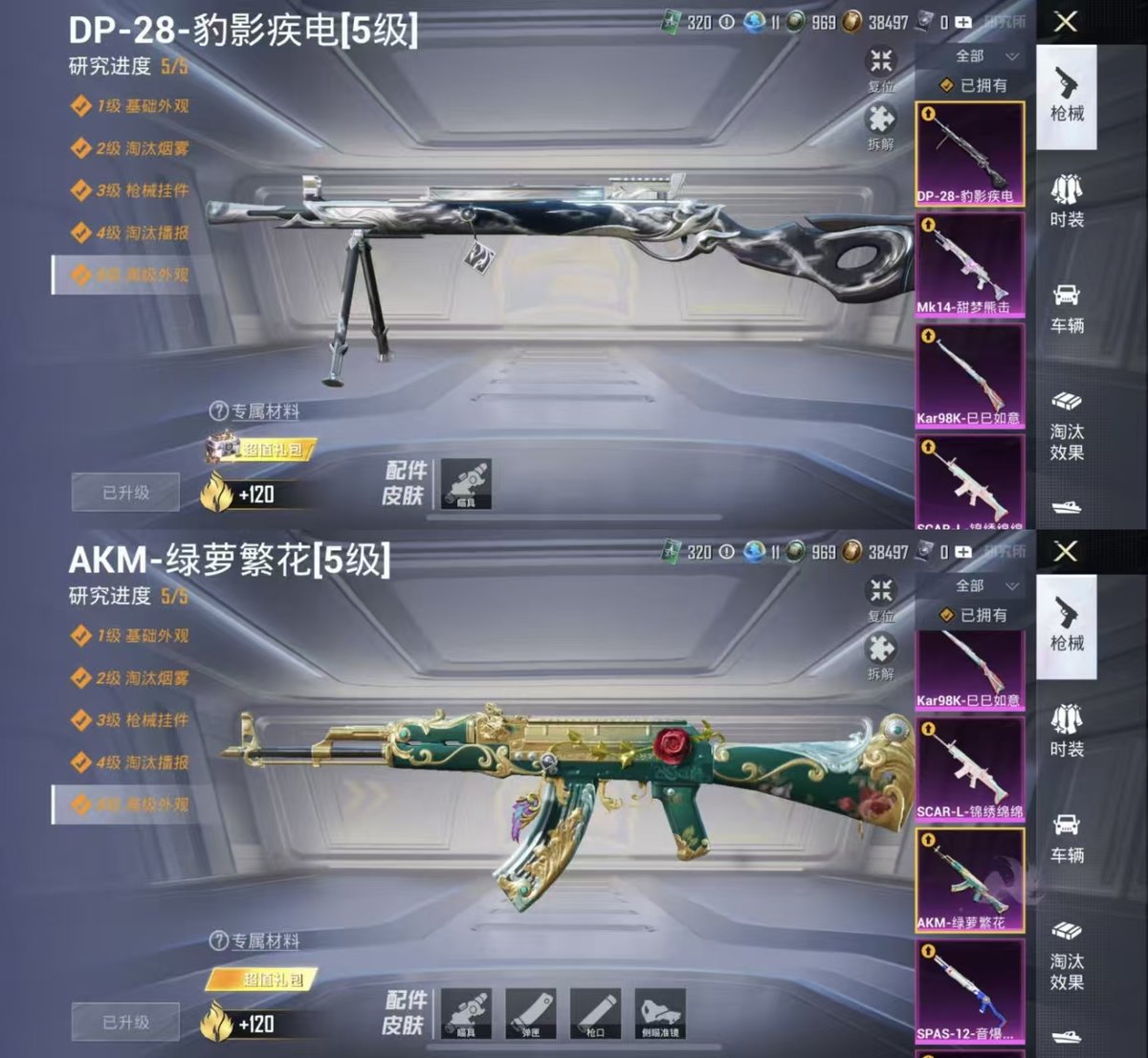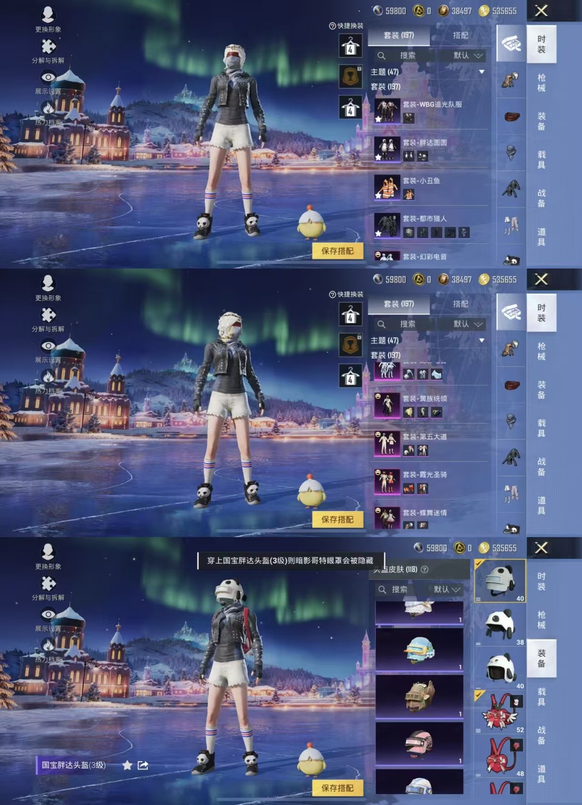 _2322736-实名:可修改时装数:759载具数:1呛械数:255战备数:185热门装扮:蝶舞迷情呆萌铁蟹鹰眼刺客都市猎人霞光圣骑潮萌小黄鸭胖达圆圆第五大道黄族统领幻彩电音载具:辉羽雀灵自行车稀有呛皮:m762甜蜜誓约spas-12音爆索尼克akm绿萝繁花scar-l-锦绣绵绵kar98k-巳巳如意mk14-甜梦熊击dp-28-豹影疾电