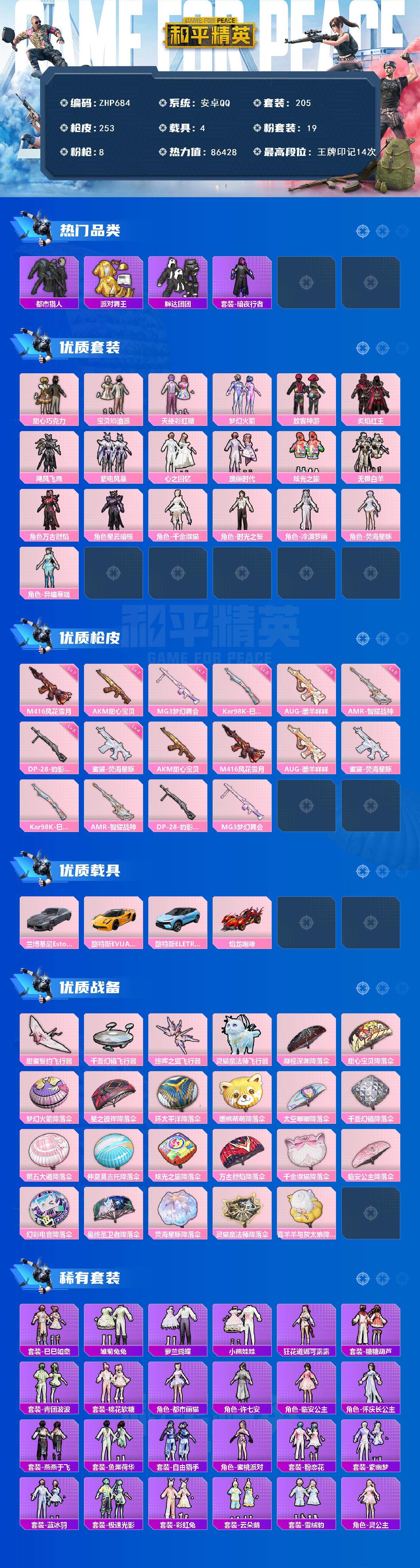 三姐妹!都市金鞋!安卓 手q-19粉装-8特效呛-4载具-5粉色飞行器-86428热力值-14王牌印记-205套装-253呛皮 【热门品类】:粉装-梦幻火箭,套装-浪漫天命,套装-都市猎人,套装-派对舞王,套装-深海小丑鱼,套装-胖达团团,套装-暗夜行者,套装-龟仙人,套装-暗影哥特,套装-粉红小猪 【粉色套装】:粉装-甜心巧克力,粉装-宝贝奶油派,粉装-天使彩虹糖,粉装-梦幻火箭,粉装-放客神游,粉装-炙焰红王,粉装-飓风飞鹰,粉装-紫电风暴,粉装-心之回忆,粉装-瑰丽时代,粉装-炫光之旅,粉装-无畏白羊,角色-万古烈焰,角色-星云暗核,角色-千金淑猫,角色-时光之誓,角色-冷漠罗丽,角色-荧海星豚,角色-异瞳寒姬 【粉色呛皮等级】:akm-甜心宝贝七级,m416-风花雪月七级,aug-暖羊咩咩五级,蜜獾-荧海星豚四级,kar98k-巳巳如意五级,amr-智耀战神五级,dp-28-豹影疾电五级,mg3-梦幻舞会七级 【粉色载具】:兰博基尼estoque(银翼灰),路特斯evija(星际黄),路特斯eletre(冰川蓝),焰龙咆哮 【粉色呛皮】:akm-甜心宝贝,m416-风花雪月,aug-暖羊咩咩,蜜獾-荧海星豚,kar98k-巳巳如意,amr-智耀战神,dp-28-豹影疾电,mg3-梦幻舞会 【粉色飞行器】:甜蜜誓约飞行器,千面幻镜飞行器,终晖之翼飞行器,灵猫魔法师飞行器 【粉色降落伞】:凝视深渊降落伞,甜心宝贝降落伞,梦幻火箭降落伞,星之彼岸降落伞,环太平洋降落伞,暖熊萌萌降落伞,太空嘟嘟降落伞,千面幻镜降落伞,第五大道降落伞,仲夏莫吉托降落伞,炫光之旅降落伞,万古烈焰降落伞,千金淑猫降落伞,临安公主降落伞,幻彩电音降落伞,最终圣卫者降落伞,荧海星豚降落伞,灵猫魔法师降落伞,喜羊羊与灰太狼降落伞 【稀有套装】:套装-龟仙人,套装-巳巳如意,套装-雏菊兔兔,套装-萝兰蝴蝶,套装-小熊娃娃,角色-狂花道·娜可露露,套装-糖糖葫芦,套装-青团波波,套装-棉花软糖,角色-都市丽猫,角色-许七安,角色-临安公主,角色-怀庆长公主,套装-燕燕于飞,套装-鱼渊荷华,套装-自由猎手,角色-蜜桃派对,套装-粉恋花,套装-紫幽梦,套装-蓝冰羽,套装-极速光影,套装-彩虹兔,套装-云朵鹅,套装-雪绒豹,角色-灵公主,套装-蜜露汐语,套装-蓝海鲸歌,套装-朱霞炽焰,套装-凌霄紫焰,套装-擎苍青焰,玩偶服-懒羊羊,角色-紫俏灵猫,套装-炫彩糖果 【稀有呛皮】:aug-冰晶雪宝,akm-四圣焕新,akm-小鹦鹉bebe,akm-彩虹符号,akm-影袭,akm-环太平洋,akm-破晓战魂,akm-缤纷海域,akm-龙的传人,akm-灵猫魔法师,akm-极光猎影,m16a4-凝视深渊,m16a4-幻世战舞者,m16a4-甜心亚梦,m16a4-最终圣卫者,scar-l-夜灯,scar-l-炫彩节奏,scar-l-玉兔迎春,scar-l-甜蜜誓约,scar-l-红色方程式,m416-彩虹嘻嘻猴,m416-暗夜行者,m416-潮汐统领,m416-糯团青竹,m416-绯红前夜,m416-蓝色火焰,m416-黄金狮王,groza-彩虹符号,groza-影袭,groza-懵萌河马,groza-春暖花开,groza-田园牧歌,groza-青春物语,groza-荧海星豚,aug-天降萌叽,aug-甜蜜菠萝,aug-耀粉歌者,q-潮汐统领,q-飞驰魅影,q-魔药课室,m762-天降萌叽,m762-暖熊萌萌,m762-甜心宝贝,m762-云朵鹅,mk47-妙红点点,g36c-懵萌河马,ac-val-天降萌叽,ac-val-甜心亚梦,ac-val-闲梦青缨,蜜獾-天降萌叽,蜜獾-娇憨猪猪,arx-凌霄紫焰,uzi-娇憨猪猪,uzi-影袭,uzi-金玉无双,ump45-仲夏莫吉托,ump45-夜灯,ump45-涂山之恋,ump45-生命誓言,ump45-金玉无双,vect-田园牧歌,vect-音爆索尼克,汤姆逊-天降萌叽,汤姆逊-炫彩节奏,汤姆逊-灵猫魔法师,mp5k-甜蜜誓约,mp5k-自由猎手,js9-凌霄紫焰,p90-飞驰魅影,p90-魔法小松鼠,p90-巳巳如意,kar98k-影袭,kar98k-梦幻火箭,kar98k-炫彩节奏,kar98k-飞驰魅影,m24-影袭,m24-炫彩节奏,m24-幻彩电音,awm-恐龙拽拽,sks-糯团青竹,vss-星之彼岸,vss-田园牧歌,mini14-梦幻火箭,mk14-童趣迷兔,slr-娇憨猪猪,slr-彩虹符号,莫辛纳甘-懵萌河马,amr-妙红点点,amr-暗夜行者,amr-喜羊羊与灰太狼,m417-惊鸿侠骨,m200-仲夏莫吉托,m200-惊鸿侠骨,svd-云朵鹅,svd-自由猎手,svd-冷漠罗丽,s686-彩虹符号,s686-生命誓言,s686-巳巳如意,s1897-小鹦鹉bebe,s1897-炫彩节奏,s1897-飞驰魅影,s1897-荧海星豚,s12k-玩趣呆呆,s12k-垂柳戏鸭,s12k-夜灯,s12k-娇憨猪猪,s12k-幻世战舞者,s12k-智耀战神,s12k-极意拳锋,dbs-甜心亚梦,dbs-荧海星豚,spas-12-田园牧歌,spas-12-云朵鹅,m249-冷魅冰骑,m249-妙红点点,m249-彩虹符号,m249-星之彼岸,m249-月影鸳鸯,m249-糯团青竹,dp-28-古战神甲,dp-28-甜心亚梦,dp-28-甜心宝贝,mg3-妙红点点,mg3-幻世战舞者,mg3-惊鸿侠骨,pkm-懵萌河马,mg-36-凌霄紫焰,p92-凌霄紫焰,r45-幻彩电音,短管霰弹-竹节火铳,短管霰弹-星穹咏叹调,沙墨之鹦-云朵鹅,爆炸猎弓-惊鸿侠骨,爆炸猎弓-虚空骇客,爆炸猎弓-喜羊羊与灰太狼,大砍刀-云朵鹅,大砍刀-黑金刀,大砍刀-咒蚀之裁,撬棍-灵猫魔法师,平底锅-凌霄紫焰,破片手留单-巳巳如意 【其他套装】:套装-ss19特训,套装-ss20特训,套装-ss21特训,套装-ss22特训,套装-ss23特训,套装-ss24特训,套装-ss25特训,套装-ss26特训,套装-ss27特训,套装-ss28特训,套装-ss29特训,套装-光之冒险,套装-六六大吉,套装-军械专家,套装-冷焰舞者,套装-夏日倾情,套装-完美偶像,套装-幻世保卫者,套装-幻世战舞者,套装-幻影武者,套装-战地督导,套装-探宝勇士,套装-旭日情侣,套装-暗影哥特,套装-极速红龙,套装-柠萌假日,套装-森林游猎者,套装-沙漠兵团,套装-浪漫天命,套装-海岛探路者,套装-涂山之恋,套装-湖蓝色名流,套装-滨海厨神,套装-炫蓝之夏,套装-牛气冲天,套装-牛气满满,套装-特战装甲,套装-特殊使命,套装-特训学院,套装-狂战萌兔,套装-狂沙