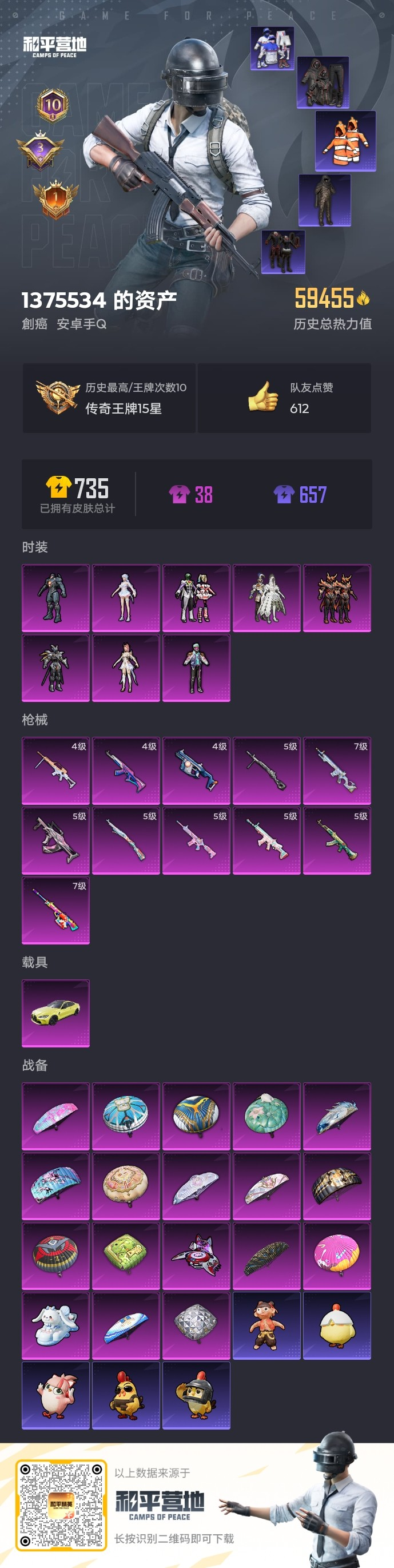 【和平精英】【lyhp18447】8粉装,11特效呛,1载具,历史最高段位:传奇王牌15星 王牌印记10次 热力值:59455,146套装,197呛械,236装备,130战备;套装:套装-彗云及圣,套装-冰霜白皇,套装-飓风飞鹰,角色-复仇流浪者,套装-赤焰黑爵,套装-灵感创作师,角色-圣堂之誓,角色-荧海星豚,套装-特训学院,套装-青年教官,套装-蓝色运动,套装-黄色伏地魔,套装-白色伏地魔,套装-黑色伏地魔,套装-竞技名士,套装-长空猛禽,套装-黎明保卫者,套装-海岛探路者,套装-雨林探路者,套装-旭日情侣,套装-浪漫天命,套装-特战装甲,套装-贵族骑装,套装-战地督导,套装-活力之心,套装-春日漫步,套装-燃烧卡路里,套装-冷酷挑战者,套装-完美偶像,套装-人气偶像,套装-幻影武者,套装-魅力单车,套装-雪山征服者,套装-竞技达人朋克,套装-狂沙舞者,套装-极地朋克,套装-摩艾涂鸦,套装-奇趣章鱼,套装-清新柠檬,套装-暗影哥特,套装-弄潮海豚,套装-生化防暴队,套装-夏日倾情,套装-缤纷果语,套装-滨海厨神,套装-alan walker,套装-风暴特警,套装-冰川特警,套装-雷霆特警,套装-元素星魂,套装-麻辣教官,套装-暗夜之虎,套装-小丑鱼,套装-破蛋小黄鸡,套装-疯狂小兔子,套装-鹤鸣,套装-霓虹街区,套装-白熊同盟,套装-隐空刺,套装-白糯汤圆,套装-战术大师,套装-牛气冲天,套装-耀粉歌者,套装-飞行日记,套装-天籁歌者,套装-吉莉礼服,套装-快乐星愿,角色-英勇保护者,套装-团圆交子,套装-虎虎生威吉莉,角色-军刀雅典娜,套装-粉团憨憨,套装-ss21特训,套装-萌趣咩咩,套装-娇憨猪猪,套装-玉兔迎春,套装-ss22特训,套装-光之冒险,套装-绯格组合,套装-王牌教练,套装-青玉碎影,套装-ss24特训,套装-花园小羊咩,套装-龟仙人,套装-ss25特训,套装-惊鸿侠骨,套装-锦衣飞扬,套装-绝对偶像,套装-龙的传人,套装-ss26特训,套装-漫游都市,套装-空岛之星,套装-无暇誓言,套装-云魄琉璃,套装-焰鹰斗篷,套装-幽夜迷踪,套装-幻羽潜行,套装-ss27特训,套装-恋语绒绒,套装-老实芭蕉,套装-ss28特训,角色-蝶吟花词,角色-银尘,套装-街头风暴,套装-海盐绵绵冰,套装-航行童话,套装-蝶变,套装-ss29特训,角色-绯色魅影,角色-紫俏灵猫,角色-无面战甲,套装-异域银装,套装-星途旅人,套装-ss30特训,套装-青团波波,套装-棉花软糖,套装-糖糖葫芦,套装-夜幕侵蚀,套装-纯白跃动,套装-绿洲跃动,套装-荧光绘影,套装-ss31特训,套装-鱼渊荷华,套装-燕燕于飞,套装-智谋强哥,套装-紫幽梦,套装-粉恋花,套装-ss33特训,套装-云朵鹅,套装-巳巳如意,套装-ss32特训,套装-彩虹兔,套装-蓝冰羽,套装-雪绒豹,套装-大橘大利,套装-蓝海鲸歌,套装-元气之梦,套装-ss34特训,套装-朱霞炽焰,套装-游乐,套装-凌霄紫焰,套装-薄荷星砂,套装-ss35特训,套装-午间小调,套装-风迹短诗,套装-ss36特训;呛皮:5级m416-电玩时刻,m416-蓝色火焰,m416-红色方程式,m416-糯团青竹,蜜獾-娇憨猪猪,蜜獾-天降萌叽,蜜獾-精灵梦叶罗丽,蜜獾-糖糖葫芦,蜜獾-风迹短诗,蜜獾-绿洲时空,蜜獾-乌木金纹,ac-val-乌木金纹,ac-val-天降萌叽,ac-val-牡丹亭·游园,mk47-乌木金纹,mk47-风迹短诗,4级akm-梦之光华,5级akm-绿萝繁花,akm-霓虹街区,akm-环太平洋,akm-墨染幽兰,akm-2p战斗服款,akm-龙的传人,akm-绿洲时空,aug-耀粉歌者,aug-青春冒险家,aug-异域银装,5级scar-l-锦绣绵绵,scar-l-红色方程式,scar-l-夜灯,scar-l-炫彩节奏,scar-l-玉兔迎春,scar-l-粉锦千层,scar-l-海盐豹豹,5级groza-镜光银凌,groza-影袭,groza-恐龙拽拽,groza-无面战甲,ace32-蓝晶绮麟,m16a4-幻世战舞者,m16a4-荧光绘影,famas-璀璨流光,famas-乌木金纹,m762-彩虹符号,m762-墨金战记,m762-云朵鹅,arx-凌霄紫焰,g36c-六号树人,m24-拂晓神骑,m24-鱼跃突击斗鱼,m24-快狙起手快手,m24-抖狙瞬镜抖音,m24-次元破裂哔哩哔哩,m200-惊鸿侠骨,m200-乌木金纹,7级amr-炫光之旅,amr-镜光幻境,amr-乌木金纹,5级kar98k-巳巳如意,kar98k-红色方程式,kar98k-彩虹符号,kar98k-洛神天依,win94-乌木金纹,莫辛纳甘-风迹短诗,awm-雷霆特警,awm-天降萌叽,awm-焰鹰斗篷,svd-云朵鹅,mk14-冰河战士,mk14-紫幽梦,mk14-薄荷星砂,slr-娇憨猪猪,vss-星之彼岸,vss-彩虹符号,m417-惊鸿侠骨,m417-玩趣呆呆,m417-绿洲跃动,sks-炫彩节奏,sks-未来歌姬,sks-棋盘冕主,sks-青瓷战姬,7级mk12-雪月幻音,mk12-风迹短诗,mk12-乌木金纹,mini14-穿刺龙虾,mini14-耀粉歌者,mini14-香桃花海,mini14-鸡智如我,mk20-h-糖糖葫芦,mk20-h-乌木金纹,qbu-夜幕侵蚀,mp5k-乌木金纹,ump45-夜灯,ump45-生命誓言,ump45-诡娃娃,ump45-海盐豹豹,ump45-糖糖葫芦,ump45-绒宝小鹅,ump45-夜幕侵蚀,ump45-极意拳锋,p90-倾城蜜语,p90-玩趣呆呆,p90-荧光绘影,p90-巳巳如意,p90-乌木金纹,uzi-红色方程式,uzi-幻影战神,uzi-娇憨猪猪,uzi-天降萌叽,uzi-绝色倾城,uzi-啾咪啾咪,uzi-绿洲时空,js9-凌霄紫焰,4级vect-环太平洋,vect-生命誓言,vect-彩虹符号,vect-焰鹰斗篷,vect-燕燕于飞,汤姆逊-诡面斩,汤姆逊-耀粉歌者,汤姆逊-炫彩节奏,汤姆逊-古战神甲,汤姆逊-环太平洋,汤姆逊-天降萌叽,野牛-燕燕于飞,aks-74u-鸡智如我,aks-74u-乌木金纹,spas-12-燕燕于飞,spas-12-云朵鹅,spas-12-乌木金纹,s686-生命誓言,s686-巳巳如意,s1897-炫彩节奏,s1897-精灵梦叶罗丽,s1897-紫幽梦,s1897-糯团青竹,s12k-夜灯,s12k-娇憨猪猪,s12k-玩趣呆呆,aa12-g-星空武士,dbs-彩虹符号,dbs-圣堂之誓,dbs-焰鹰斗篷,dbs-幻彩电音,dbs-荧海星豚,dbs-风迹短诗,dbs-乌木金纹,5级dp-28-豹影疾电,dp-28-彩虹符号,dp-28-焰鹰斗篷,dp-28-alan walker潮音版,mg3-幻世战舞者,mg3-乌木金纹,