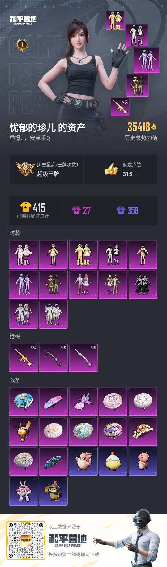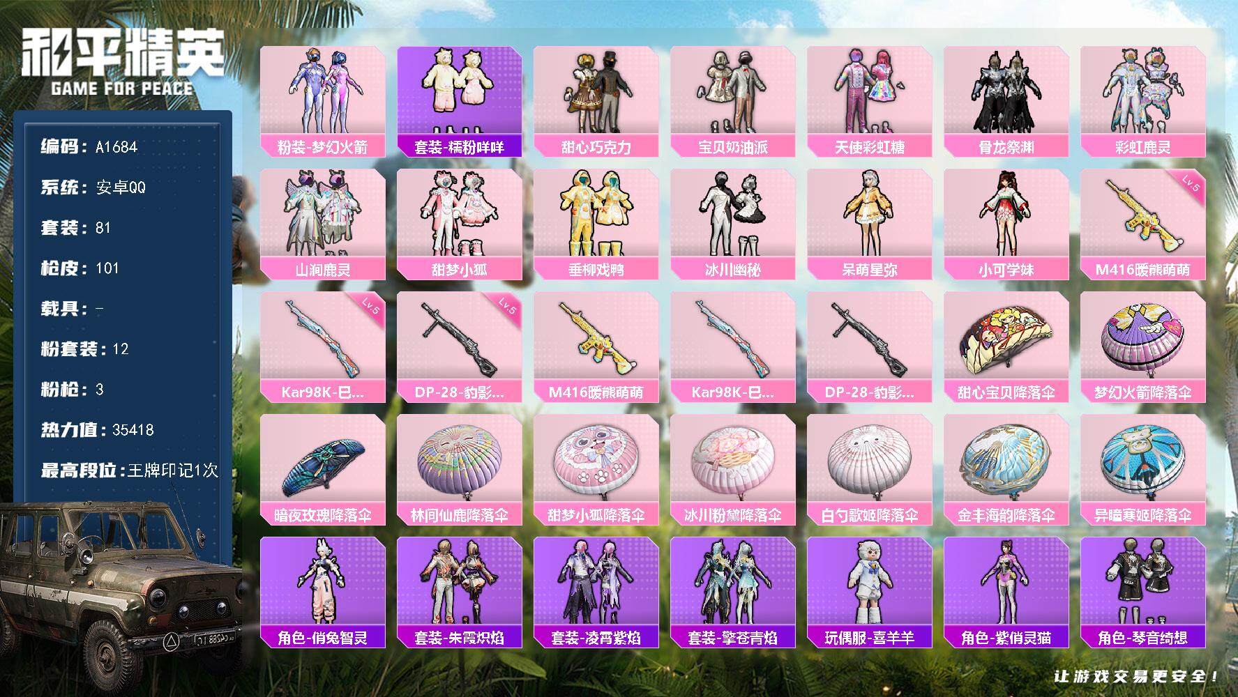 [14876412]安卓【公主号 粉装-甜心巧克力,粉装-宝贝奶油派,粉装-天使彩虹糖,粉装-梦幻火箭,粉装-骨龙祭渊,粉装-彩虹鹿灵 m416-暖熊萌萌五级,kar98k-巳巳如意五级,dp-28-豹影疾电五级 】 手q-12粉装-3特效呛-0载具-2粉色飞行器-35418热力值-1王牌印记-81套装-101呛皮 【热门品类】:粉装-梦幻火箭,套装-糯粉咩咩 【粉色套装】:粉装-甜心巧克力,粉装-宝贝奶油派,粉装-天使彩虹糖,粉装-梦幻火箭,粉装-骨龙祭渊,粉装-彩虹鹿灵,粉装-山涧鹿灵,粉装-甜梦小狐,粉装-垂柳戏鸭,粉装-冰川幽秘,角色-呆萌星弥,角色-小可学妹 【粉色呛皮等级】:m416-暖熊萌萌五级,kar98k-巳巳如意五级,dp-28-豹影疾电五级 【粉色呛皮】:m416-暖熊萌萌,kar98k-巳巳如意,dp-28-豹影疾电 【粉色降落伞】:甜心宝贝降落伞,梦幻火箭降落伞,暗夜玫瑰降落伞,林间仙鹿降落伞,甜梦小狐降落伞,冰川粉黛降落伞,白勺歌姬降落伞,金丰海韵降落伞,异瞳寒姬降落伞 【稀有套装】:套装-雪国风尚,角色-俏兔智灵,套装-朱霞炽焰,套装-凌霄紫焰,套装-擎苍青焰,玩偶服-喜羊羊,角色-紫俏灵猫,套装-琴音绮想,套装-炫彩糖果 【稀有呛皮】:akm-生命誓言,akm-破晓战魂,m16a4-幻世战舞者,scar-l-扶摇飞仙,scar-l-暗夜玫瑰,scar-l-炫彩节奏,scar-l-玉兔迎春,scar-l-甜蜜誓约,m416-糯团青竹,m416-红色方程式,m416-蓝色火焰,groza-林间仙鹿,aug-冰川粉黛,m762-牛气冲天,m762-瑞龙福将,m762-甜心宝贝,m762-第五大道,mk47-林间仙鹿,g36c-暗夜玫瑰,ace32-画境星梦,arx-凌霄紫焰,uzi-炫彩节奏,ump45-夜灯,ump45-蓝色火焰,vect-暗夜玫瑰,vect-生命誓言,汤姆逊-天降萌叽,汤姆逊-林间仙鹿,汤姆逊-甜梦小狐,mp5k-焰龙焚天,mp5k-甜蜜誓约,mp5k-画境星梦,js9-凌霄紫焰,kar98k-彩虹符号,kar98k-梦幻火箭,sks-炫彩节奏,mini14-林间仙鹿,win94-瑞龙福将,m1加兰德-画境星梦,s686-生命誓言,s686-白勺歌姬,s12k-瑞龙福将,s12k-幻世战舞者,dbs-第五