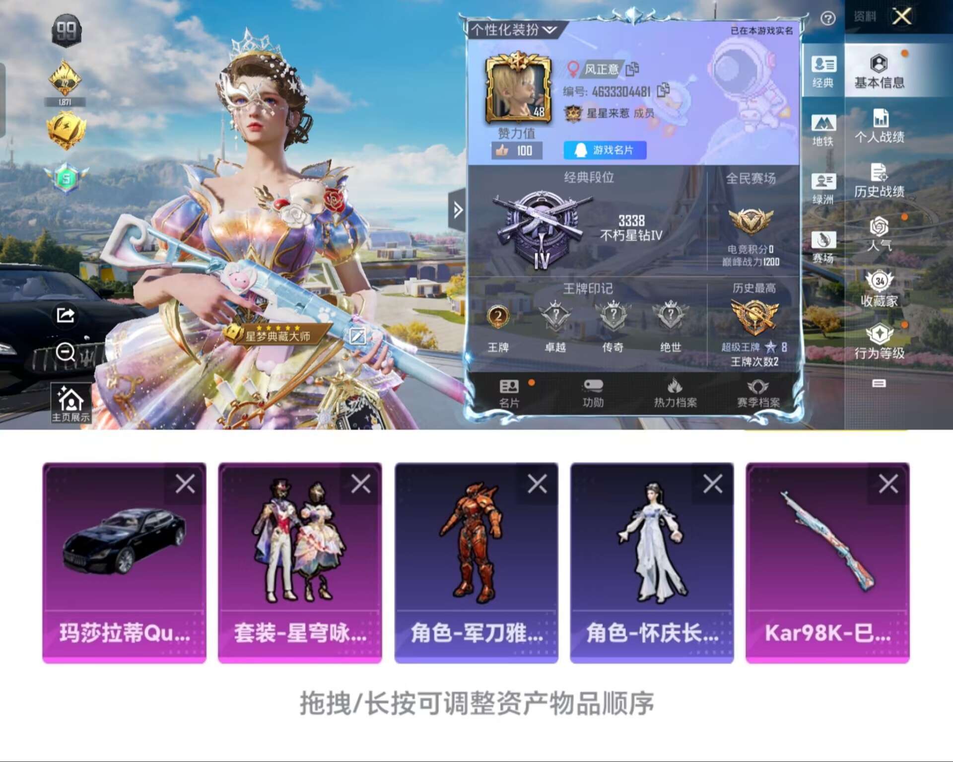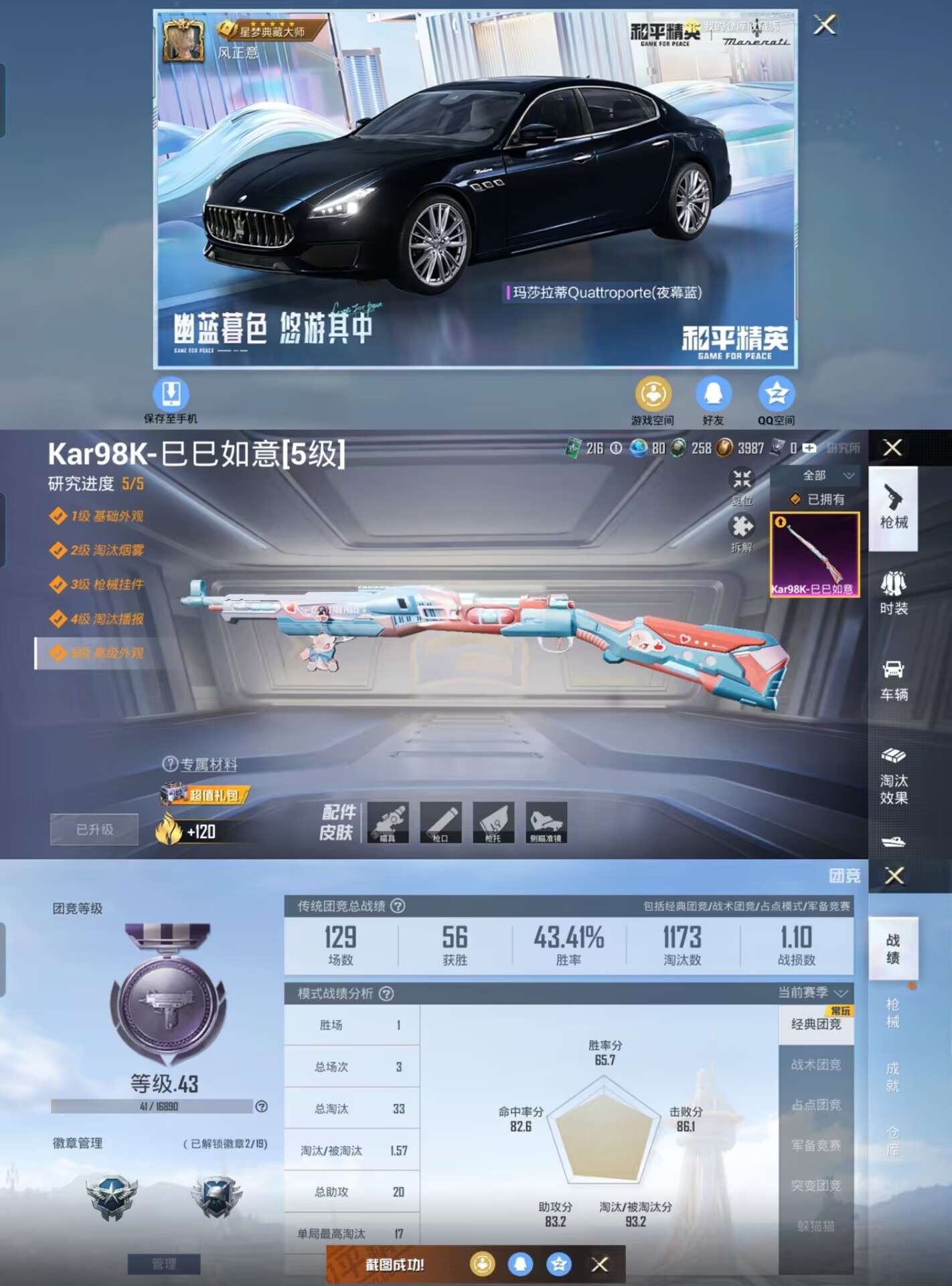 t251身法素材-地铁天赋24点-1载具1粉装-1特效呛-22461热力值-2王牌印记q14级-63套装-75呛皮【优质载具皮肤】 玛莎拉蒂quattropte夜幕蓝【特效呛等级】:kar98k-巳巳如意五级kar98k-巳巳如意【优质武器皮肤】: kar98k-巳巳如意【稀有武器皮肤】: kar98k-巳巳如意 pkm-紫幽梦 mk14-紫幽梦 蜜獾-乌木金纹