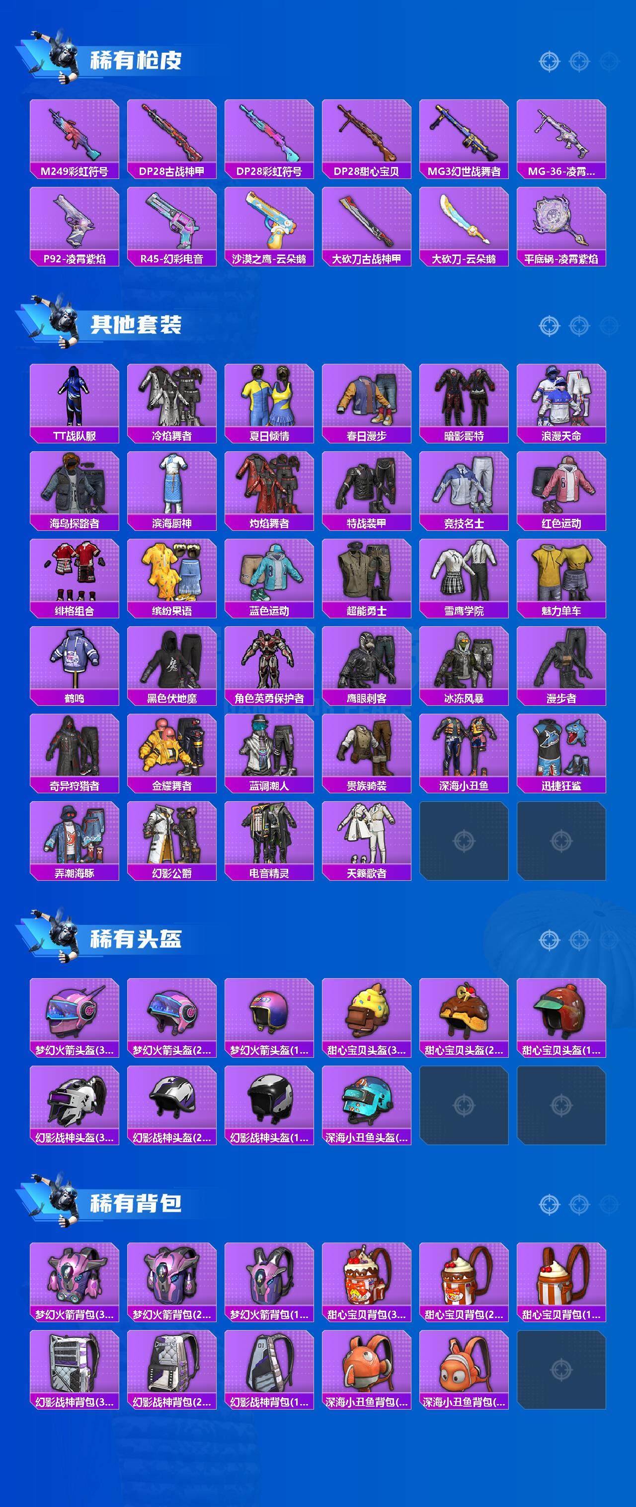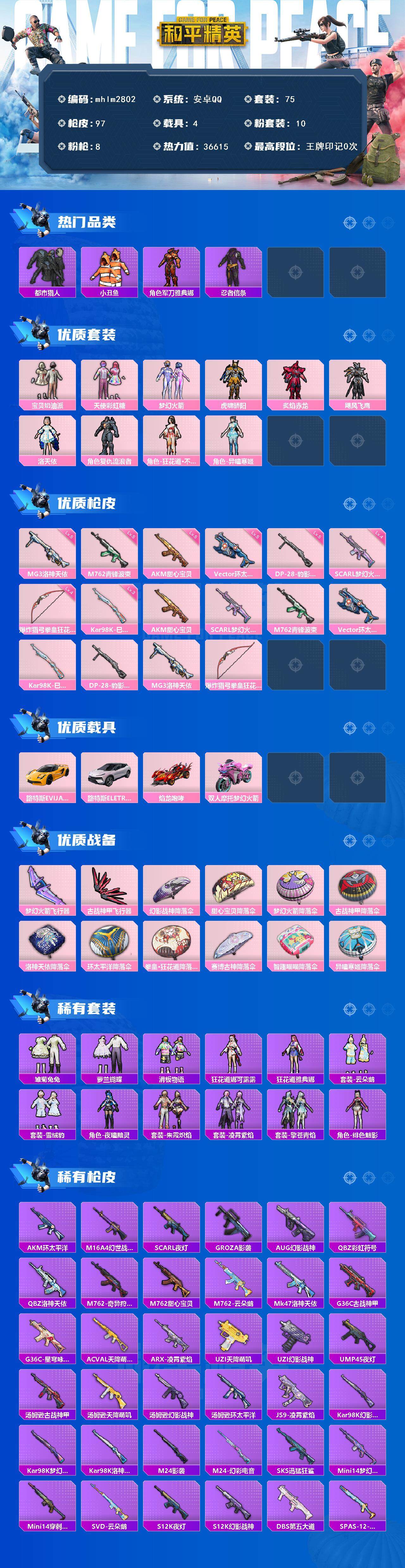 [14886941]【mhlm2802】安卓 手q-10粉装-8特效呛-4载具-3粉色飞行器-36615热力值-1王牌印记-75套装-97呛皮 【热门品类】:粉装-梦幻火箭,套装-浪漫天命,套装-都市猎人,套装-深海小丑鱼,套装-小丑鱼,套装-奇异狩猎者,角色-军刀雅典娜,套装-忍者信条,套装-暗影哥特 【粉色套装】:粉装-宝贝奶油派,粉装-天使彩虹糖,粉装-梦幻火箭,粉装-虎啸骄阳,粉装-炙焰赤龙,粉装-飓风飞鹰,角色-洛天依,角色-复仇流浪者,角色-狂花道·不知火舞,角色-异瞳寒姬 【粉色呛皮等级】:akm-甜心宝贝五级,scar-l-梦幻火箭四级,m762-青锋波束五级,vect-环太平洋五级,kar98k-巳巳如意三级,dp-28-豹影疾电五级,mg3-洛神天依五级,爆炸猎弓-拳皇·狂花道四级 【粉色载具】:路特斯evija(星际黄),路特斯eletre(花绽灰),焰龙咆哮,双人摩托-梦幻火箭 【粉色呛皮】:akm-甜心宝贝,scar-l-梦幻火箭,m762-青锋波束,vect-环太平洋,kar98k-巳巳如意,dp-28-豹影疾电,mg3-洛神天依,爆炸猎弓-拳皇·狂花道 【粉色飞行器】:梦幻火箭飞行器,古战神甲飞行器 【粉色降落伞】:幻影战神降落伞,甜心宝贝降落伞,梦幻火箭降落伞,古战神甲降落伞,洛神天依降落伞,环太平洋降落伞,拳皇·狂花道降落伞,赛博古神降落伞,智趣喵喵降落伞,异瞳寒姬降落伞 【稀有套装】:套装-雏菊兔兔,套装-萝兰蝴蝶,套装-滑板物语,角色-狂花道·娜可露露,角色-狂花道·雅典娜,套装-云朵鹅,套装-雪绒豹,角色-夜瞳黯灵,套装-朱霞炽焰,套装-凌霄紫焰,套装-擎苍青焰,角色-绯色魅影,套装-炫彩糖果 【稀有呛皮】:aug-冰晶雪宝,akm-环太平洋,m16a4-幻世战舞者,scar-l-夜灯,groza-影袭,aug-幻影战神,q-彩虹符号,q-洛神天依,m762-奇异狩猎者,m762-甜心宝贝,m762-云朵鹅,mk47-洛神天依,g36c-古战神甲,g36c-星穹咏叹调,ac-val-天降萌叽,arx-凌霄紫焰,uzi-天降萌叽,uzi-幻影战神,ump45-夜灯,汤姆逊-古战神甲,汤姆逊-天降萌叽,汤姆逊-幻影战神,汤姆逊-环太平洋,js9-凌霄紫焰,kar98k-幻影战神,kar98k-梦幻火箭