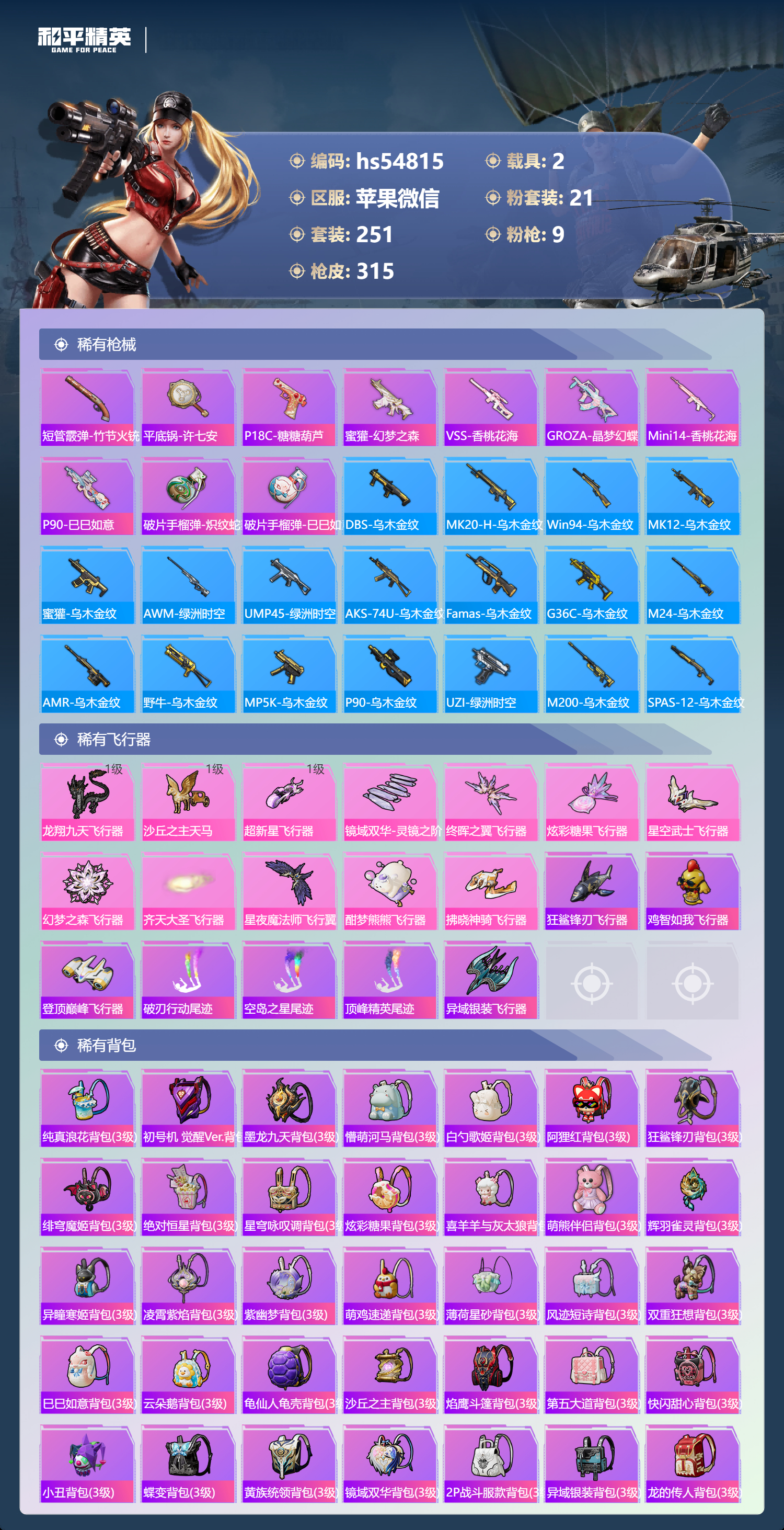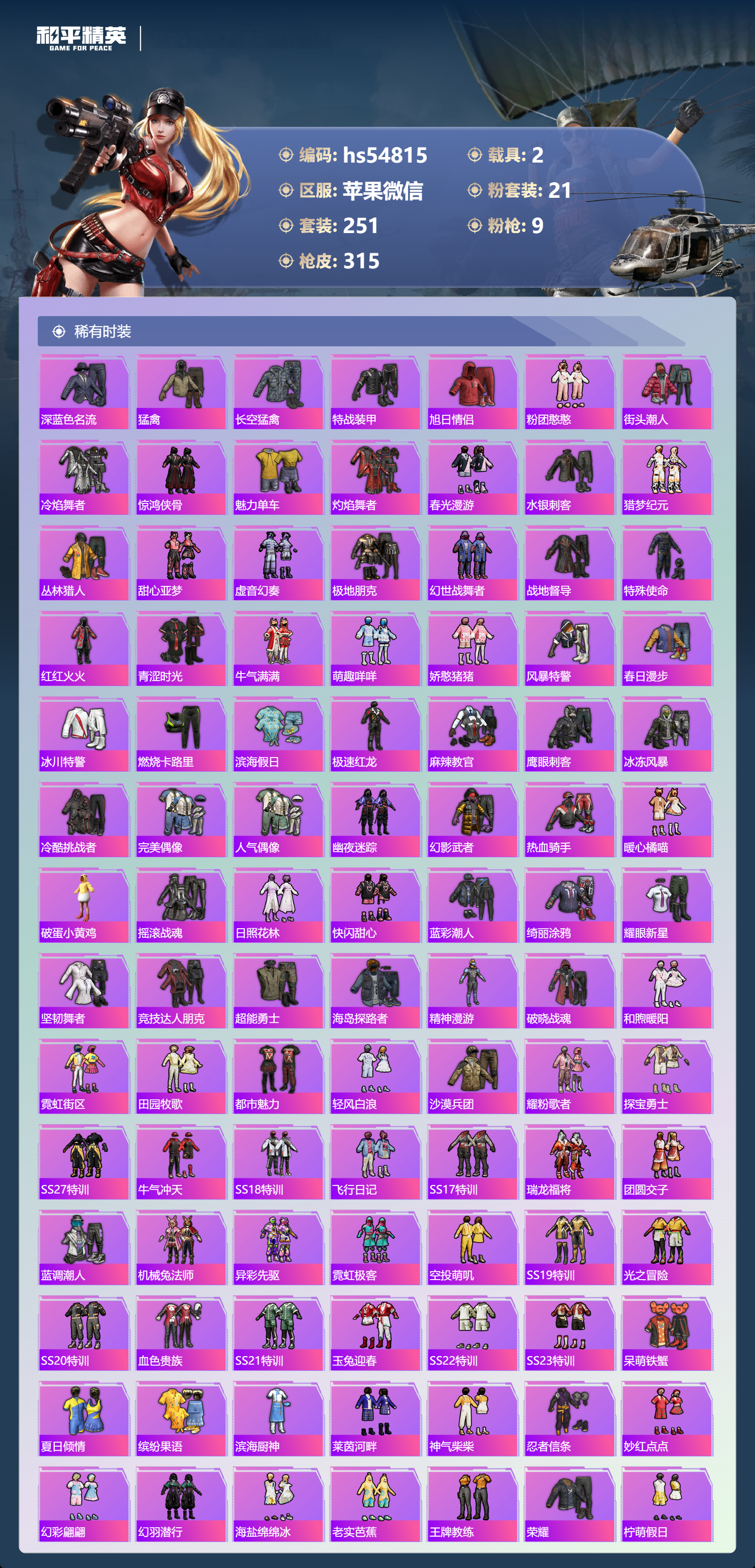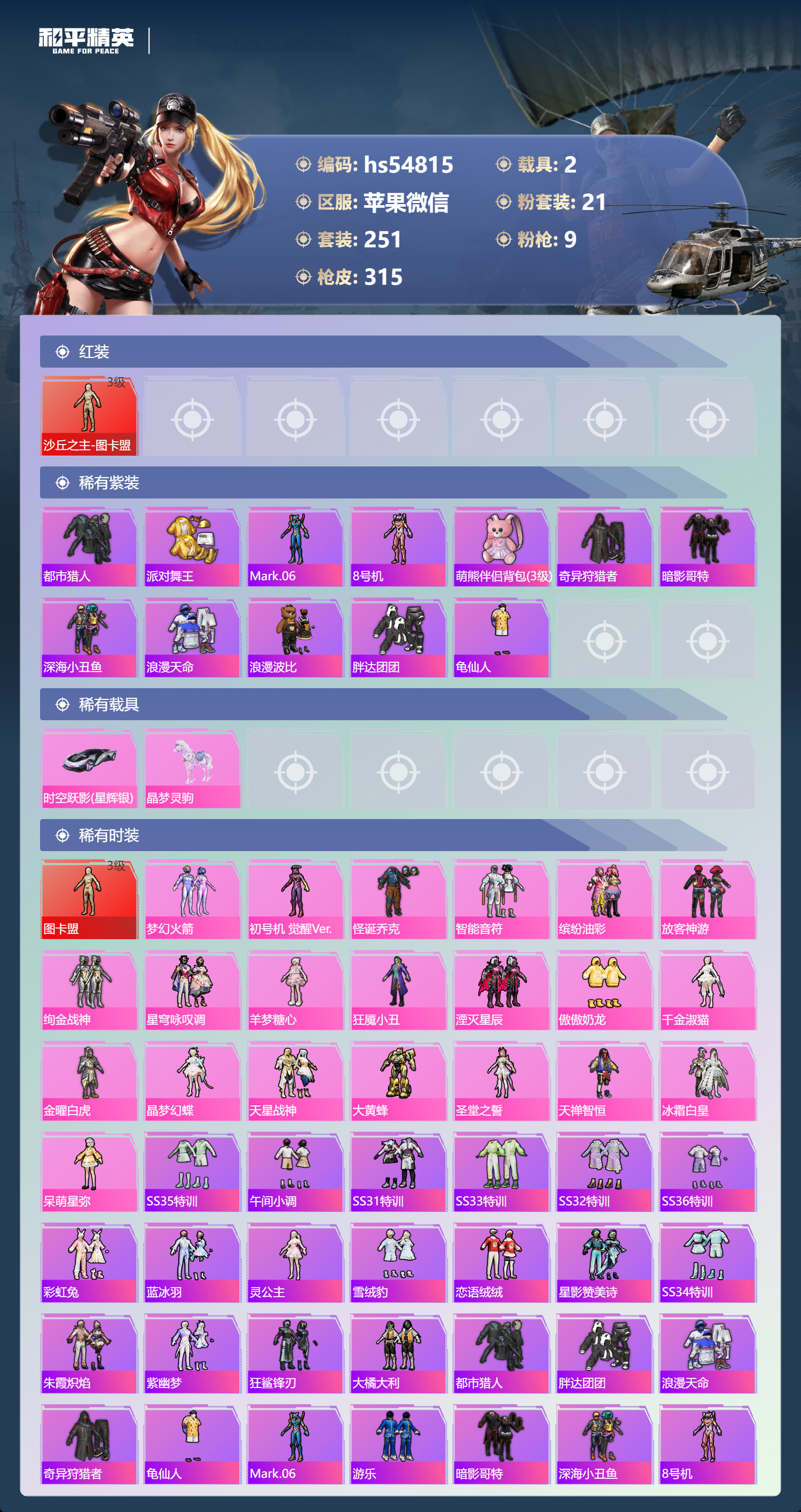 hs54815 苹果微信-20王牌印记-有战神框-1红装-21粉装-9特效呛-2载具-热力值-251套装-315呛皮-7卓越印记-2传奇印记【1红装】沙丘之主-图卡盟/3级【21粉装】套装-冰霜白皇套装-缤纷油彩角色-大黄蜂角色-狂魇小丑角色-圣堂之誓角色-千金淑猫套装-绚金战神套装-金曜白虎套装-星穹咏叹调角色-羊梦糖心套装-天禅智恒套装-梦幻火箭套装-傲