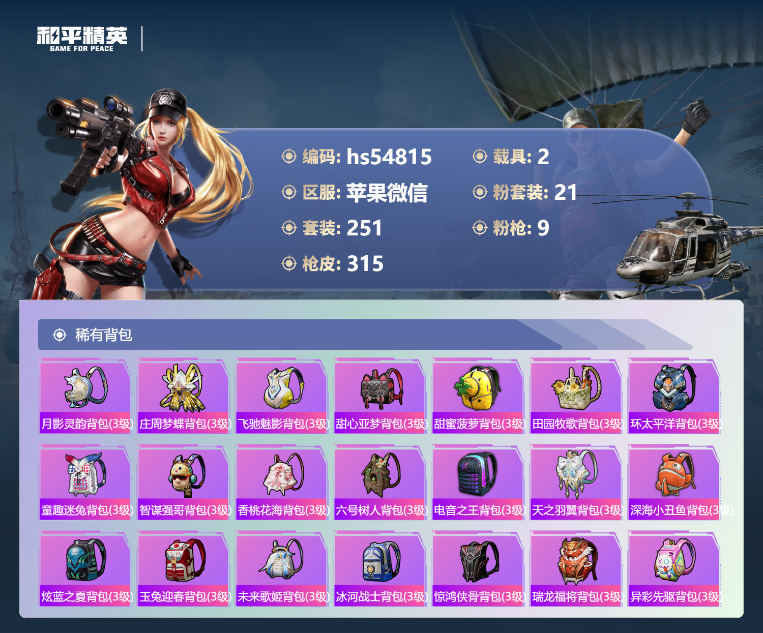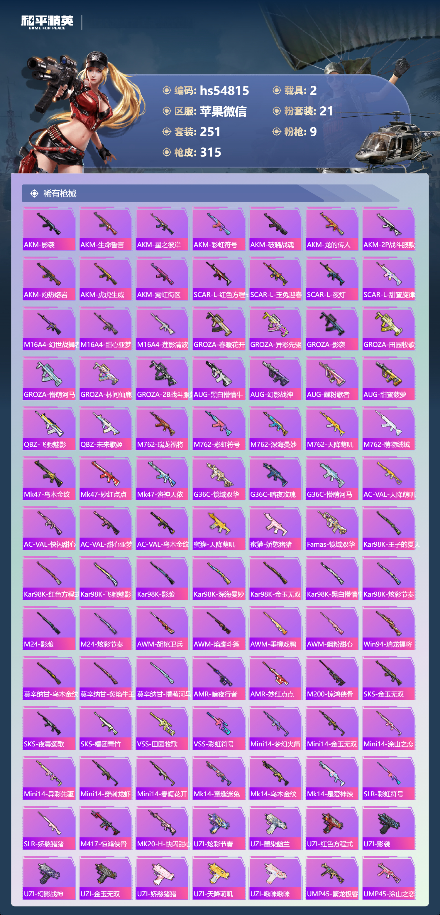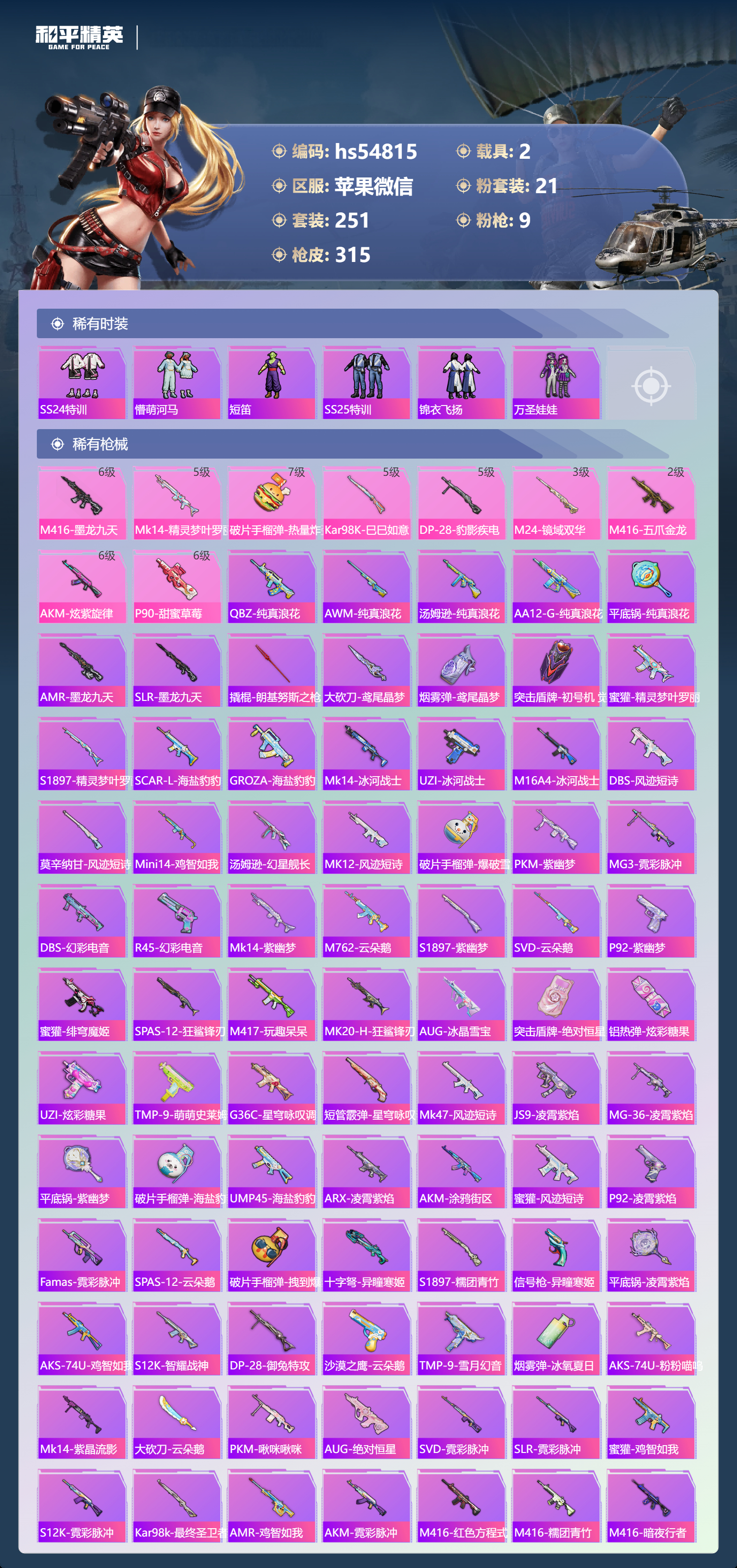 hs54815 苹果微信-20王牌印记-有战神框-1红装-21粉装-9特效呛-2载具-热力值-251套装-315呛皮-7卓越印记-2传奇印记【1红装】沙丘之主-图卡盟/3级【21粉装】套装-冰霜白皇套装-缤纷油彩角色-大黄蜂角色-狂魇小丑角色-圣堂之誓角色-千金淑猫套装-绚金战神套装-金曜白虎套装-星穹咏叹调角色-羊梦糖心套装-天禅智恒套装-梦幻火箭套装-傲