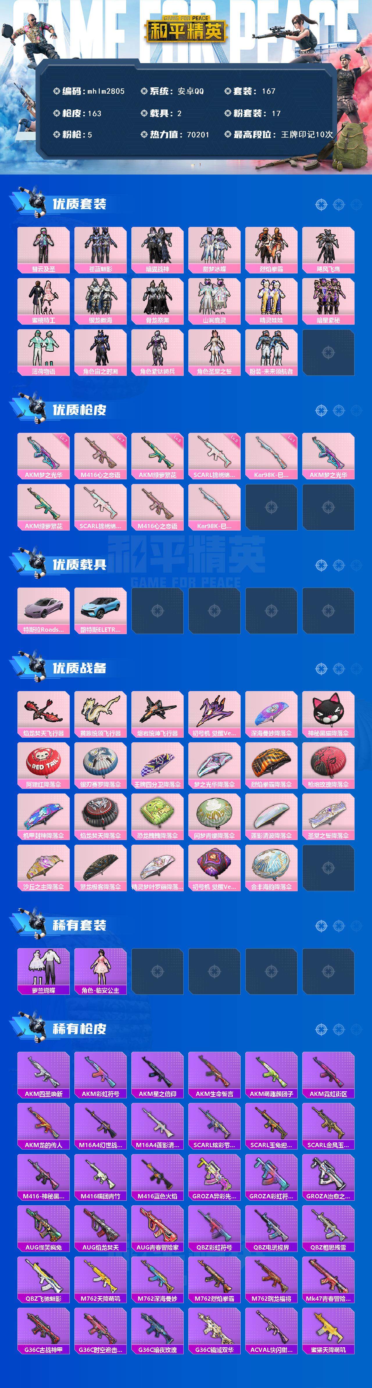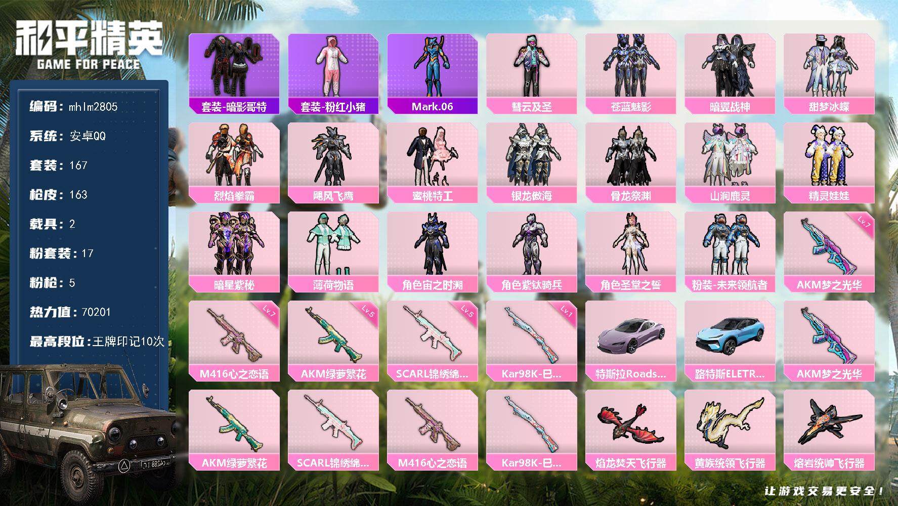 [14888414]【mhlm2805】安卓 手q-17粉装-5特效呛-2载具-4粉色飞行器-70201热力值-10王牌印记-167套装-163呛皮 【热门品类】:套装-暗影哥特,套装-粉红小猪,角色-mark.06 【粉色套装】:粉装-彗云及圣,粉装-苍蓝魅影,粉装-暗翼战神,粉装-甜梦冰蝶,粉装-烈焰拳霸,粉装-飓风飞鹰,粉装-蜜桃特工,粉装-银龙傲海,粉装-骨龙祭渊,粉装-山涧鹿灵,粉装-精灵娃娃,粉装-暗星紫秘,粉装-薄荷物语,角色-宙之时溯,角色-紫钛骑兵,角色-圣堂之誓,粉装-未来领航者 【粉色呛皮等级】:akm-梦之光华七级,akm-绿萝繁花五级,scar-l-锦绣绵绵五级,m416-心之恋语七级,kar98k-巳巳如意一级 【粉色载具】:特斯拉roadster(沁心粉),路特斯eletre(冰川蓝) 【粉色呛皮】:akm-梦之光华,akm-绿萝繁花,scar-l-锦绣绵绵,m416-心之恋语,kar98k-巳巳如意 【粉色飞行器】:焰龙焚天飞行器,黄族统领飞行器,熔岩统帅飞行器,初号机 觉醒ver.飞行器 【粉色降落伞】:深海曼妙降落伞,神秘黑猫降落伞,阿狸红降落伞,银刃赛罗降落伞,王牌四分卫降落伞,梦之光华降落伞,烈焰拳霸降落伞,呛炮玫瑰降落伞,机甲封神降落伞,焰龙焚天降落伞,恐龙拽拽降落伞,闲梦青缨降落伞,莲影清波降落伞,圣堂之誓降落伞,沙丘之主降落伞,繁龙极客降落伞,精灵梦叶罗丽降落伞,初号机 觉醒ver.降落伞,金丰海韵降落伞 【稀有套装】:套装-萝兰蝴蝶,角色-临安公主 【稀有呛皮】:akm-四圣焕新,akm-彩虹符号,akm-星之信仰,akm-生命誓言,akm-萌趣颜团子,akm-霓虹街区,akm-龙的传人,m16a4-幻世战舞者,m16a4-莲影清波,scar-l-炫彩节奏,scar-l-玉兔迎春,scar-l-金风玉露,m416-神秘黑猫,m416-糯团青竹,m416-蓝色火焰,groza-异彩先驱,groza-彩虹符号,groza-治愈之星,aug-怪笑疯兔,aug-焰龙焚天,aug-青春冒险家,q-彩虹符号,q-电玩视界,q-相思残雪,q-飞驰魅影,m762-天降萌叽,m762-深海曼妙,m762-烈焰拳霸,m762-瑞龙福将,mk47-青春冒险家,g36c-镜域双华,g36c-古战神甲,g36c-时空追击者,g