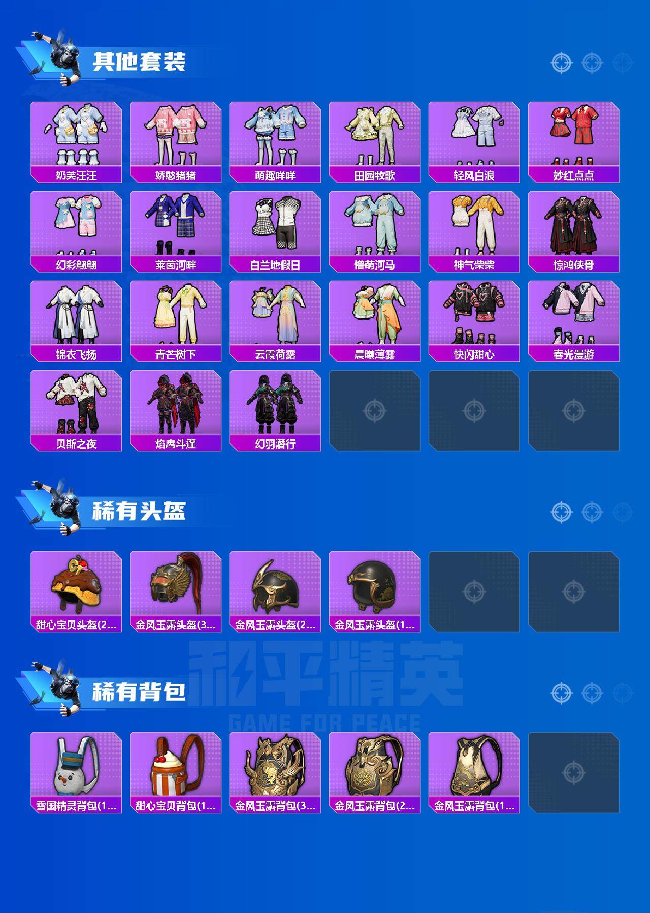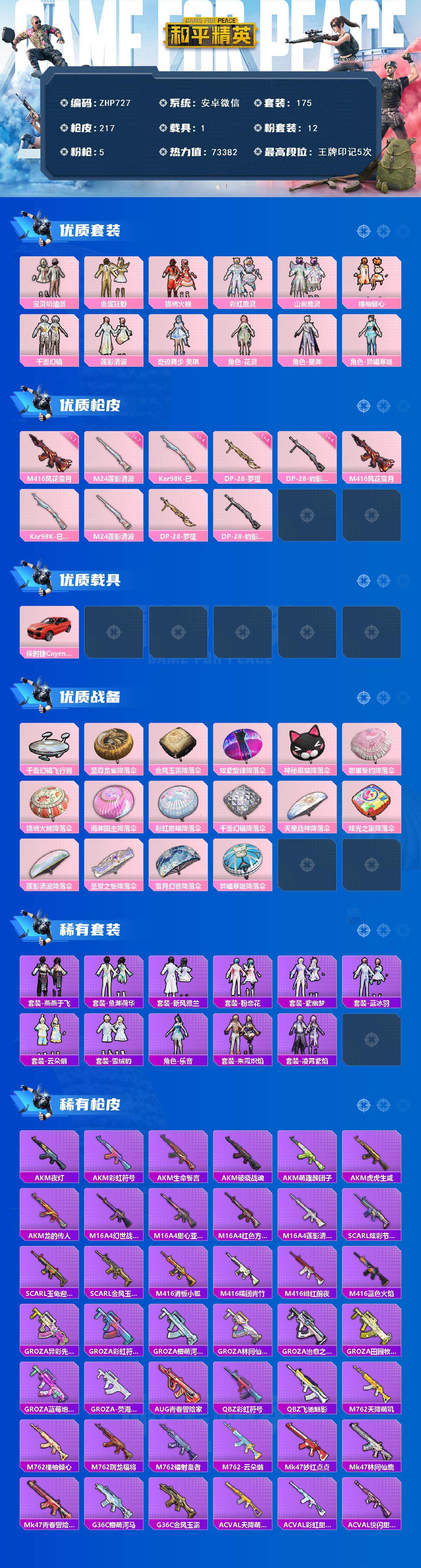 可二次【店主推荐捡漏号!可直接换绑】安卓 微信-12粉装-5特效呛-1载具-2粉色飞行器-73382热力值-5王牌印记-175套装-217呛皮 【热门品类】:套装-龟仙人 【粉色套装】:粉装-宝贝奶油派,粉装-金属狂野,粉装-锦绣火鲤,粉装-彩虹鹿灵,粉装-山涧鹿灵,粉装-橘柚倾心,粉装-千面幻镜,粉装-莲影清波,角色-奇迹舞步 美琪,角色-花灵,角色-星渊,角色-异瞳寒姬 【粉色呛皮等级】:m416-风花雪月七级,kar98k-巳巳如意四级,m24-莲影清波七级,dp-28-罗征四级,dp-28-豹影疾电四级 【粉色载具】:保时捷cayenne(激情红) 【粉色呛皮】:m416-风花雪月,kar98k-巳巳如意,m24-莲影清波,dp-28-罗征,dp-28-豹影疾电 【粉色飞行器】:千面幻镜飞行器 【粉色降落伞】:至尊龙雀降落伞,金风玉露降落伞,炫紫旋律降落伞,神秘黑猫降落伞,甜蜜誓约降落伞,锦绣火鲤降落伞,海渊国主降落伞,彩虹甜喵降落伞,千面幻镜降落伞,天星战神降落伞,炫光之旅降落伞,莲影清波降落伞,圣堂之誓降落伞,雪月幻音降落伞,异瞳寒姬降落伞 【稀有套装】:套装-龟仙人,套装-燕燕于飞,套装-鱼渊荷华,套装-新风雅兰,套装-粉恋花,套装-紫幽梦,套装-蓝冰羽,套装-云朵鹅,套装-雪绒豹,角色-乐音,套装-朱霞炽焰,套装-凌霄紫焰,套装-炫彩糖果 【稀有呛皮】:akm-夜灯,akm-彩虹符号,akm-生命誓言,akm-破晓战魂,akm-萌趣颜团子,akm-虎虎生威,akm-龙的传人,m16a4-幻世战舞者,m16a4-甜心亚梦,m16a4-红色方程式,m16a4-莲影清波,scar-l-炫彩节奏,scar-l-玉兔迎春,scar-l-金风玉露,m416-滑板小狐,m416-糯团青竹,m416-绯红前夜,m416-蓝色火焰,groza-异彩先驱,groza-彩虹符号,groza-懵萌河马,groza-林间仙鹿,groza-治愈之星,groza-田园牧歌,groza-蓝莓炮弹,groza-荧海星豚,aug-青春冒险家,q-彩虹符号,q-飞驰魅影,m762-天降萌叽,m762-橘柚倾心,m762-瑞龙福将,m762-镭射皇者,m762-云朵鹅,mk47-妙红点点,mk47-林间仙鹿,mk47-青春冒险家,g36c-懵萌河马,g36c-金风玉露,ac-val-天降萌叽,ac-val-彩虹甜喵,ac-val-快闪甜心,ac-val-甜心亚梦,蜜獾-千面幻镜,蜜獾-天降萌叽,蜜獾-娇憨猪猪,arx-凌霄紫焰,uzi-啾咪啾咪,uzi-娇憨猪猪,uzi-炫彩节奏,uzi-金风玉露,ump45-仲夏莫吉托,ump45-生命誓言,vect-焰鹰斗篷,vect-暗夜玫瑰,vect-治愈之星,vect-生命誓言,vect-田园牧歌,汤姆逊-天降萌叽,汤姆逊-异彩先驱,汤姆逊-甜梦小狐,野牛-青春冒险家,mp5k-异彩先驱,js9-凌霄紫焰,p90-快闪甜心,p90-飞驰魅影,kar98k-六号树人,kar98k-深海曼妙,kar98k-飞驰魅影,m24-治愈之星,m24-炫彩节奏,awm-焰鹰斗篷,sks-炫彩节奏,sks-糯团青竹,vss-田园牧歌,vss-镭射皇者,mini14-千面幻镜,mini14-异彩先驱,mini14-梦幻火箭,mini14-筑梦精灵,mk14-治愈之星,mk14-童趣迷兔,win94-瑞龙福将,win94-粉樱探戈,slr-娇憨猪猪,slr-葫芦兄弟,qbu-锦绣火鲤,qbu-青春冒险家,莫辛纳甘-懵萌河马,莫辛纳甘-银碳小老虎,amr-妙红点点,m417-惊鸿侠骨,mk20-h-快闪甜心,mk20-h-莲影清波,m200-惊鸿侠骨,svd-云朵鹅,s686-彩虹符号,s686-生命誓言,s1897-春暖花开,s1897-炫彩节奏,s1897-镭射皇者,s1897-飞驰魅影,s1897-荧海星豚,s12k-瑞龙福将,s12k-娇憨猪猪,s12k-幻世战舞者,dbs-焰鹰斗篷,dbs-圣堂之誓,dbs-彩虹甜喵,dbs-彩虹符号,dbs-甜心亚梦,spas-12-田园牧歌,spas-12-云朵鹅,m249-妙红点点,m249-彩虹符号,m249-糯团青竹,m249-莲影清波,dp-28-焰鹰斗篷,dp-28-甜心亚梦,dp-28-锦绣火鲤,mg3-妙红点点,mg3-幻世战舞者,mg3-惊鸿侠骨,mg3-瑞龙福将,pkm-懵萌河马,mg-36-凌霄紫焰,p92-凌霄紫焰,沙墨之鹦-快闪甜心,沙墨之鹦-云朵鹅,爆炸猎弓-惊鸿侠骨,大砍刀-粉色回忆,大砍刀-云朵鹅,平底锅-凌霄紫焰 【其他套装】:套装-ss5特训,套装-ss6特训,套装-ss8特训,套装-ss9特训,套装-ss10特训,套装-ss11特训,套装-ss13特训,套装-ss14特训,套装-ss15特训,套装-ss16特训,套装-ss17特训,套装-ss18特训,套装-ss19特训,套装-ss20特训,套装-ss21特训,套装-ss22特训,套装-ss23特训,套装-ss24特训,套装-ss25特训,套装-ss26特训,套装-ss27特训,套装-ss29特训,套装-光之冒险,套装-军械专家,套装-冷焰舞者,套装-北国孤狼,套装-吉莉礼服,套装-夏日音浪,套装-完美偶像,套装-幻世战舞者,套装-幻影武者,套装-战地督导,套装-探宝勇士,套装-柠萌假日,套装-海上生明月,套装-湖蓝色名流,套装-滨海假日,套装-灼焰舞者,套装-炫蓝之夏,套装-牛气冲天,套装-牛气满满,套装-特种颜团子,套装-特训学院,套装-玉兔迎春,套装-甜蜜告白,套装-甜蜜熊情侣,套装-疯狂小兔子,套装-破晓战魂,套装-福星高照,套装-空岛之星,套装-空投萌叽,套装-竞技勇士朋克,套装-竞技名士,套装-竞技达人朋克,套装-红色运动,套装-绮丽涂鸦,套装-缤纷果语,套装-耀粉歌者,套装-萌趣颜团子,套装-萌黄之夏,套装-蓝色运动,套装-虎虎生威吉莉,套装-街头潮人,套装-都市魅力,套装-酒红色名流,套装-长空猛禽,套装-霓虹街区,套装-青涩时光,套装-飞行日记,套装-骑行爱好者,套装-魅力单车,套装-麻辣教官,套装-黄色伏地魔,套装-黄色名流,套装-黄色运动,套装-黎明保卫者,套装-黑色伏地魔,套装-龙的传人,套装-龟仙人,套装-金耀舞者,套装-战地菁英,套装-夜莺强袭者,套装-雪山精英,套装-圣诞大吉,套装-玲珑飞花,套装-云丝凤蟒,套装-机械征服者,套装-银白舞王,套装-静谧青瓷,套装-冰爽海盐,套装-治愈之星,套装-科技之星,套装-青春冒险家,套装-潮流游乐家,套装-梦起落英,套装-暗夜傀儡,套装-瑞龙福将,套装-团圆交子,角色-明日香款战斗服,角色-薰款战斗服,角色-零款战斗服,套装-异