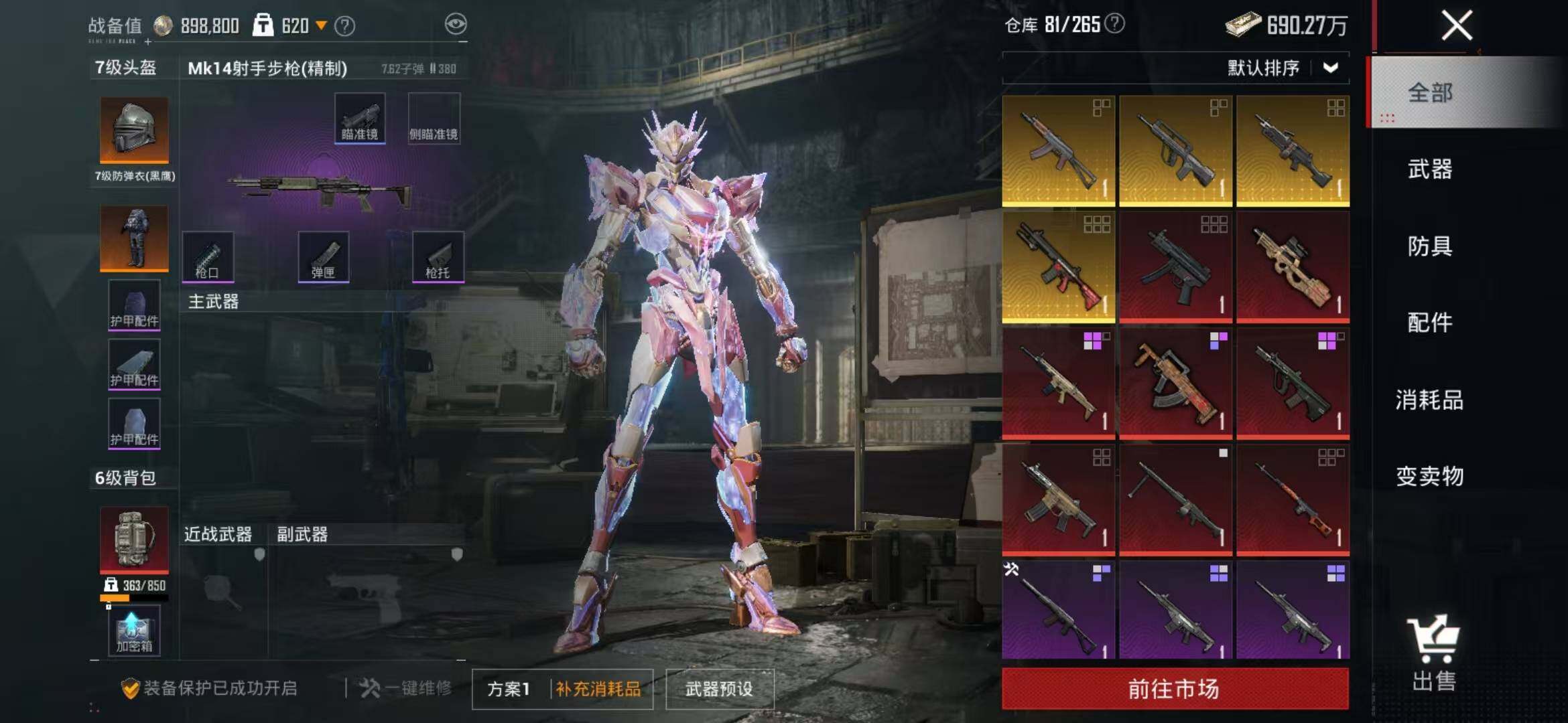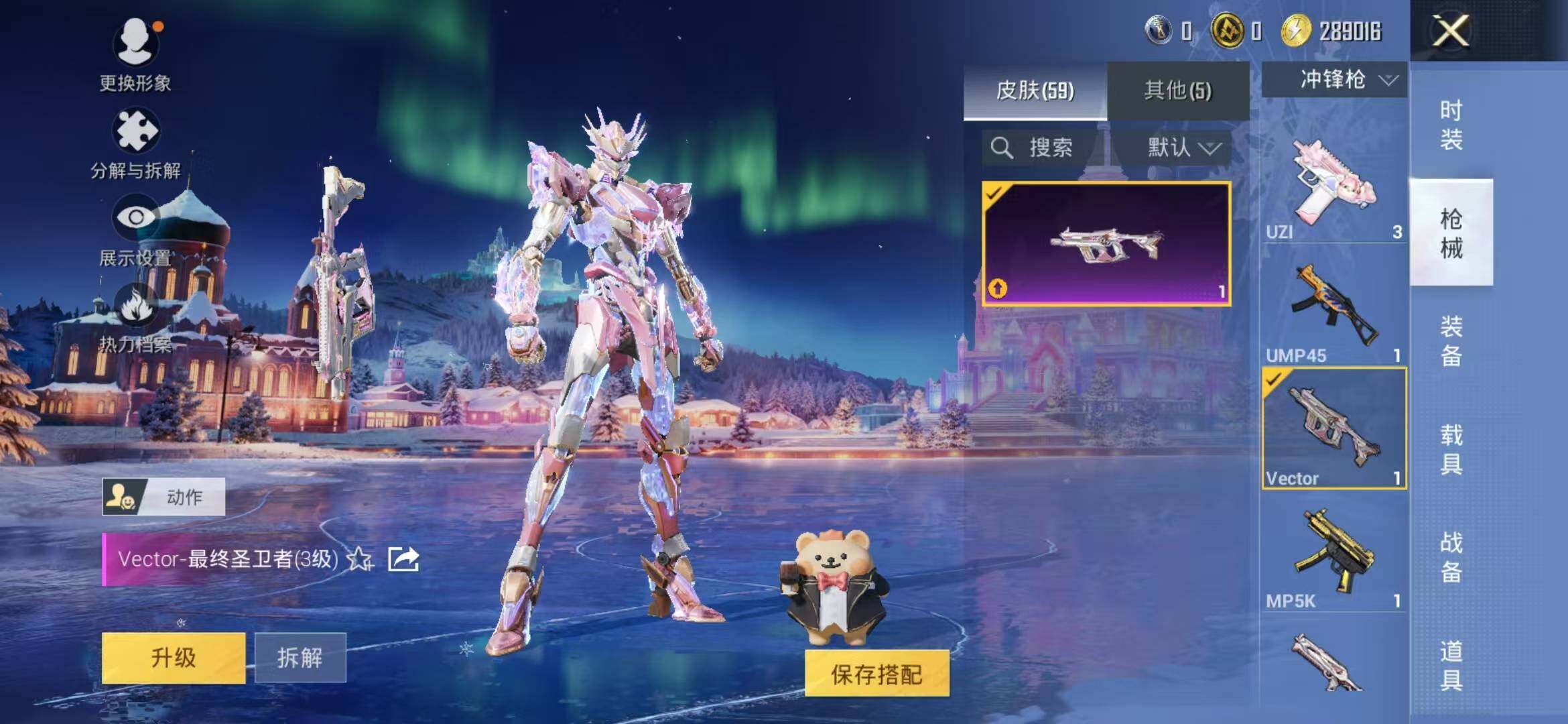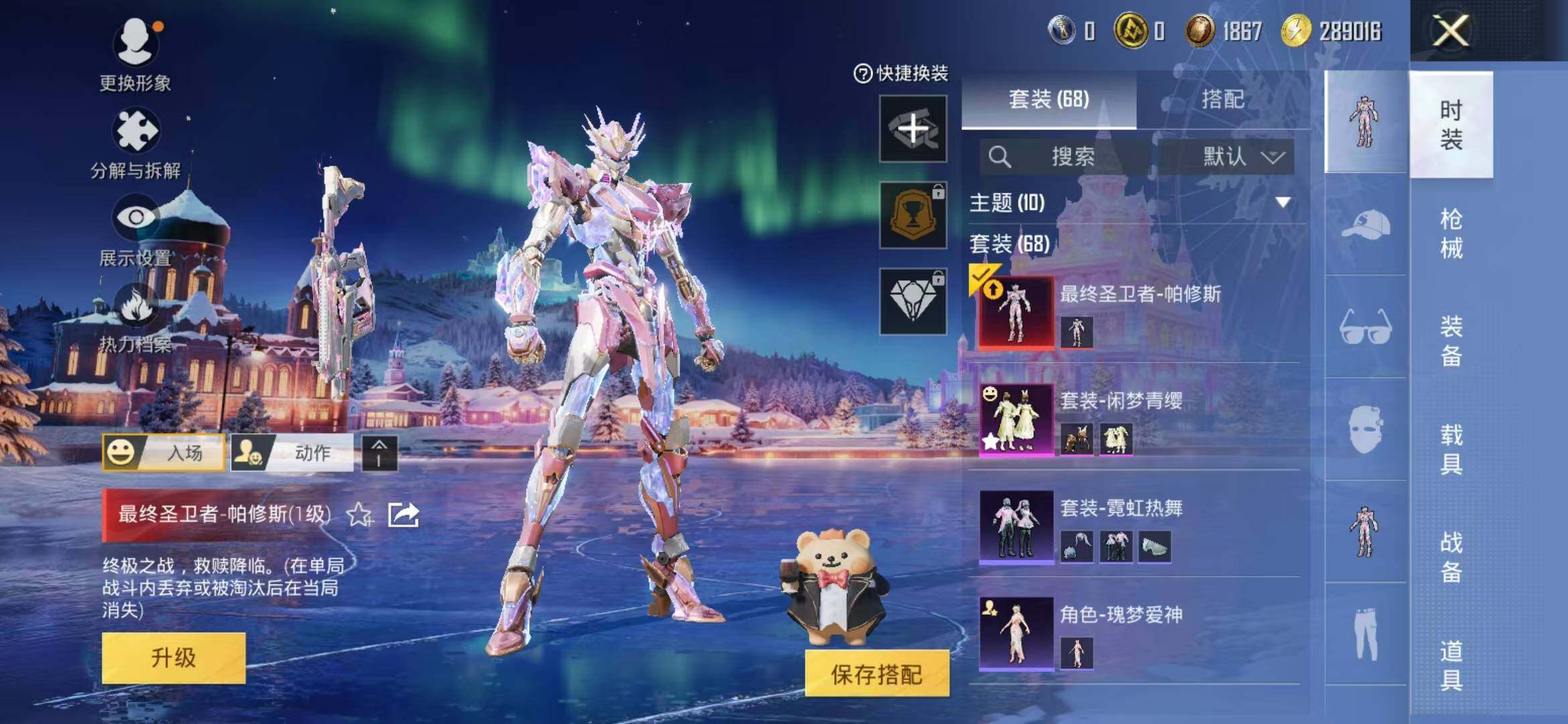 6195-1神装-1粉装-2特效呛-0载具-1粉色飞行器-22816热力值-1王牌印记-68套装-59呛皮 【红色神装等级】:最终圣卫者-帕修斯一级 【红色角色神装】:最终圣卫者-帕修斯 【粉色套装】:粉装-闲梦青缨 【粉色呛皮等级】:vect-最终圣卫者三级,p90-金丰海韵七级