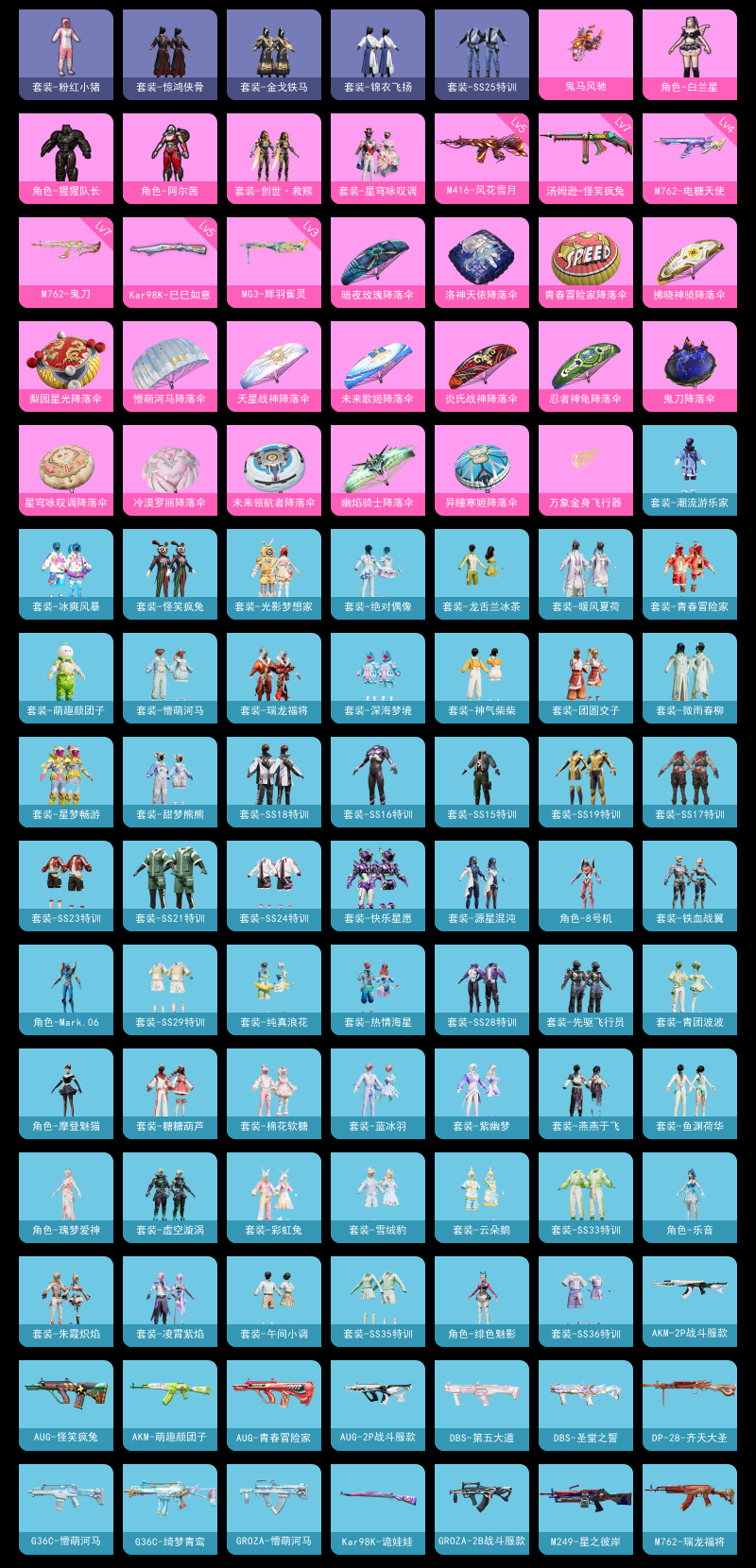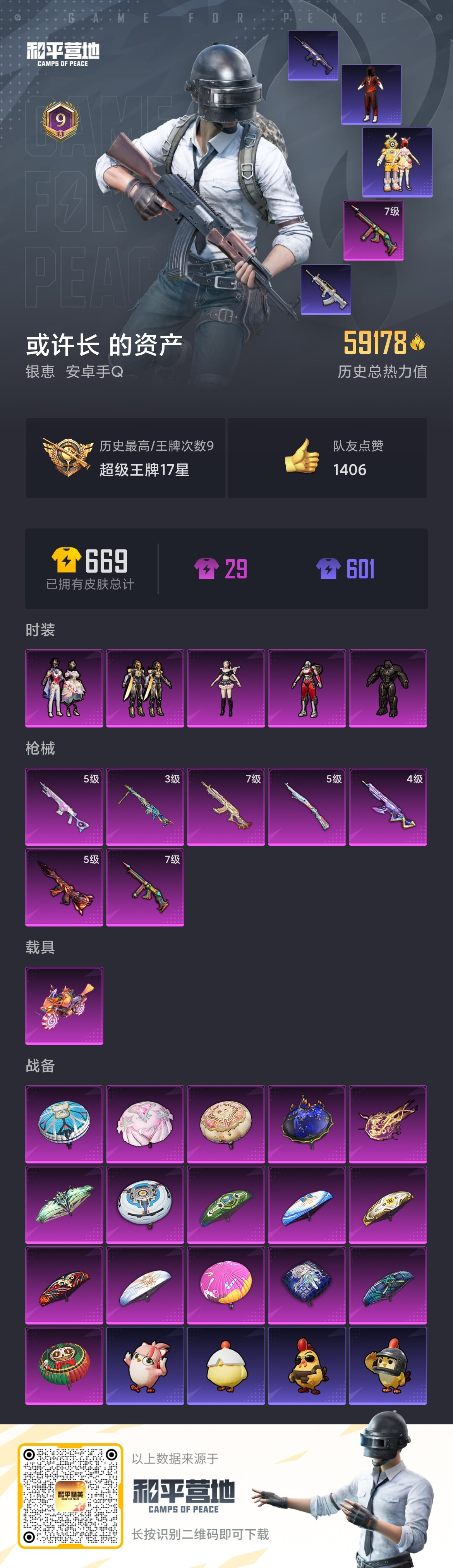 【和平精英】【txhp5197】5粉装,7特效呛,1载具,历史最高段位:超级王牌17星 王牌印记9次 热力值:59178,110套装,175呛械,250装备,109战备;套装:角色-阿尔茜,角色-猩猩队长,角色-白兰星,套装-创世·救赎,套装-星穹咏叹调,套装-骑行爱好者,套装-竞技名士,套装-深蓝色名流,套装-猛禽,套装-长空猛禽,套装-霸义无双,套装-旭日情侣,套装-冷焰舞者,套装-灼焰舞者,套装-人气偶像,套装-神秘领域,套装-魅力单车,套装-坚韧舞者,套装-野性战心,套装-破晓战魂,套装-森林游猎者,套装-荣耀,套装-格斗先锋,套装-粉红小猪,套装-鹤鸣,套装-tjb战队服,套装-怪笑疯兔,套装-青春冒险家,套装-潮流游乐家,套装-萌趣颜团子,套装-战术大师,套装-ss18特训,套装-光影梦想家,套装-热情海星,套装-纯真浪花,套装-吉莉礼服,套装-微雨春柳,套装-暖风夏荷,套装-快乐星愿,套装-星梦畅游,套装-ss15特训,套装-ss16特训,套装-ss17特训,套装-瑞龙福将,套装-团圆交子,套装-冰爽风暴,套装-福星高照,套装-虎虎生威吉莉,套装-空投萌叽,套装-ss19特训,套装-ss21特训,套装-绯格组合,套装-ss23特训,套装-龙舌兰冰茶,套装-甜梦熊熊,套装-神气柴柴,套装-懵萌河马,套装-青玉碎影,套装-ss24特训,套装-源星混沌,套装-龟仙人,套装-ss25特训,套装-金戈铁马,套装-惊鸿侠骨,套装-锦衣飞扬,套装-绝对偶像,套装-香桃花海,套装-深海梦境,套装-龙的传人,套装-ss28特训,套装-铁血战翼,角色-8号机,角色-mark.06,套装-街头风暴,套装-蝶变,套装-ss29特训,套装-虚空漩涡,角色-绯色魅影,套装-先驱飞行员,套装-异域银装,角色-摩登魅猫,套装-星途旅人,套装-ss30特训,套装-青团波波,套装-棉花软糖,套装-糖糖葫芦,套装-ss31特训,套装-鱼渊荷华,套装-燕燕于飞,套装-智谋强哥,角色-风玲,角色-瑰梦爱神,套装-紫幽梦,套装-ss33特训,套装-云朵鹅,套装-巳巳如意,套装-ss32特训,套装-彩虹兔,套装-蓝冰羽,套装-顶瓜瓜,套装-雪绒豹,套装-大橘大利,角色-乐音,套装-ss34特训,套装-朱霞炽焰,套装-凌霄紫焰,套装-ss35特训,套装-午间小调,套装-ss36特训,套装-雪国风尚;呛皮:4级m762-电糖天使,7级m762-鬼刀,m762-瑞龙福将,m762-天降萌叽,m762-云朵鹅,mk47-青春冒险家,mk47-风迹短诗,aug-青春冒险家,aug-怪笑疯兔,aug-天降萌叽,aug-2p战斗服款,aug-异域银装,aug-金蛇镇世,m16a4-蓝色火焰,m16a4-红色方程式,m16a4-冰河战士,m16a4-千金淑猫,g36c-绮梦青鸾,g36c-懵萌河马,g36c-乌木金纹,蜜獾-精灵梦叶罗丽,蜜獾-糖糖葫芦,蜜獾-乌木金纹,akm-破晓战魂,akm-霓虹街区,akm-彩虹符号,akm-萌趣颜团子,akm-虎虎生威,akm-2p战斗服款,akm-龙的传人,ac-val-乌木金纹,ac-val-宇宙意志,5级m416-风花雪月,m416-蓝色火焰,q-彩虹符号,q-相思残雪,q-未来歌姬,q-纯真浪花,groza-彩虹符号,groza-懵萌河马,groza-2b战斗服款,groza-海盐豹豹,scar-l-夜灯,scar-l-王牌四分卫,scar-l-炫彩节奏,scar-l-甜蜜旋律,scar-l-星途旅人,arx-凌霄紫焰,famas-湮灭星辰,famas-乌木金纹,m200-惊鸿侠骨,m200-宇宙意志,m200-乌木金纹,awm-天降萌叽,awm-纯真浪花,5级kar98k-巳巳如意,kar98k-诡娃娃,kar98k-顶峰精英,kar98k-乌木金纹,amr-鬼刀,svd-冷漠罗丽,svd-云朵鹅,莫辛纳甘-乌木金纹,莫辛纳甘-懵萌河马,莫辛纳甘-风迹短诗,win94-怪笑疯兔,win94-瑞龙福将,win94-乌木金纹,m24-乌木金纹,m417-惊鸿侠骨,m417-玩趣呆呆,mk20-h-星途旅人,mk20-h-糖糖葫芦,mk20-h-狂鲨锋刃,mk20-h-乌木金纹,slr-守护天翼,mk12-金蛇镇世,mk12-风迹短诗,mk12-乌木金纹,5级mk14-甜梦熊击,mk14-冰河战士,mk14-紫幽梦,vss-星之彼岸,vss-彩虹符号,vss-香桃花海,mini14-耀粉歌者,mini14-香桃花海,mini14-绯穹魔姬,qbu-青春冒险家,sks-炫彩节奏,sks-未来歌姬,7级汤姆逊-怪笑疯兔,汤姆逊-天降萌叽,汤姆逊-纯真浪花,vect-夜灯,vect-暗夜玫瑰,vect-燕燕于飞,p90-甜蜜旋律,p90-巳巳如意,p90-金蛇镇世,p90-乌木金纹,mp5k-怪笑疯兔,mp5k-未来领航者,aks-74u-鬼刀,aks-74u-鸡智如我,aks-74u-乌木金纹,js9-凌霄紫焰,ump45-蓝色火焰,ump45-生命誓言,ump45-海盐豹豹,ump45-糖糖葫芦,uzi-红色方程式,uzi-炫彩节奏,uzi-冰河战士,野牛-青春冒险家,野牛-燕燕于飞,野牛-乌木金纹,dbs-第五大道,dbs-圣堂之誓,dbs-净心行者,dbs-风迹短诗,dbs-乌木金纹,aa12-g-纯真浪花,s1897-紫幽梦,s1897-乌木金纹,spas-12-燕燕于飞,spas-12-云朵鹅,spas-12-乌木金纹,s12k-瑞龙福将,s12k-玩趣呆呆,s686-红色方程式,s686-巳巳如意,dp-28-彩虹符号,dp-28-齐天大圣,m249-星之彼岸,m249-糯团青竹,m249-萌萌史莱姆,3级mg3-辉羽雀灵,mg3-瑞龙福将,mg3-幻世战舞者,mg3-惊鸿侠骨,mg-36-凌霄紫焰,pkm-懵萌河马,pkm-紫幽梦,蝎式手呛-燕燕于飞,沙墨之鹦-云朵鹅,p92-紫幽梦,p92-凌霄紫焰,tmp-9-未来歌姬,tmp-9-霓彩节奏,tmp-9-幽焰骑士,r45-幻彩电音,短管霰弹-宇宙意志,p18c-糖糖葫芦,平底锅-青春冒险家,平底锅-瑞龙福将,平底锅-懵萌河马,平底锅-惊鸿侠骨,平底锅-纯真浪花,平底锅-糖糖葫芦,平底锅-紫幽梦,平底锅-凌霄紫焰,大砍刀-2p战斗服款,大砍刀-鬼刀,大砍刀-云朵鹅,撬棍-冷漠罗丽,破片手留单-星途旅人,破片手留单-拽到爆炸,破片手留单-巳巳如意,爆炸猎弓-炎氏战神,爆炸猎弓-惊鸿侠骨,盐雾蛋-冰氧夏日,十子怒-异瞳寒姬,十子怒-燕燕于飞,十子怒-异域银装;载具:鬼马风驰;降落伞:万象金身飞行器,红色滑翔尾迹,异域银装飞行器,顶峰精英尾迹,破刃行动尾迹; 详情看图9印记-5.9w热力-5粉-7特-1车 风花雪月/辉羽雀灵