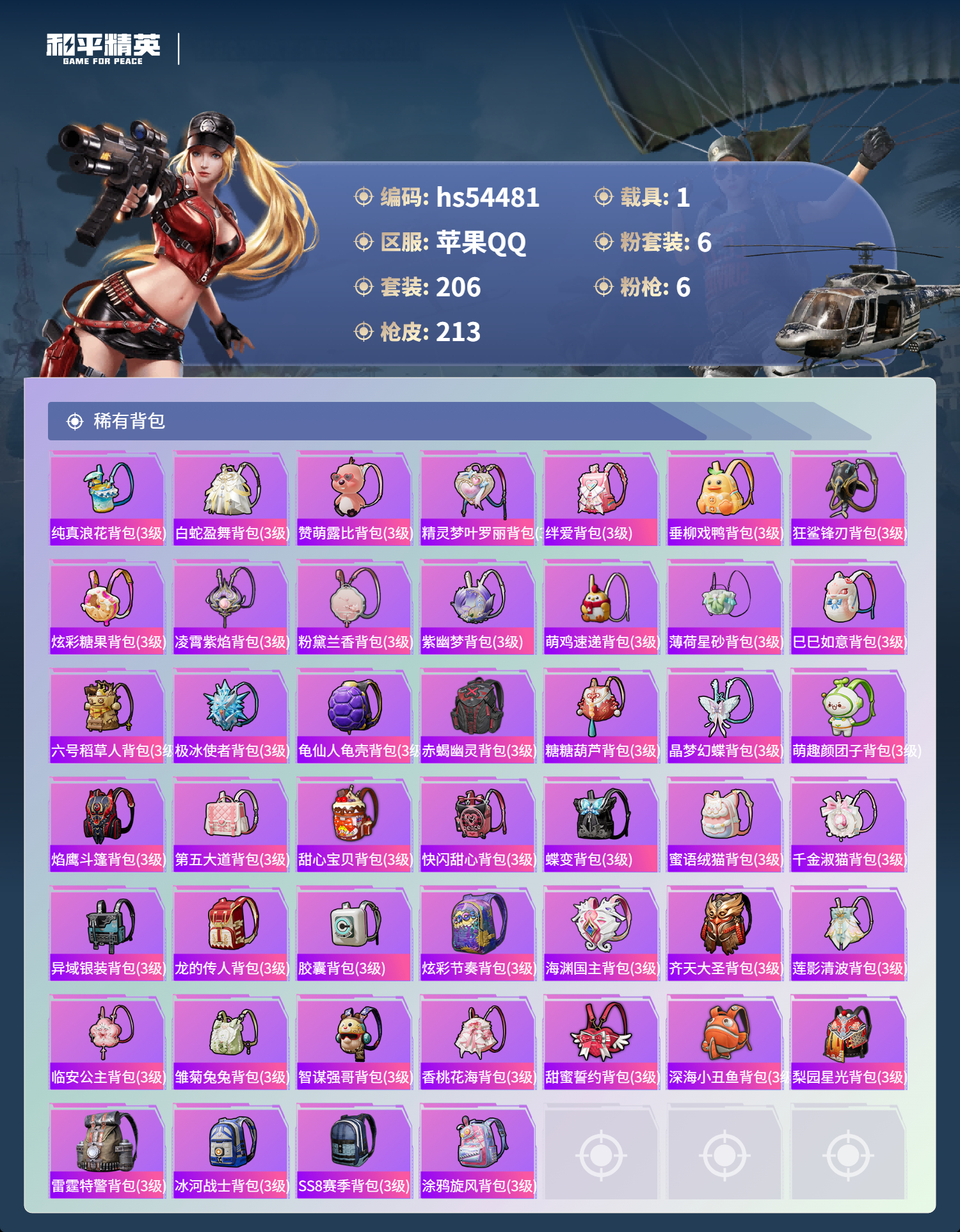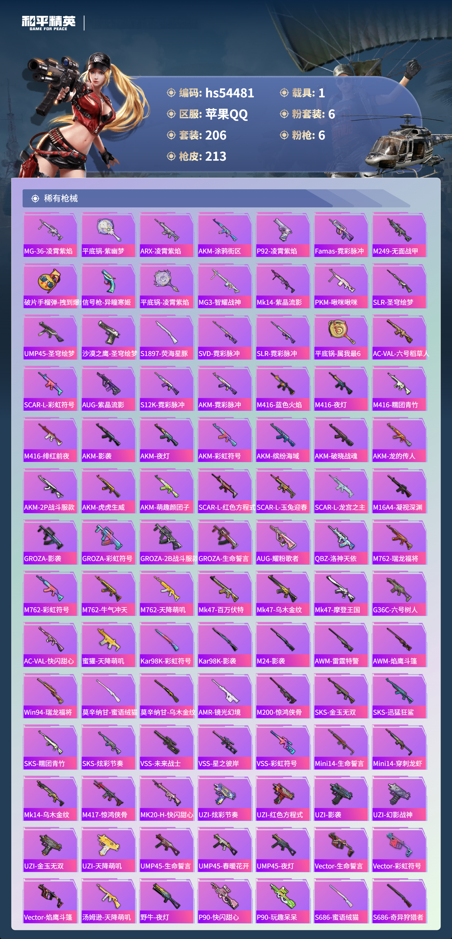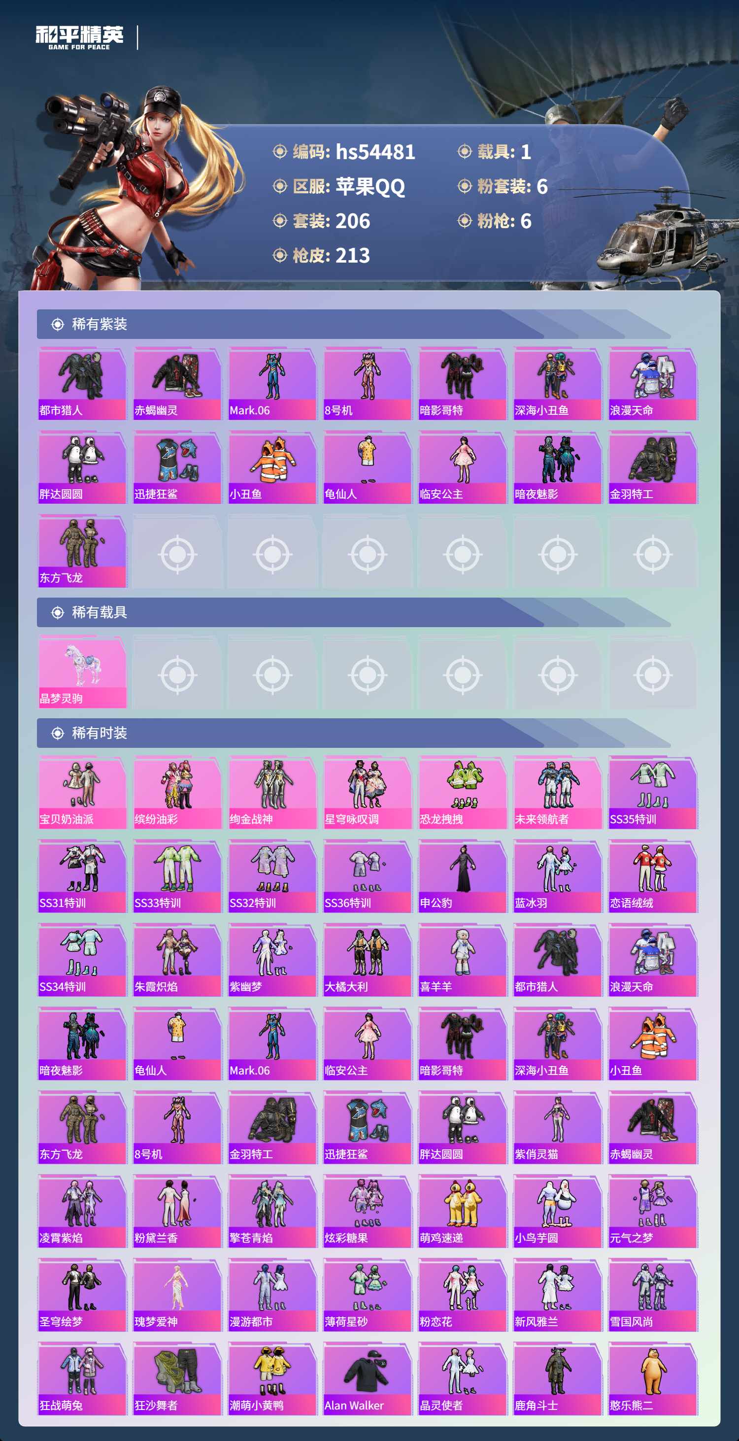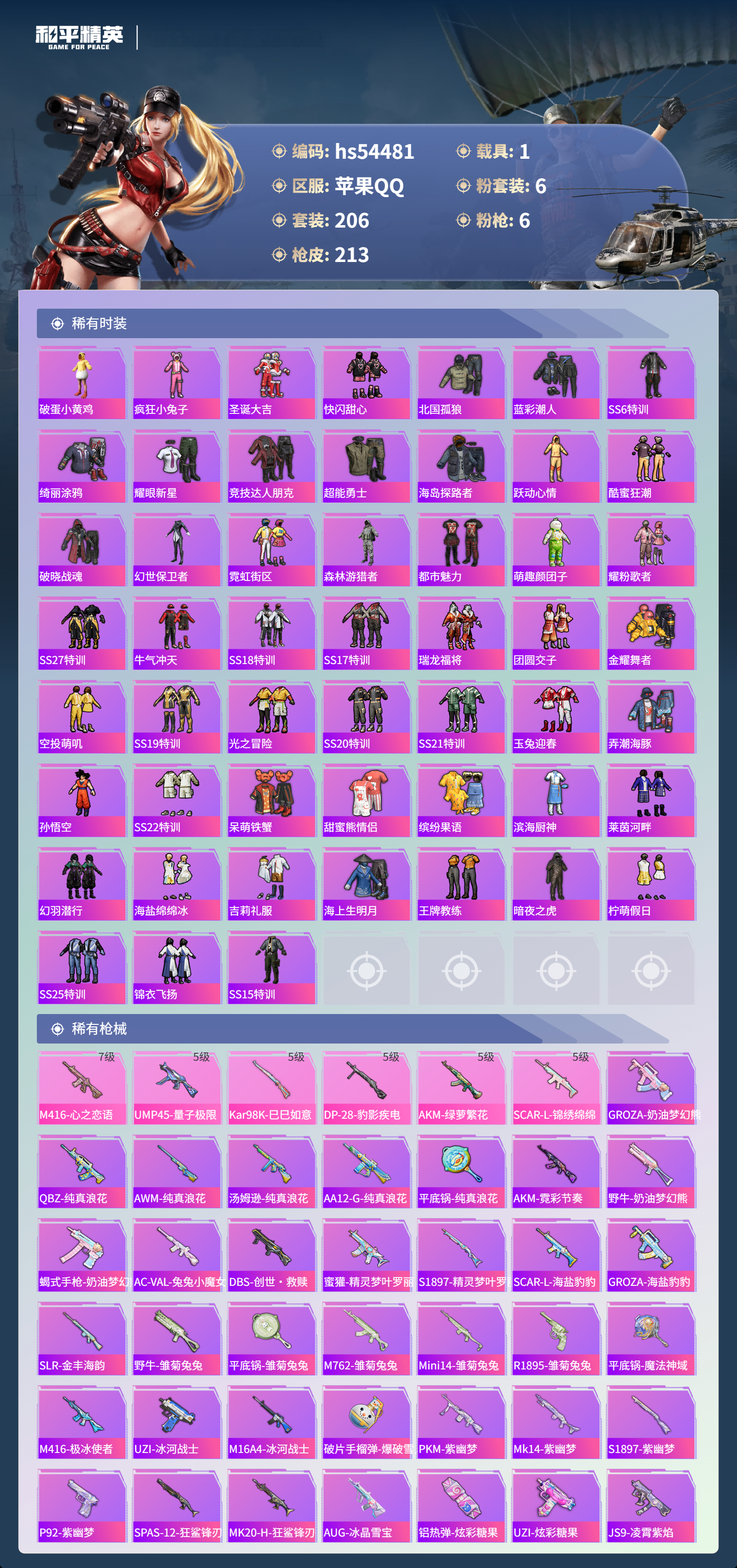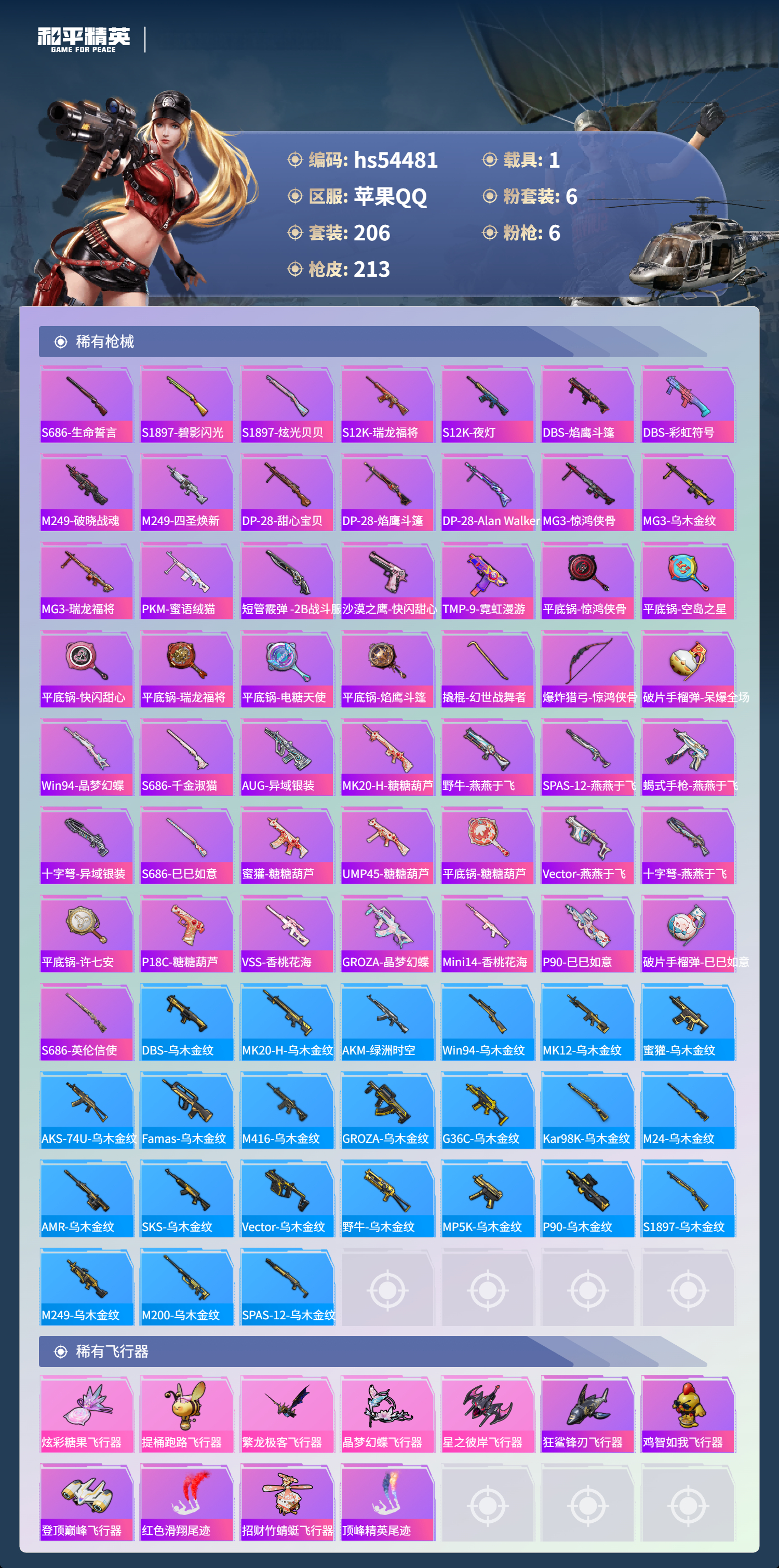 hs54481 苹果手q-15王牌印记-6粉装-6特效呛-1载具-74728热力值-206套装-213呛皮-3卓越印记-1传奇印记【6粉装】套装-恐龙拽拽套装-未来领航者套装-宝贝奶油派套装-缤纷油彩套装-绚金战神套装-星穹咏叹调【6特效呛】scar-l-锦绣绵绵/5级m416-心之恋语/7级akm-绿萝繁花/5级kar98k-巳巳如意/5级dp-28-豹影疾电/5级ump