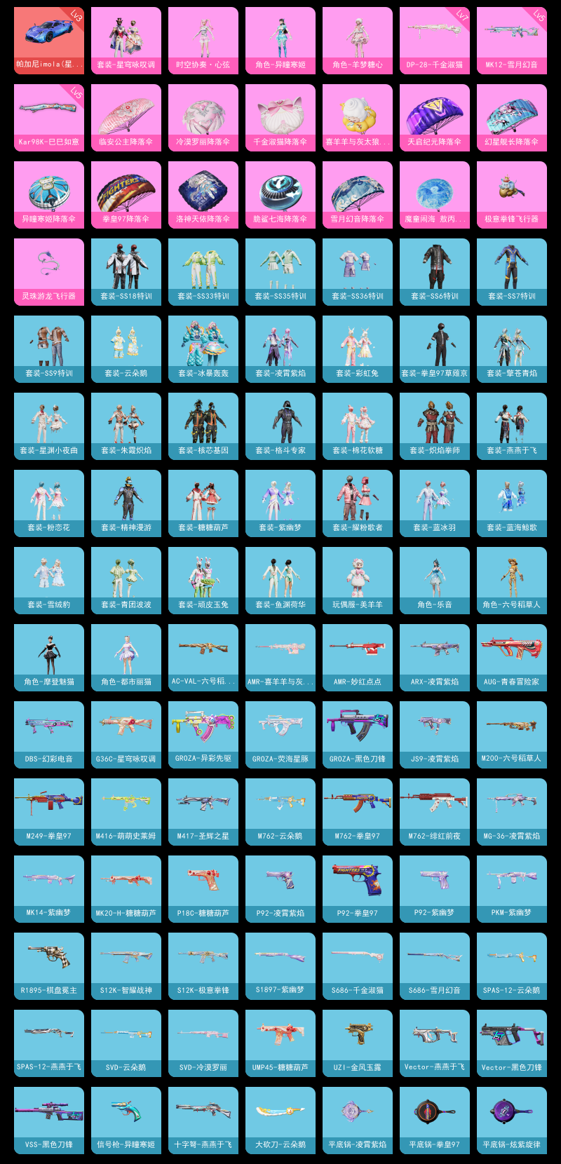 【和平精英】【lyhp18516】5粉装6特效呛1载具【3级帕加尼】羊梦糖心 6号稻草人 老六服 绝对恒星aug 5粉装,6特效呛,1载具,历史最高段位:超级王牌8星 王牌印记6次 热力值:46223,89套装,134呛械,181装备,72战备;套装:时空协奏·心弦,角色-异瞳寒姬,套装-星穹咏叹调,角色-羊梦糖心,角色-绝对恒星,套装-竞技名士,套装-长空猛禽,套装-竞技勇士朋克,套装-甜蜜告白,套装-完美偶像,套装-酷萌兔限定,套装-魅力单车,套装-破晓战魂,套装-丛林猎人,套装-雪山精英,套装-传奇侦探,套装-幻世战舞者,套装-青涩时光,套装-缤纷果语,套装-元素星魂,套装-破蛋小黄鸡,套装-疯狂小兔子,套装-圣诞大吉,套装-北国孤狼,套装-ss6特训,套装-拳皇97草薙京,套装-炽焰拳师,套装-格斗专家,套装-跃动心情,套装-ss7特训,套装-核芯基因,套装-精神漫游,套装-鹤鸣,套装-霓虹街区,套装-ss9特训,套装-顽皮玉兔,套装-牛气满满,套装-白糯汤圆,套装-战术大师,套装-ss18特训,套装-耀粉歌者,套装-冰暴轰轰,套装-空投萌叽,套装-绯格组合,套装-王牌教练,套装-柠萌假日,套装-漫游都市,套装-恋语绒绒,套装-街头风暴,角色-无面战甲,套装-异域银装,角色-摩登魅猫,角色-都市丽猫,套装-星途旅人,套装-ss30特训,套装-青团波波,套装-棉花软糖,套装-糖糖葫芦,角色-六号稻草人,套装-墨青刃影,套装-ss31特训,套装-鱼渊荷华,套装-燕燕于飞,套装-紫幽梦,套装-粉恋花,套装-ss33特训,套装-云朵鹅,套装-ss32特训,套装-彩虹兔,套装-蓝冰羽,套装-雪绒豹,套装-星渊小夜曲,套装-炫彩糖果,角色-乐音,套装-蓝海鲸歌,玩偶服-美羊羊,套装-元气之梦,套装-ss34特训,套装-擎苍青焰,套装-朱霞炽焰,套装-游乐,套装-凌霄紫焰,套装-薄荷星砂,套装-ss35特训,角色-超感刻度,角色-甜心蒙太奇,套装-ss36特训,套装-雪国风尚,套装-萌鸡速递;呛皮:scar-l-红色方程式,scar-l-星途旅人,scar-l-乌木金纹,groza-黑色刀锋,groza-异彩先驱,groza-无面战甲,groza-荧海星豚,groza-乌木金纹,m762-绯红前夜,m762-拳皇97,m762-彩虹符号,m762-云朵鹅,ac-val-天降萌叽,ac-val-六号稻草人,m16a4-乌木金纹,akm-破晓战魂,akm-涂鸦街区,akm-彩虹符号,akm-砺玉逐花,akm-乌木金纹,aug-青春冒险家,aug-异域银装,aug-绝对恒星,aug-紫晶流影,aug-乌木金纹,蜜獾-糖糖葫芦,蜜獾-乌木金纹,m416-红色方程式,m416-萌萌史莱姆,m416-乌木金纹,famas-霓彩脉冲,famas-乌木金纹,g36c-星穹咏叹调,arx-凌霄紫焰,win94-乌木金纹,m200-六号稻草人,m200-乌木金纹,5级kar98k-巳巳如意,svd-冷漠罗丽,svd-云朵鹅,amr-妙红点点,amr-喜羊羊与灰太狼,m24-乌木金纹,awm-天降萌叽,莫辛纳甘-镭金极速,mk20-h-糖糖葫芦,mk20-h-狂鲨锋刃,5级mk14-甜梦熊击,mk14-紫幽梦,mk14-薄荷星砂,5级mk12-雪月幻音,mk12-乌木金纹,m417-玩趣呆呆,m417-圣辉之星,vss-黑色刀锋,vss-香桃花海,mini14-鸡智如我,sks-夜灯,vect-黑色刀锋,vect-燕燕于飞,vect-乌木金纹,uzi-金风玉露,uzi-炫彩糖果,js9-凌霄紫焰,p90-巳巳如意,p90-乌木金纹,ump45-糖糖葫芦,汤姆逊-耀粉歌者,aks-74u-粉粉喵呜,aks-74u-乌木金纹,野牛-燕燕于飞,野牛-乌木金纹,s1897-紫幽梦,s1897-糯团青竹,dbs-彩虹符号,dbs-幻彩电音,dbs-月影灵韵,s12k-玩趣呆呆,s12k-智耀战神,s12k-极意拳锋,s12k-乌木金纹,spas-12-燕燕于飞,spas-12-云朵鹅,spas-12-乌木金纹,s686-千金淑猫,s686-雪月幻音,pkm-啾咪啾咪,pkm-紫幽梦,2级m249-绝对恒星,m249-拳皇97,m249-糯团青竹,m249-无面战甲,mg3-幻世战舞者,mg3-霓彩脉冲,7级dp-28-千金淑猫,5级dp-28-豹影疾电,mg-36-凌霄紫焰,信号呛-异瞳寒姬,蝎式手呛-千金淑猫,蝎式手呛-燕燕于飞,蝎式手呛-六号稻草人,沙墨之鹦-云朵鹅,r1895-棋盘冕主,短管霰弹-竹节火铳,p18c-糖糖葫芦,p92-拳皇97,p92-紫幽梦,p92-凌霄紫焰,电击呛-喜羊羊与灰太狼,p1911-无面战甲,平底锅-拳皇97,平底锅-黑色刀锋,平底锅-缤纷糖果,平底锅-炫紫旋律,平底锅-糖糖葫芦,平底锅-许七安,平底锅-紫幽梦,平底锅-凌霄紫焰,撬棍-传奇侦探,撬棍-脆鲨七海,撬棍-冷漠罗丽,大砍刀-黑金刀,大砍刀-云朵鹅,破片手留单-拽到爆炸,破片手留单-巳巳如意,破片手留单-爆破雪人,突击盾牌-绝对恒星,十子怒-燕燕于飞,十子怒-异域银装,爆炸猎弓-雪月幻音,爆炸猎弓-喜羊羊与灰太狼,盐雾蛋-冰氧夏日,盐雾蛋-冰澜龙吟,铝热弹-炫彩糖果;载具:3级帕加尼imola星空蓝;降落伞:炫彩糖果飞行器,绝对恒星飞行器,极意拳锋飞行器,灵珠游龙飞行器,异域银装飞行器,顶峰精英尾迹,登顶巅峰飞行器; 详情看图