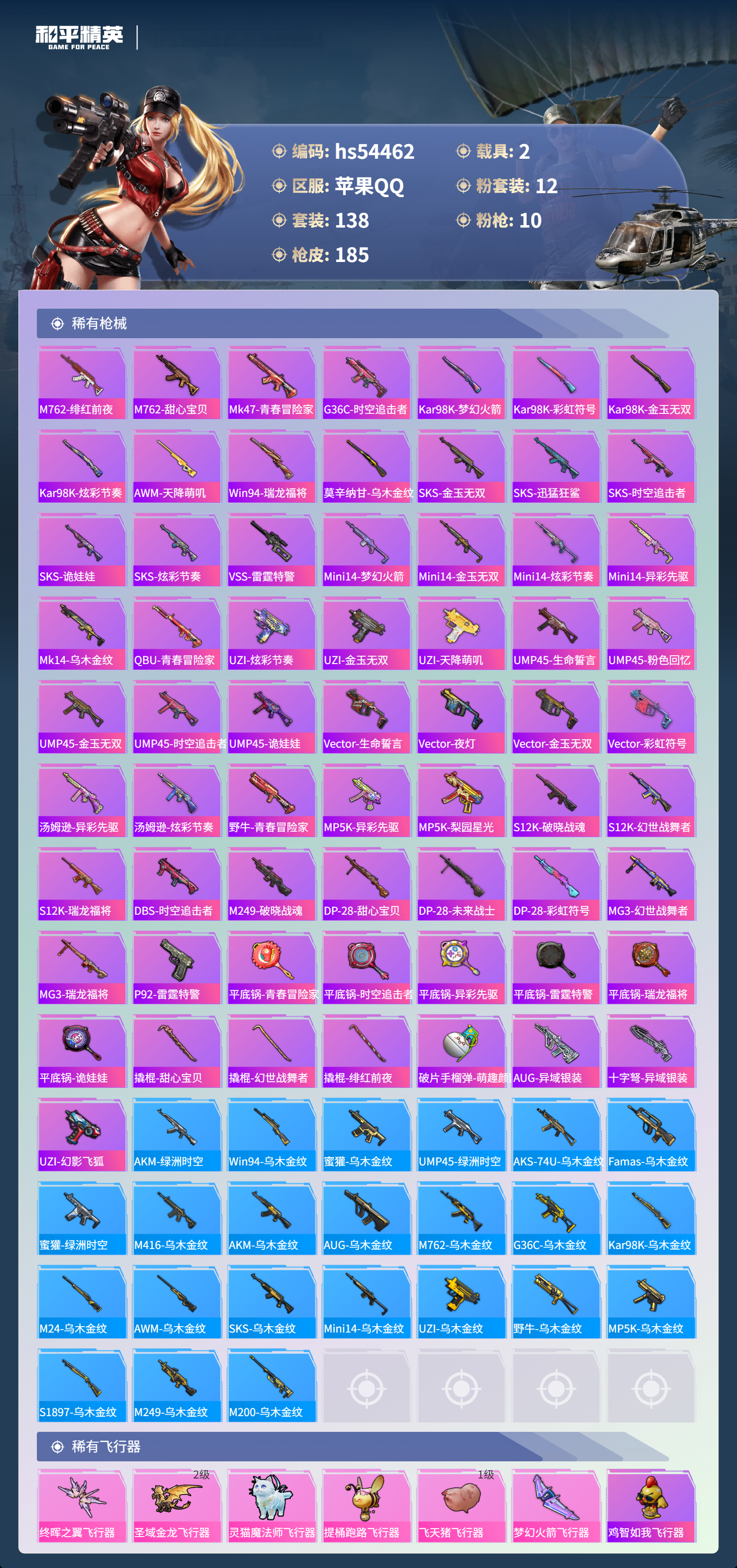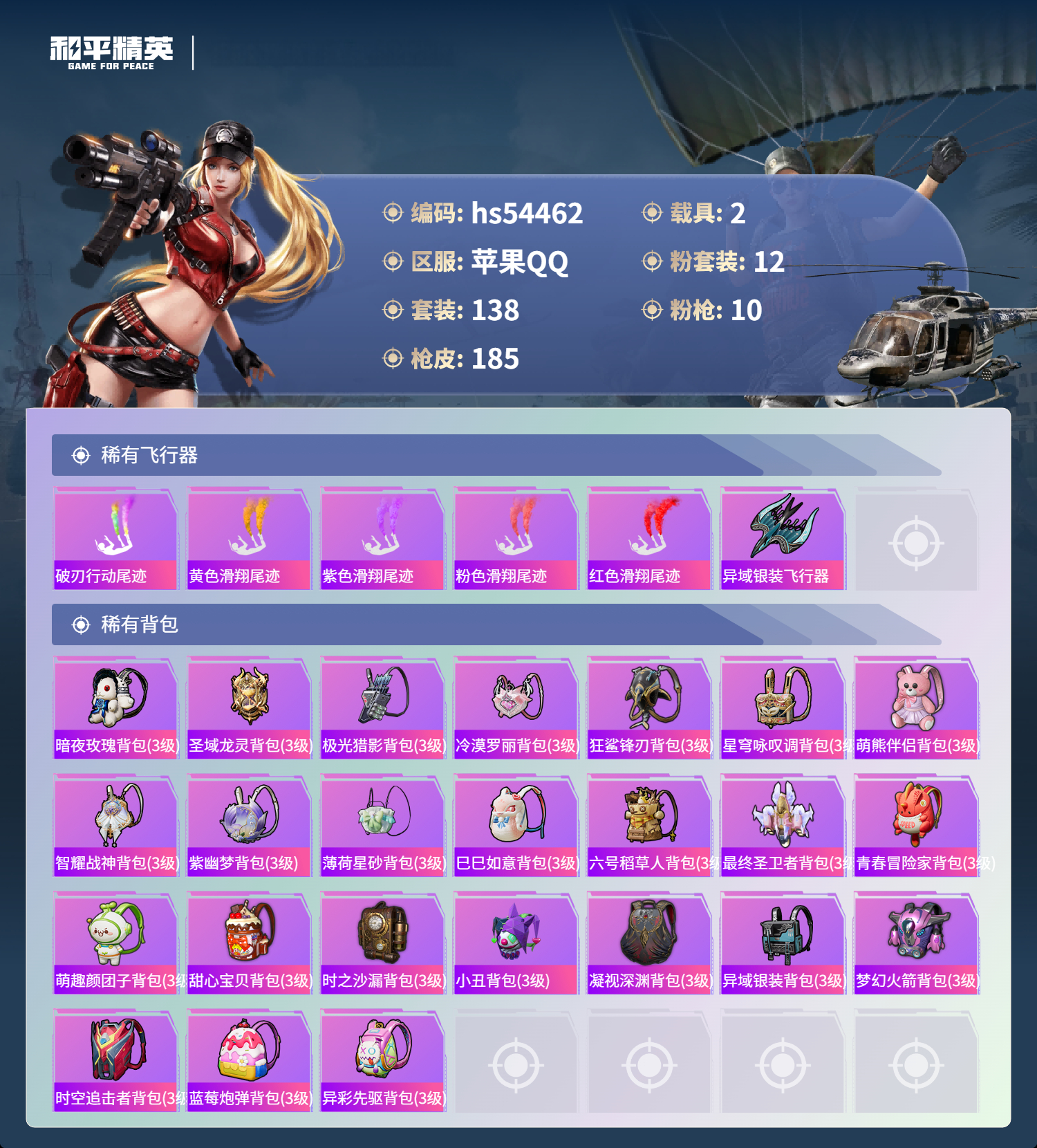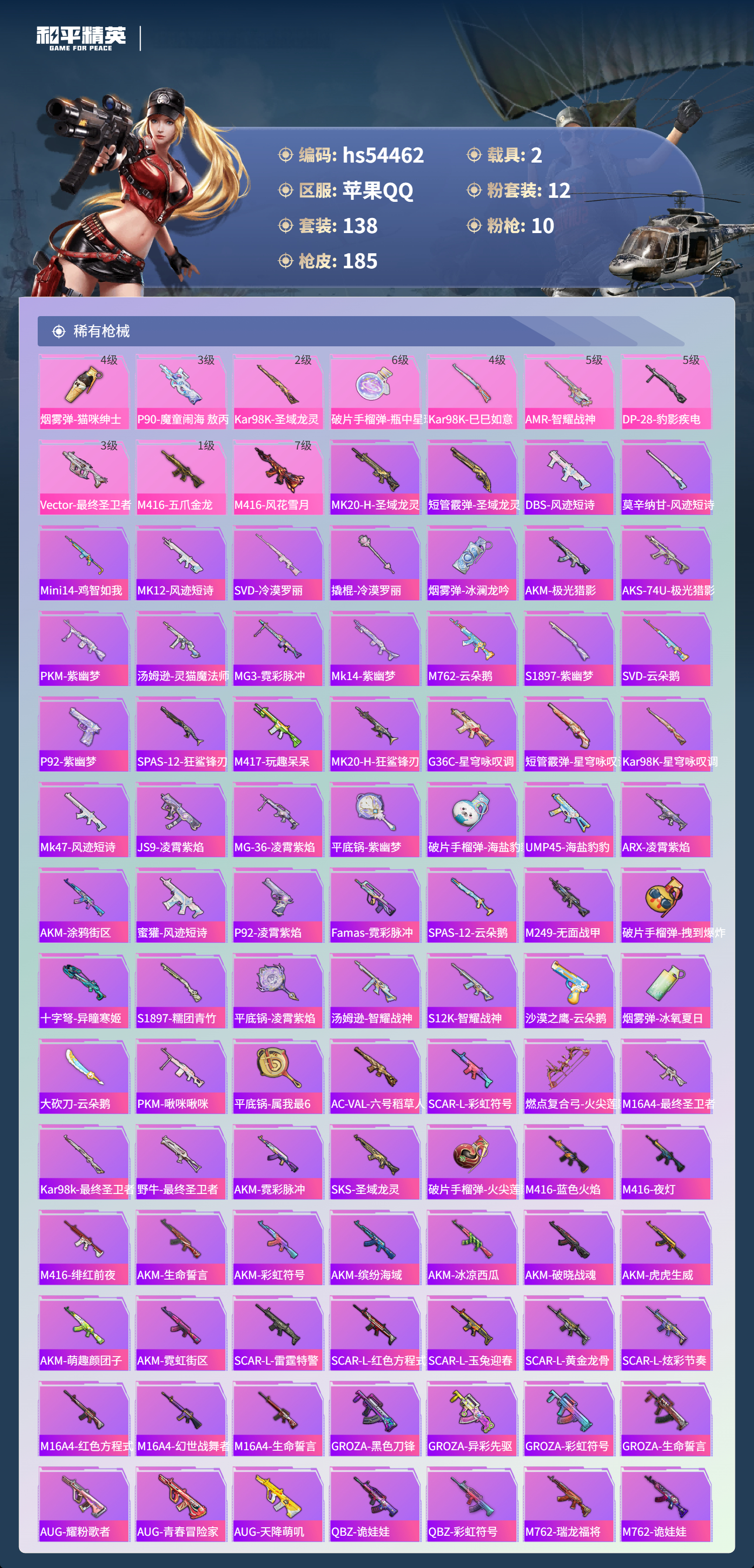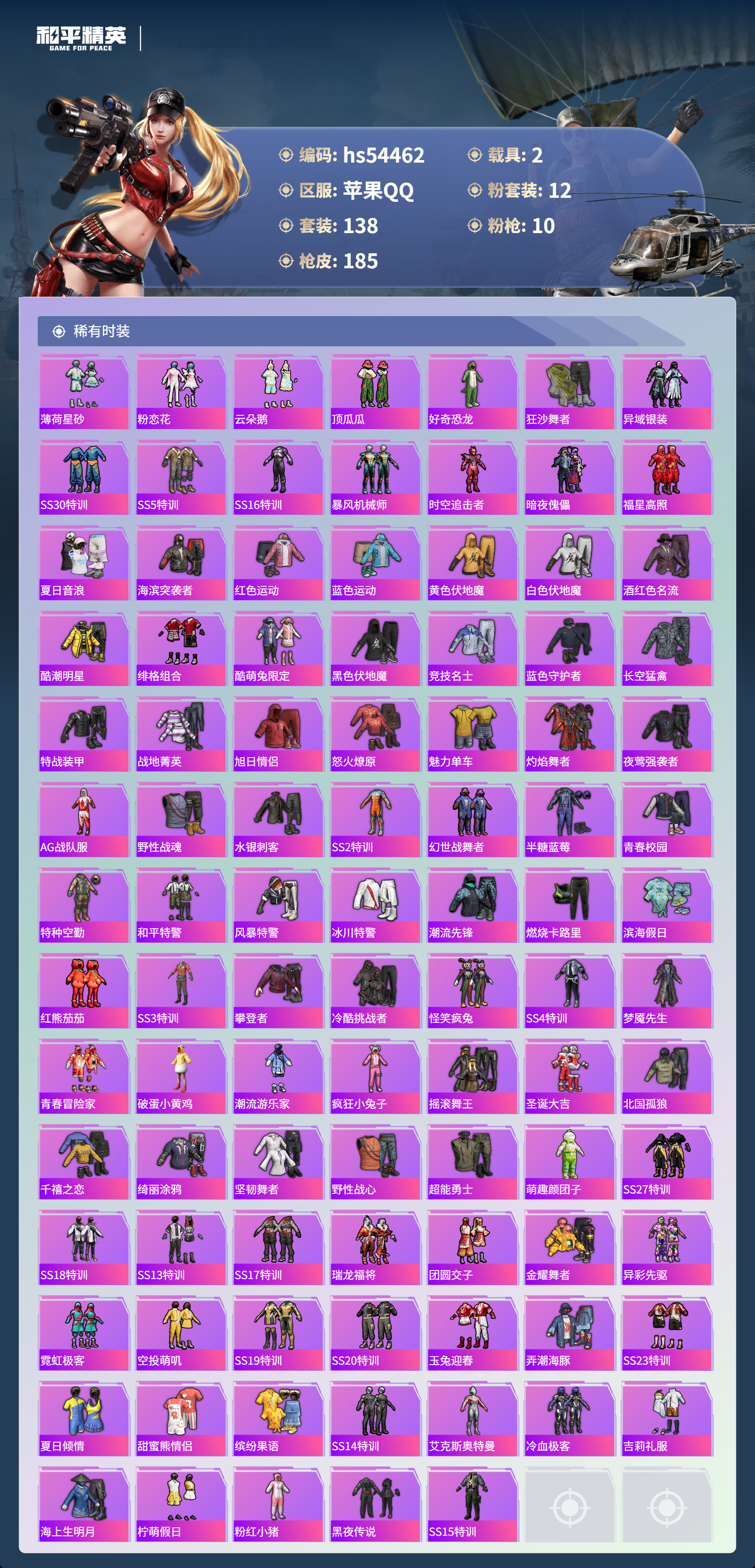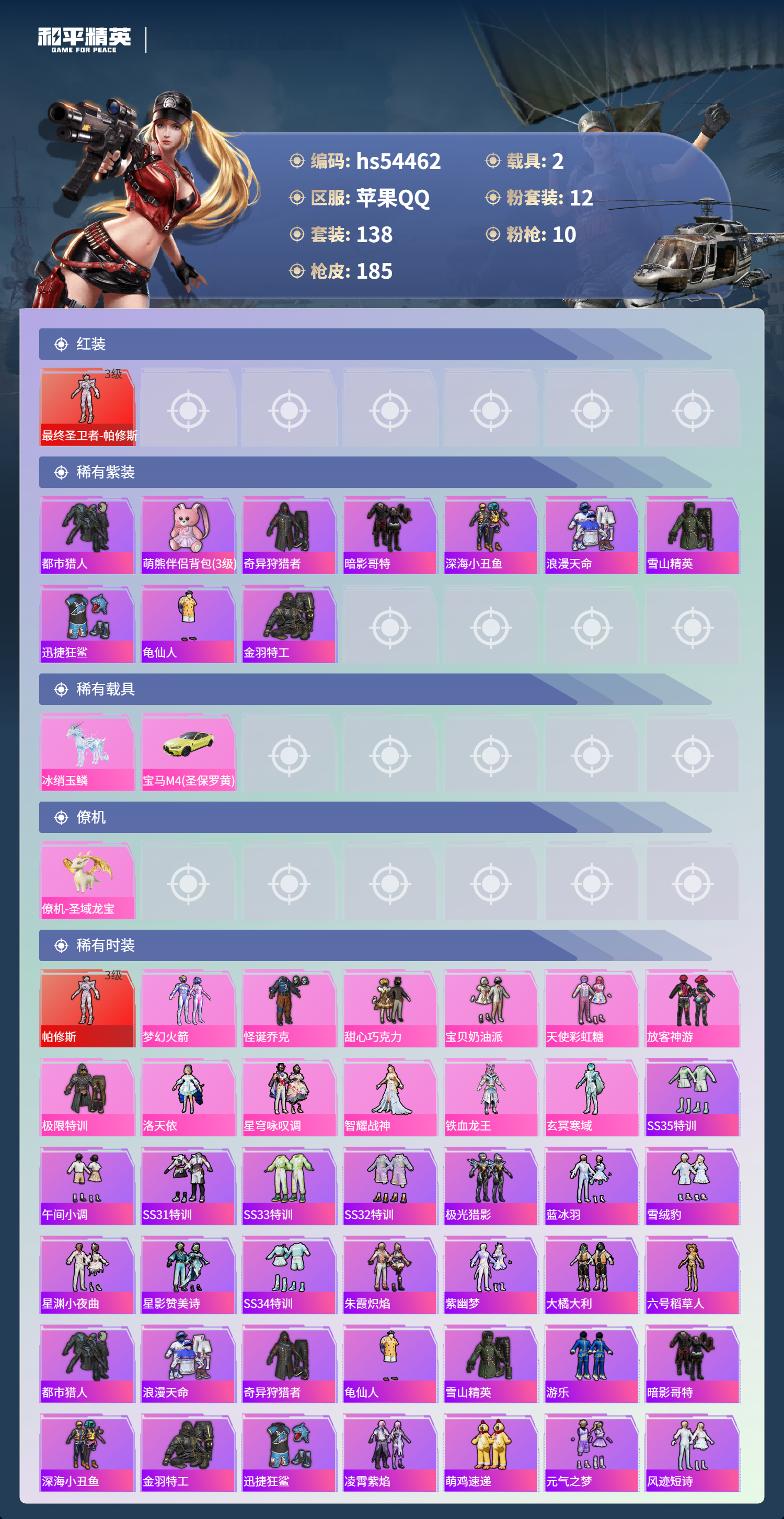 hs54462 苹果手q-9王牌印记-有战神框-1红装-12粉装-10特效呛-2载具-66539热力值-138套装-185呛皮-3卓越印记-2传奇印记【1红装】最终圣卫者-帕修斯/3级【12粉装】套装-梦幻火箭套装-甜心巧克力套装-天使彩虹糖角色-玄冥寒域角色-洛天依套装-铁血龙王套装-放客神游套装-极限特训套装-宝贝奶油派角色-智耀战神套装-怪诞乔克套装-星穹咏叹调【