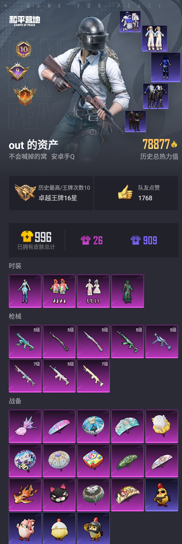 【和平精英】【lyhp18549】4粉8特 满级妹控 tt战队服 兔兔白日梦 tt追光服 天命 哥特 4粉装,8特效呛,0载具,历史最高段位:卓越王牌16星 王牌印记10次 热力值:78877,210套装,261呛械,320装备,175战备;套装:套装-木曜青龙,套装-炫光之旅,套装-蜜语绒猫,角色-异瞳寒姬,套装-特训学院,套装-猎鹰,套装-青年教官,套装-橘黑制服,套装-红色运动,套装-黄色运动,套装-蓝色运动,套装-黄色伏地魔,套装-白色伏地魔,套装-黑色伏地魔,套装-骑行爱好者,套装-竞技名士,套装-深蓝色名流,套装-酒红色名流,套装-湖蓝色名流,套装-黄色名流,套装-猛禽,套装-野性山猫,套装-长空猛禽,套装-漫步者,套装-竞技勇士朋克,套装-黎明保卫者,套装-蓝色守护者,套装-海岛探路者,套装-旭日情侣,套装-冷焰舞者,套装-灼焰舞者,套装-刚毅裁决者,套装-浪漫天命,套装-特战装甲,套装-战地督导,套装-甜蜜告白,套装-春日漫步,套装-燃烧卡路里,套装-鹰眼刺客,套装-冰冻风暴,套装-完美偶像,套装-人气偶像,套装-幻影武者,套装-街头潮人,套装-暗金炫舞,套装-蓝彩潮人,套装-怒火燎原,套装-魅力单车,套装-绮丽涂鸦,套装-雪山征服者,套装-坚韧舞者,套装-竞技达人朋克,套装-破晓战魂,套装-森林游猎者,套装-都市魅力,套装-荣耀,套装-沙漠兵团,套装-丛林猎人,套装-雪山精英,套装-酷潮明星,套装-传奇侦探,套装-极地朋克,套装-暗影哥特,套装-青涩时光,套装-缤纷果语,套装-alan walker,套装-元素星魂,套装-极速红龙,套装-海上生明月,套装-粉红小猪,套装-破蛋小黄鸡,套装-疯狂小兔子,套装-幻世猎手,套装-ss5特训,套装-圣诞大吉,套装-熔岩使者,套装-凛冬战士,套装-好奇恐龙,套装-爆竹金鼠,套装-红酒骑士,套装-金鼠迎春,套装-北国孤狼,套装-ss6特训,套装-拳皇97八神庵,套装-炽焰拳师,套装-格斗专家,套装-奇迹天团,套装-玲珑飞花,套装-跃动心情,套装-ss7特训,套装-黑色刀锋,套装-核芯基因,套装-精神漫游,套装-银河圣歌,套装-鹤鸣,套装-霓虹街区,套装-ss8特训,套装-白熊同盟,套装-ss9特训,套装-牛气满满,套装-白糯汤圆,套装-青春冒险家,套装-潮流游乐家,套装-萌趣颜团子,套装-特种颜团子,套装-战术大师,套装-ss18特训,套装-耀粉歌者,套装-飞行日记,套装-竞技角斗士,套装-曼妙人鱼,套装-热情海星,套装-纯真浪花,套装-ss14特训,套装-吉莉礼服,套装-星梦畅游,套装-ss15特训,套装-ss16特训,套装-ss17特训,套装-tt追光队服,套装-空投萌叽,套装-ss19特训,套装-兔兔白日梦,套装-tt战队服,套装-炫蓝之夏,套装-玉兔迎春,套装-ss22特训,套装-田园牧歌,套装-轻风白浪,套装-光之冒险,套装-绯格组合,套装-神气柴柴,套装-懵萌河马,套装-王牌教练,套装-青玉碎影,套装-ss24特训,套装-花园小羊咩,套装-龟仙人,套装-ss25特训,套装-惊鸿侠骨,套装-锦衣飞扬,套装-元气发射,套装-香桃花海,套装-深海梦境,套装-果汁能量,套装-龙的传人,套装-冰河战士,套装-ss26特训,套装-快闪甜心,套装-春光漫游,套装-漫游都市,套装-空岛之星,套装-云魄琉璃,套装-贝斯之夜,套装-焰鹰斗篷,套装-幽夜迷踪,套装-幻羽潜行,套装-ss27特训,套装-恋语绒绒,套装-老实芭蕉,套装-ss28特训,角色-蝶吟花词,玩偶服-卖崽青蛙,套装-街头风暴,套装-海盐绵绵冰,套装-蝶变,套装-小熊娃娃,套装-ss29特训,套装-虚空漩涡,套装-雏菊兔兔,套装-萝兰蝴蝶,角色-绯色魅影,套装-异域银装,套装-星途旅人,套装-ss30特训,套装-ss31特训,套装-鱼渊荷华,套装-石蕴玉辉,套装-燕燕于飞,套装-智谋强哥,角色-瑰梦爱神,套装-紫幽梦,套装-粉恋花,套装-ss33特训,套装-云朵鹅,套装-巳巳如意,套装-ss32特训,套装-彩虹兔,套装-蓝冰羽,套装-顶瓜瓜,套装-雪绒豹,套装-大橘大利,角色-灵公主,套装-炫彩糖果,玩偶服-喜羊羊,套装-元气之梦,套装-ss34特训,套装-擎苍青焰,套装-朱霞炽焰,角色-申公豹,套装-凌霄紫焰,套装-ss35特训,套装-午间小调,套装-秘语星愿,套装-风迹短诗,套装-粉黛兰香,套装-ss36特训,套装-雪国风尚,套装-tt猎星队服,套装-萌鸡速递;呛皮:m16a4-蓝色火焰,m16a4-红色方程式,m16a4-快乐主宰,m16a4-凝视深渊,m16a4-魔法学院,m16a4-幻世战舞者,m16a4-冰河战士,akm-生命誓言,akm-影袭,akm-破晓战魂,akm-霓虹街区,akm-夜灯,akm-涂鸦街区,akm-萌趣颜团子,akm-龙的传人,akm-江南烟雨,akm-霓彩脉冲,akm-乌木金纹,groza-影袭,groza-春暖花开,groza-黑色刀锋,groza-彩虹符号,groza-田园牧歌,groza-懵萌河马,groza-乌木金纹,q-彩虹符号,q-纯真浪花,q-乌木金纹,aug-耀粉歌者,aug-青春冒险家,aug-天降萌叽,aug-异域银装,aug-冰晶雪宝,aug-紫晶流影,aug-乌木金纹,famas-湮灭星辰,famas-霓彩脉冲,famas-乌木金纹,5级m762-青锋波束,m762-拳皇97,m762-牛气冲天,m762-彩虹符号,m762-天降萌叽,m762-雏菊兔兔,m762-云朵鹅,m762-乌木金纹,5级scar-l-锦绣绵绵,scar-l-红色方程式,scar-l-夜灯,scar-l-炫彩节奏,scar-l-彩虹符号,scar-l-玉兔迎春,scar-l-星途旅人,scar-l-海盐豹豹,scar-l-乌木金纹,m416-蓝色火焰,m416-红色方程式,m416-黄金狮王,m416-糯团青竹,m416-乌木金纹,ac-val-乌木金纹,ac-val-天降萌叽,ac-val-闲梦青缨,ac-val-快闪甜心,5级蜜獾-异瞳寒姬,蜜獾-天降萌叽,蜜獾-鸡智如我,蜜獾-风迹短诗,蜜獾-乌木金纹,g36c-懵萌河马,g36c-乌木金纹,mk47-青春冒险家,mk47-乌木金纹,mk47-炫光之旅,mk47-风迹短诗,arx-凌霄紫焰,win94-乌木金纹,5级kar98k-巳巳如意,kar98k-红色方程式,kar98k-影袭,kar98k-彩虹符号,kar98k-顶峰精英,kar98k-乌木金纹,svd-云朵鹅,awm-天降