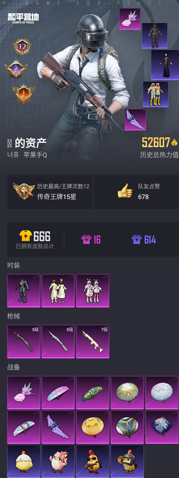 【和平精英】【lyhp18557】3粉3特 申公豹 满级妹控 3粉装,3特效呛,0载具,历史最高段位:传奇王牌15星 王牌印记12次 热力值:52607,150套装,193呛械,193装备,110战备;套装:角色-复仇流浪者,套装-太空嘟嘟,套装-闲梦青缨,套装-特训学院,套装-猎鹰,套装-青年教官,套装-橘黑制服,套装-红色运动,套装-黄色运动,套装-蓝色运动,套装-黄色伏地魔,套装-白色伏地魔,套装-黑色伏地魔,套装-骑行爱好者,套装-竞技名士,套装-深蓝色名流,套装-酒红色名流,套装-湖蓝色名流,套装-黄色名流,套装-猛禽,套装-长空猛禽,套装-黎明保卫者,套装-蓝色守护者,套装-海岛探路者,套装-旭日情侣,套装-冷焰舞者,套装-灼焰舞者,套装-贵族骑装,套装-战地督导,套装-甜蜜告白,套装-滨海假日,套装-冰冻风暴,套装-完美偶像,套装-人气偶像,套装-幻影武者,套装-街头潮人,套装-蓝彩潮人,套装-魅力单车,套装-绮丽涂鸦,套装-雪山征服者,套装-坚韧舞者,套装-竞技达人朋克,套装-都市漫游者,套装-破晓战魂,套装-都市魅力,套装-沙漠兵团,套装-酷潮明星,套装-极地朋克,套装-烈火街头,套装-幻世战舞者,套装-金耀舞者,套装-缤纷果语,套装-alan walker,套装-龙魂突击队,套装-风暴特警,套装-元素星魂,套装-极速红龙,套装-麻辣教官,套装-梦魇先生,套装-破蛋小黄鸡,套装-霓虹街区,套装-顽皮玉兔,套装-探宝勇士,套装-牛气满满,套装-白糯汤圆,套装-战术大师,套装-牛气冲天,套装-ss18特训,套装-耀粉歌者,套装-星梦畅游,套装-ss17特训,套装-醒狮腾龙,套装-瑞龙福将,套装-团圆交子,套装-福星高照,套装-虎虎生威吉莉,角色-军刀雅典娜,套装-ss19特训,套装-沁蓝冰爽,套装-浓情蜜辣,套装-飞驰魅影,套装-音速流光,套装-紫翼圣骑,套装-炫蓝之夏,套装-ss20特训,套装-猎梦纪元,套装-甜心亚梦,套装-虚音幻奏,套装-ss21特训,套装-萌趣咩咩,套装-娇憨猪猪,套装-酸甜橘柚,套装-玉兔迎春,套装-ss22特训,套装-田园牧歌,套装-轻风白浪,套装-绯格组合,套装-ss23特训,套装-王牌教练,套装-青玉碎影,套装-ss24特训,套装-华灯初上,套装-日照花林,套装-龟仙人,套装-涂山之恋,套装-ss25特训,套装-惊鸿侠骨,套装-锦衣飞扬,套装-绝对偶像,套装-香桃花海,套装-龙的传人,套装-冰河战士,套装-ss26特训,套装-空岛之星,套装-云魄琉璃,套装-焰鹰斗篷,套装-幻羽潜行,套装-ss27特训,套装-恋语绒绒,套装-老实芭蕉,套装-ss28特训,套装-街头风暴,套装-海盐绵绵冰,套装-蝶变,套装-ss29特训,角色-紫俏灵猫,套装-异域银装,套装-星途旅人,角色-许七安,套装-ss30特训,套装-ss31特训,套装-智谋强哥,套装-ss33特训,套装-巳巳如意,套装-ss32特训,套装-顶瓜瓜,套装-大橘大利,套装-炫彩糖果,玩偶服-喜羊羊,套装-元气之梦,套装-ss34特训,套装-擎苍青焰,套装-朱霞炽焰,角色-申公豹,套装-凌霄紫焰,套装-薄荷星砂,套装-ss35特训,角色-玄霖雨神,套装-ss36特训,套装-萌鸡速递;呛皮:m416-蓝色火焰,m416-绯红前夜,m416-红色方程式,m416-圣诞惊喜,m416-糯团青竹,m416-错位像素,ac-val-甜心亚梦,ac-val-乌木金纹,ac-val-闲梦青缨,akm-灼热熔岩,akm-生命誓言,akm-破晓战魂,akm-霓虹街区,akm-涂鸦街区,akm-星之彼岸,akm-彩虹符号,akm-虎虎生威,akm-龙的传人,akm-极光猎影,akm-霓彩脉冲,groza-影袭,groza-紫翼圣骑,groza-田园牧歌,m16a4-蓝色火焰,m16a4-红色方程式,m16a4-甜心亚梦,m16a4-幻世战舞者,m16a4-冰河战士,m762-绯红前夜,m762-瑞龙福将,mk47-洛神天依,mk47-乌木金纹,scar-l-红色方程式,scar-l-黄金龙骨,scar-l-炫彩节奏,scar-l-彩虹符号,scar-l-玉兔迎春,scar-l-星途旅人,scar-l-海盐豹豹,q-飞驰魅影,arx-凌霄紫焰,aug-耀粉歌者,aug-青春冒险家,aug-闲梦青缨,aug-异域银装,aug-冰晶雪宝,aug-紫晶流影,蜜獾-娇憨猪猪,蜜獾-天降萌叽,蜜獾-鸡智如我,蜜獾-乌木金纹,famas-霓彩脉冲,famas-乌木金纹,g36c-乌木金纹,win94-瑞龙福将,win94-乌木金纹,5级kar98k-巳巳如意,kar98k-红色方程式,kar98k-彩虹符号,kar98k-炫彩节奏,kar98k-飞驰魅影,kar98k-顶峰精英,m24-影袭,m24-奇异狩猎者,m24-天降萌叽,m24-乌木金纹,awm-焰鹰斗篷,svd-霓彩脉冲,amr-鸡智如我,amr-喜羊羊与灰太狼,amr-乌木金纹,m200-惊鸿侠骨,m200-无垠阁,m200-次元竞界,m200-乌木金纹,莫辛纳甘-乌木金纹,mini14-耀粉歌者,mini14-涂山之恋,mini14-香桃花海,mk20-h-星途旅人,mk20-h-乌木金纹,m417-惊鸿侠骨,m417-玩趣呆呆,slr-娇憨猪猪,slr-彩虹符号,slr-霓彩脉冲,vss-田园牧歌,vss-香桃花海,7级mk14-闲梦青缨,mk14-乌木金纹,mk14-冰河战士,mk14-薄荷星砂,mk14-紫晶流影,mk12-乌木金纹,sks-未来歌姬,vect-田园牧歌,vect-焰鹰斗篷,uzi-红色方程式,uzi-炫彩节奏,uzi-娇憨猪猪,uzi-墨染幽兰,uzi-天降萌叽,uzi-冰河战士,uzi-啾咪啾咪,uzi-炫彩糖果,js9-凌霄紫焰,汤姆逊-奇异狩猎者,汤姆逊-耀粉歌者,汤姆逊-炫彩节奏,汤姆逊-环太平洋,汤姆逊-天降萌叽,aks-74u-鸡智如我,aks-74u-乌木金纹,p90-飞驰魅影,p90-玩趣呆呆,p90-巳巳如意,p90-乌木金纹,野牛-魔童闹海 敖闰,野牛-乌木金纹,ump45-蓝色火焰,ump45-生命誓言,ump45-时空追击者,ump45-海盐豹豹,mp5k-乌木金纹,s686-红色方程式,s686-奇异狩猎者,s686-生命誓言,s686-巳巳如意,spas-12-田园牧歌,spas-12-乌木金纹,dbs-甜心亚梦,dbs-彩虹符号,dbs-焰鹰斗篷,dbs-乌木金纹,s12k-破晓战魂,s12k-瑞龙福将,s12k-娇憨猪猪,s12k-垂柳戏鸭,s12k-幻世战舞者,s12k-玩趣呆呆,s12k-极意拳锋,s12k-霓彩脉冲,s1897-炫彩节奏,s1897-飞驰魅影,s1897-糯团青竹,s1897-乌木金纹,mg3-瑞龙福将,mg3-幻世战舞者,mg3-乌