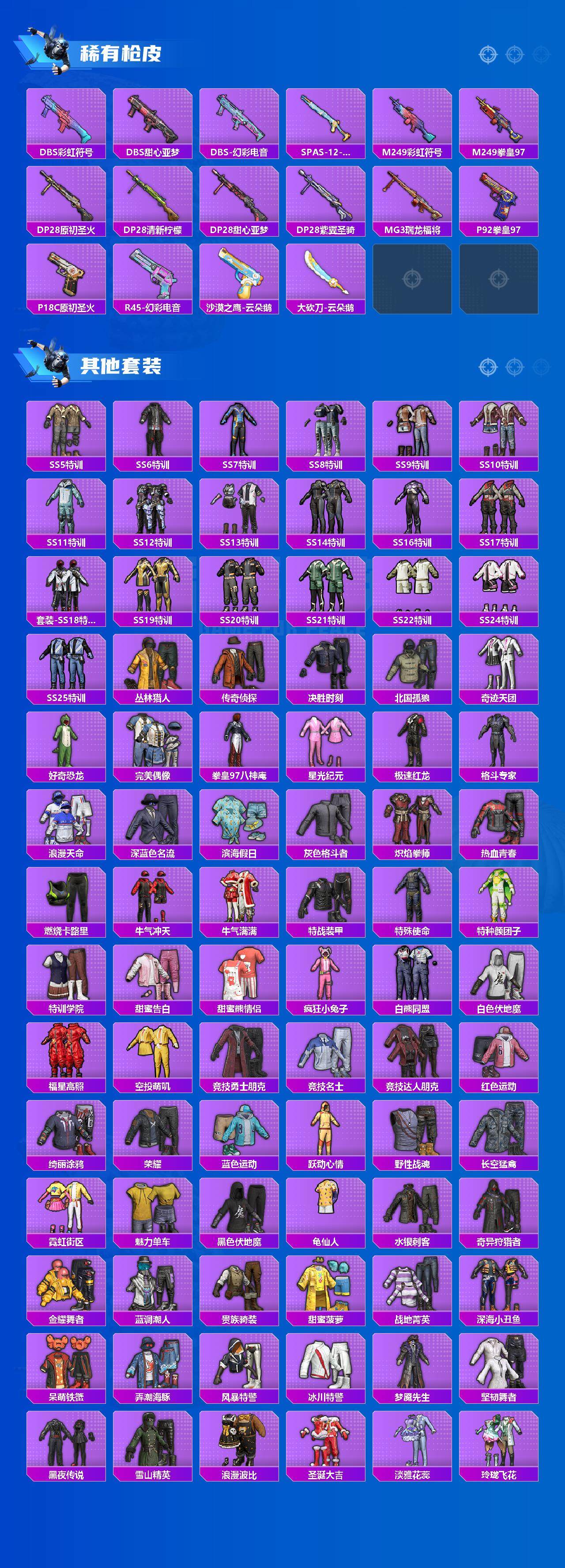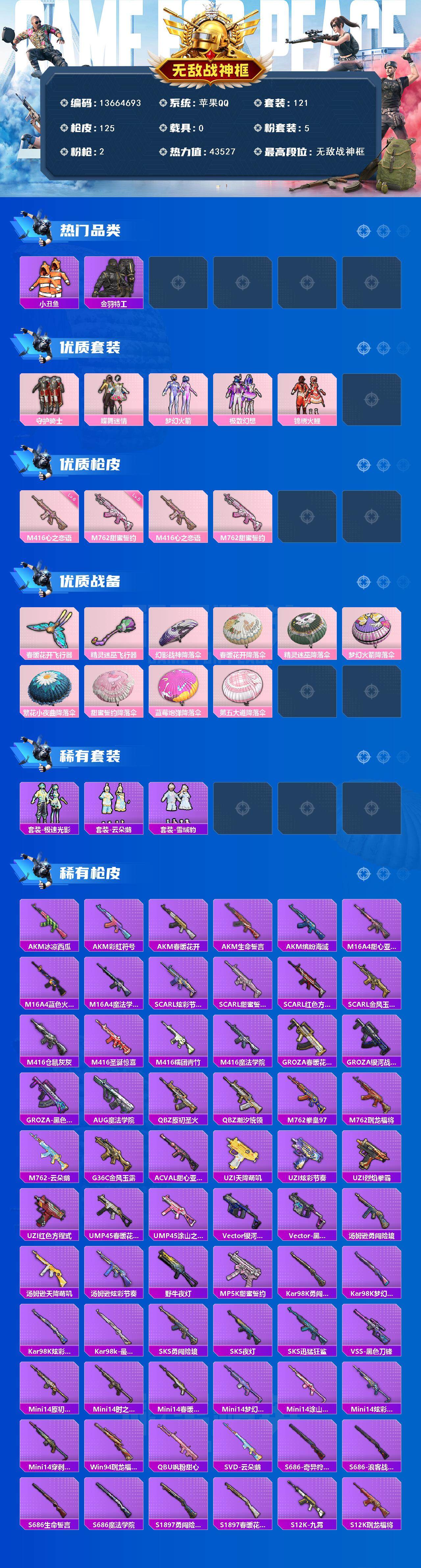 5888无敌战神43527热力值 10王牌印记【5粉装】 梦幻火箭 蝶舞迷情 守护骑士 极致幻想 锦绣火鲤 【2特效呛】 m416-心之恋语 6级 m762-甜蜜誓约 5级 121套装 125呛皮 【3稀有】 奇异狩猎者 akm-缤纷海域 浪漫天命 【2飞行器】 精灵迷巫飞行器 春暖花