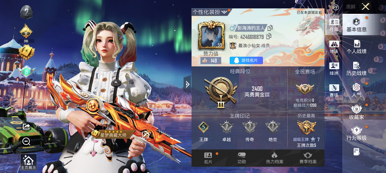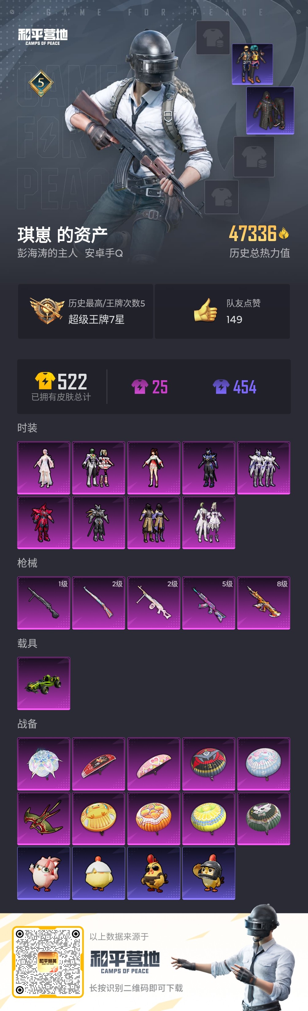 【和平精英】【txhp5224】9粉装,5特效呛,1载具,历史最高段位:超级王牌7星 王牌印记5次 热力值:47336,118套装,150呛械,151装备,77战备;套装:套装-迷蝶贵族,套装-炙焰赤龙,套装-飓风飞鹰,套装-紫电风暴,套装-灵感创作师,套装-朗月武圣,角色-小可学妹,角色-宙之时溯,角色-烟云彩露,套装-黑色伏地魔,套装-竞技名士,套装-深蓝色名流,套装-黄色名流,套装-猛禽,套装-长空猛禽,套装-竞技勇士朋克,套装-黎明保卫者,套装-贵族骑装,套装-战地督导,套装-甜蜜告白,套装-完美偶像,套装-海滨突袭者,套装-怒火燎原,套装-魅力单车,套装-竞技达人朋克,套装-野性战心,套装-都市魅力,套装-沙漠兵团,套装-雪山精英,套装-传奇侦探,套装-幻世战舞者,套装-奇异狩猎者,套装-金耀舞者,套装-蓝调潮人,套装-弄潮海豚,套装-迅捷狂鲨,套装-呆萌铁蟹,套装-深海小丑鱼,套装-滨海厨神,套装-小丑鱼,套装-梦魇先生,套装-万圣娃娃,套装-疯狂小兔子,套装-ss5特训,套装-北国孤狼,套装-ss6特训,套装-拳皇97八神庵,套装-炽焰拳师,套装-格斗专家,套装-跃动心情,套装-ss7特训,套装-霓虹街区,套装-ss8特训,套装-隐空刺,套装-抹茶蜜豆,套装-探宝勇士,套装-牛气满满,套装-诡面顽熊,套装-原初圣火,套装-逆风勇士,套装-萌趣颜团子,套装-ss12特训,套装-牛气冲天,套装-镭射皇者,套装-银白舞王,套装-耀粉歌者,套装-科技之星,套装-飞行日记,套装-ss13特训,套装-ss14特训,套装-吉莉礼服,套装-ss17特训,套装-焰山流火,角色-军刀雅典娜,套装-ss19特训,套装-飞驰魅影,套装-音速流光,套装-炫蓝之夏,套装-ss20特训,套装-甜心亚梦,套装-虚音幻奏,套装-ss21特训,套装-萌趣咩咩,套装-娇憨猪猪,套装-俏皮奶喵,套装-玉兔迎春,套装-ss22特训,套装-绯格组合,套装-ss23特训,角色-孙悟空,角色-贝吉塔,套装-白兰地假日,套装-妙红点点,套装-幻彩翩翩,套装-ss24特训,套装-荧惑魅影,角色-究极悟饭,套装-龟仙人,套装-ss25特训,套装-惊鸿侠骨,套装-锦衣飞扬,套装-深海梦境,套装-龙的传人,套装-ss26特训,套装-空岛之星,套装-焰鹰斗篷,套装-幻羽潜行,套装-ss27特训,套装-ss28特训,玩偶服-卖崽青蛙,套装-海盐绵绵冰,套装-蝶变,套装-ss29特训,套装-ss30特训,套装-ss31特训,套装-巳巳如意,套装-星影赞美诗,套装-薄荷星砂;呛皮:aug-耀粉歌者,aug-天降萌叽,aug-乌木金纹,groza-生命誓言,groza-春暖花开,groza-治愈之星,groza-彩虹符号,groza-乌木金纹,g36c-古战神甲,g36c-乌木金纹,mk47-乌木金纹,mk47-妙红点点,5级akm-炫紫旋律,akm-灼热熔岩,akm-破晓战魂,akm-霓虹街区,akm-夜灯,akm-彩虹符号,akm-萌趣颜团子,akm-环太平洋,akm-龙的传人,m762-奇异狩猎者,m762-拳皇97,m762-牛气冲天,m762-镭射皇者,m16a4-红色方程式,m16a4-甜心亚梦,8级m416-至情至圣,m416-红色方程式,m416-糯团青竹,m416-乌木金纹,q-原初圣火,q-彩虹符号,q-飞驰魅影,scar-l-生命誓言,scar-l-红色方程式,scar-l-炫彩节奏,scar-l-玉兔迎春,scar-l-海盐豹豹,ac-val-甜心亚梦,ac-val-乌木金纹,ac-val-天降萌叽,蜜獾-娇憨猪猪,蜜獾-垂柳戏鸭,蜜獾-精灵梦叶罗丽,2级kar98k-巳巳如意,kar98k-红色方程式,kar98k-彩虹符号,kar98k-炫彩节奏,kar98k-飞驰魅影,m24-奇异狩猎者,m24-治愈之星,m24-乌木金纹,amr-妙红点点,amr-乌木金纹,莫辛纳甘-乌木金纹,awm-焰鹰斗篷,awm-乌木金纹,m200-惊鸿侠骨,mk14-童趣迷兔,mk14-乌木金纹,mini14-原初圣火,mini14-炫彩节奏,mini14-旋转彩虹,slr-娇憨猪猪,sks-迅猛狂鲨,sks-炫彩节奏,m417-惊鸿侠骨,vss-镭射皇者,vss-香桃花海,mk20-h-乌木金纹,p90-飞驰魅影,p90-玩趣呆呆,p90-乌木金纹,野牛-乌木金纹,汤姆逊-奇异狩猎者,汤姆逊-耀粉歌者,汤姆逊-古战神甲,汤姆逊-乌木金纹,mp5k-乌木金纹,vect-生命誓言,vect-彩虹符号,vect-治愈之星,vect-焰鹰斗篷,vect-乌木金纹,ump45-生命誓言,ump45-诡娃娃,uzi-红色方程式,uzi-娇憨猪猪,s686-红色方程式,s686-奇异狩猎者,s686-生命誓言,s686-乌木金纹,s12k-破晓战魂,s12k-娇憨猪猪,s12k-垂柳戏鸭,s12k-幻世战舞者,s1897-镭射皇者,s1897-炫彩节奏,s1897-飞驰魅影,s1897-乌木金纹,dbs-甜心亚梦,dbs-彩虹甜喵,dbs-焰鹰斗篷,dbs-乌木金纹,spas-12-乌木金纹,1级dp-28-豹影疾电,dp-28-原初圣火,dp-28-古战神甲,dp-28-甜心亚梦,dp-28-焰鹰斗篷,mg3-瑞龙福将,mg3-幻世战舞者,mg3-乌木金纹,mg3-妙红点点,mg3-惊鸿侠骨,m249-拳皇97,m249-镭射皇者,m249-彩虹符号,m249-糯团青竹,m249-妙红点点,m249-乌木金纹,2级pkm-江南烟雨,pkm-小鹦鹉bebe,p18c-原初圣火,r1895-六号树人,tmp-9-江南烟雨,p92-拳皇97,平底锅-拳皇97,平底锅-原初圣火,平底锅-镭射皇者,平底锅-阿狸红,平底锅-治愈之星,平底锅-飞驰魅影,平底锅-甜心亚梦,平底锅-娇憨猪猪,平底锅-翩跹演武,平底锅-妙红点点,平底锅-惊鸿侠骨,平底锅-空岛之星,平底锅-焰鹰斗篷,平底锅-无垠阁,撬棍-传奇侦探,撬棍-环太平洋,撬棍-幻世战舞者,大砍刀-古战神甲,大砍刀-万古烈焰,破片手留单-胡桃卫兵,突击盾牌-万古烈焰,爆炸猎弓-惊鸿侠骨;载具:合金龙骨(绿);降落伞:翩跹演武飞行器,粉色滑翔尾迹,红色滑翔尾迹; 详情看图5王牌印记 4.7w热力值 9粉(深海小丑鱼 奇异狩猎者)5特(8级至情)1车(合金龙骨)