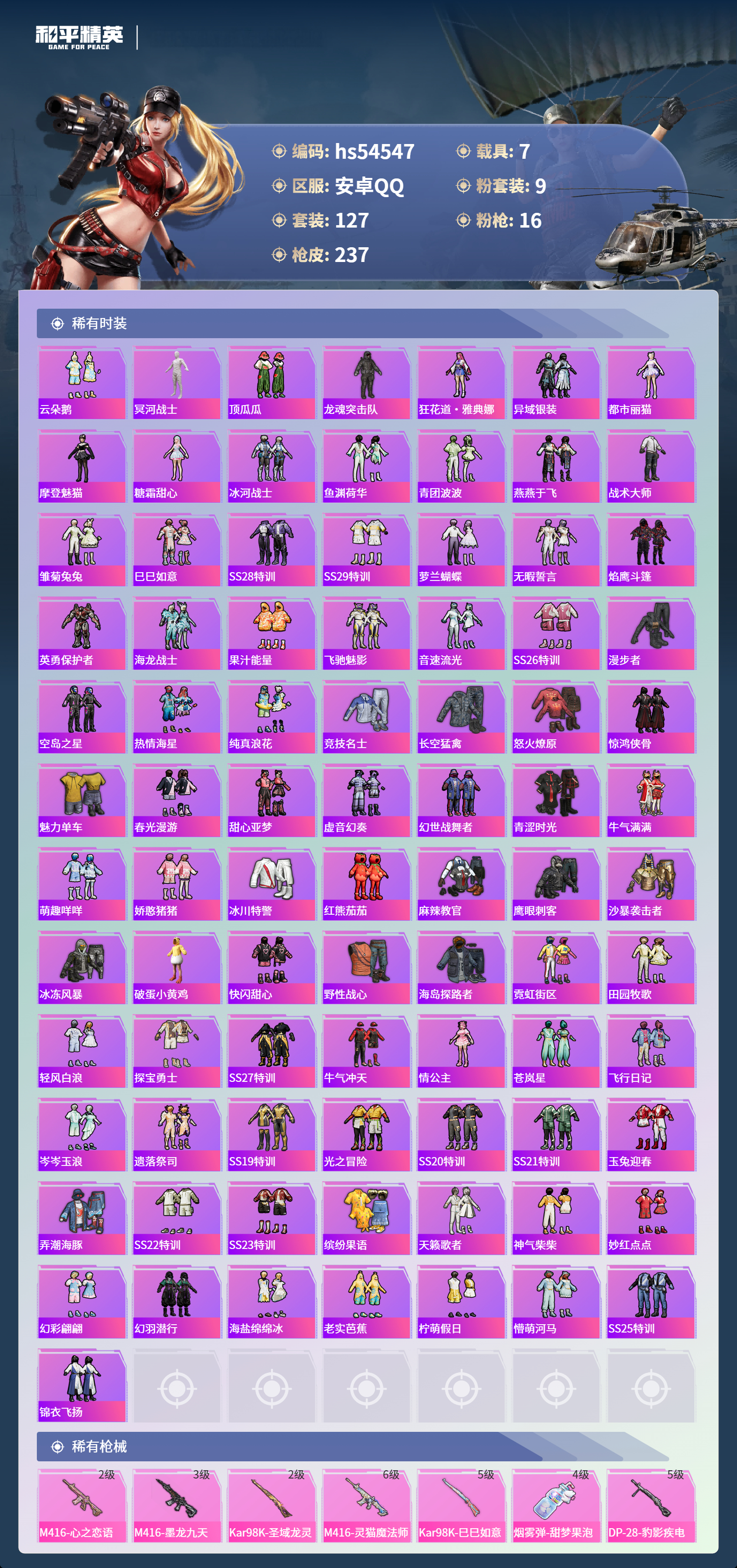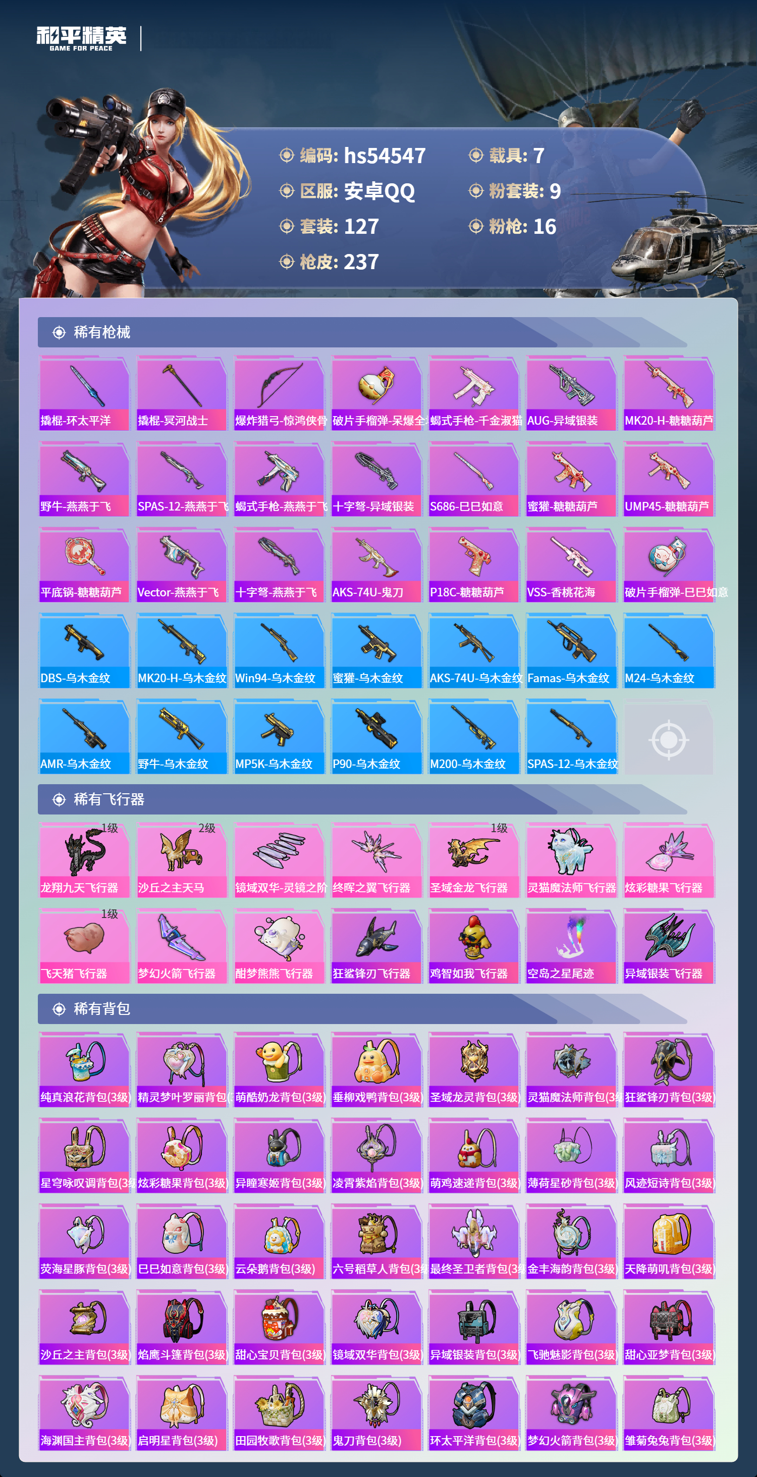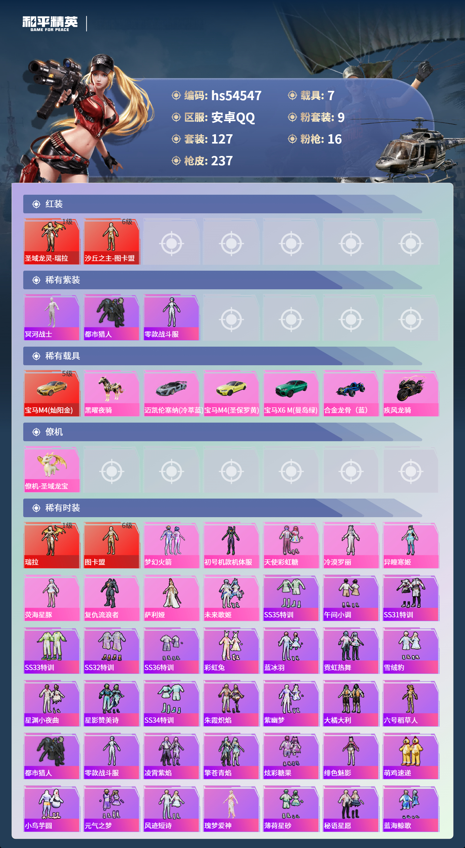 hs54547 安卓手q-14王牌印记-有战神框-2红装-9粉装-16特效呛-7载具-热力值-127套装-237呛皮-3卓越印记-2传奇印记【2红装】圣域龙灵-瑞拉/1级沙丘之主-图卡盟/6级【9粉装】套装-天使彩虹糖角色-荧海星豚套装-梦幻火箭套装-未来歌姬角色-冷漠罗丽角色-异瞳寒姬角色-复仇流浪者角色-初号机款机体服角色-萨利娅【16特效呛】m416-灵猫