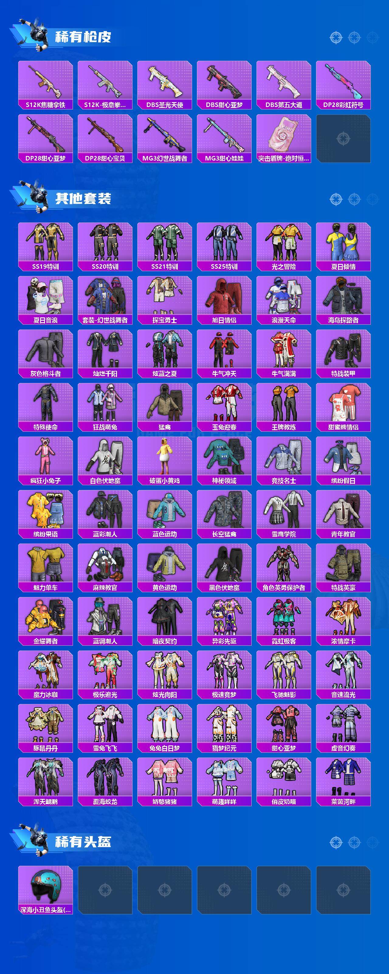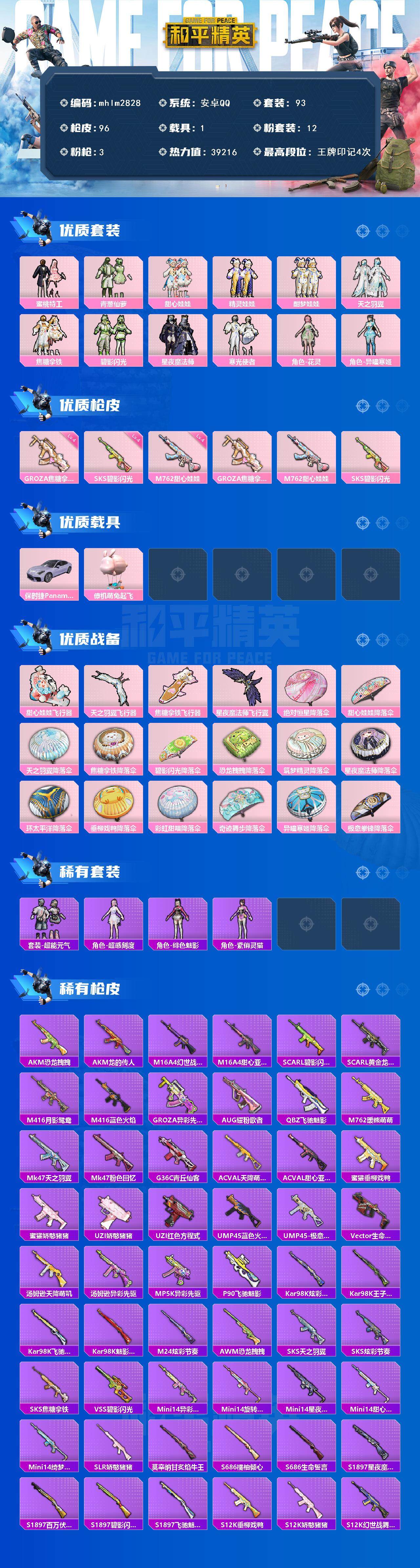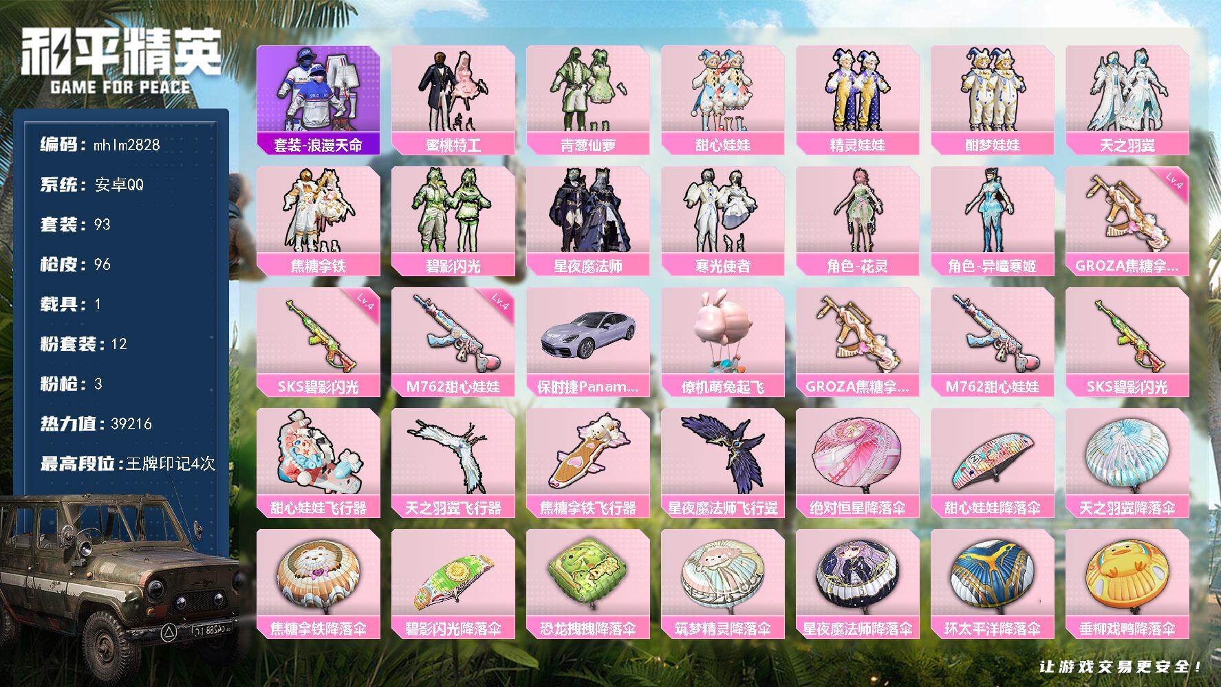 [14917945]【mhlm2828】安卓 手q-12粉装-3特效呛-1载具-5粉色飞行器-39216热力值-4王牌印记-93套装-96呛皮 【热门品类】:套装-浪漫天命 【粉色套装】:粉装-蜜桃特工,粉装-青葱仙萝,粉装-甜心娃娃,粉装-精灵娃娃,粉装-酣梦娃娃,粉装-天之羽翼,粉装-焦糖拿铁,粉装-碧影闪光,粉装-星夜魔法师,粉装-寒光使者,角色-花灵,角色-异瞳寒姬 【粉色呛皮等级】:groza-焦糖拿铁四级,m762-甜心娃娃四级,sks-碧影闪光四级 【粉色载具】:保时捷panamera(星辰紫),僚机-萌兔起飞 【粉色呛皮】:groza-焦糖拿铁,m762-甜心娃娃,sks-碧影闪光 【粉色飞行器】:甜心娃娃飞行器,天之羽翼飞行器,焦糖拿铁飞行器,星夜魔法师飞行翼 【粉色降落伞】:绝对恒星降落伞,甜心娃娃降落伞,天之羽翼降落伞,焦糖拿铁降落伞,碧影闪光降落伞,恐龙拽拽降落伞,筑梦精灵降落伞,星夜魔法师降落伞,环太平洋降落伞,垂柳戏鸭降落伞,彩虹甜喵降落伞,奇迹舞步降落伞,异瞳寒姬降落伞,极意拳锋降落伞 【稀有套装】:套装-超能元气,角色-超感刻度,套装-雪国风尚,角色-绯色魅影,角色-紫俏灵猫,套装-炫彩糖果,角色-镜光械姬 【稀有呛皮】:s12k-镜光械姬,aug-冰晶雪宝,scar-l-镜光械姬,akm-恐龙拽拽,akm-龙的传人,m16a4-幻世战舞者,m16a4-甜心亚梦,scar-l-碧影闪光,scar-l-黄金龙骨,m416-月影鸳鸯,m416-蓝色火焰,groza-异彩先驱,aug-耀粉歌者,q-飞驰魅影,m762-暖熊萌萌,mk47-天之羽翼,mk47-粉色回忆,g36c-青丘仙客,ac-val-天降萌叽,ac-val-甜心亚梦,蜜獾-垂柳戏鸭,蜜獾-娇憨猪猪,uzi-娇憨猪猪,uzi-红色方程式,ump45-蓝色火焰,ump45-极意拳锋,vect-生命誓言,汤姆逊-天降萌叽,汤姆逊-异彩先驱,mp5k-异彩先驱,p90-飞驰魅影,kar98k-炫彩节奏,kar98k-王子的夏天,kar98k-飞驰魅影,kar98k-魅影蝠王,m24-炫彩节奏,awm-恐龙拽拽,sks-天之羽翼,sks-炫彩节奏,sks-焦糖拿铁,vss-碧影闪光,mini14-异彩先驱,mini14-旋转彩虹,mini14-星夜魔法师,mini14-甜心娃娃,m