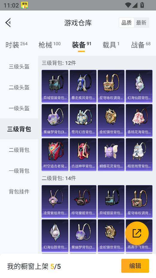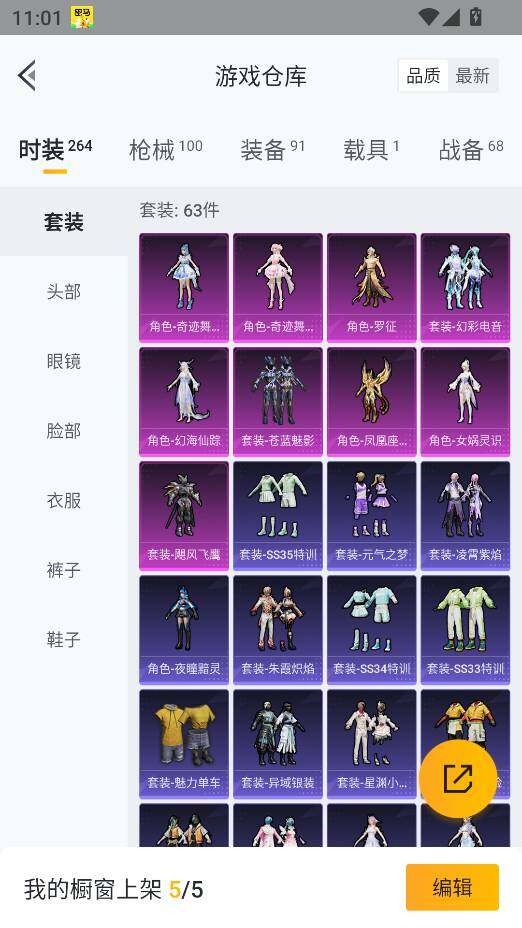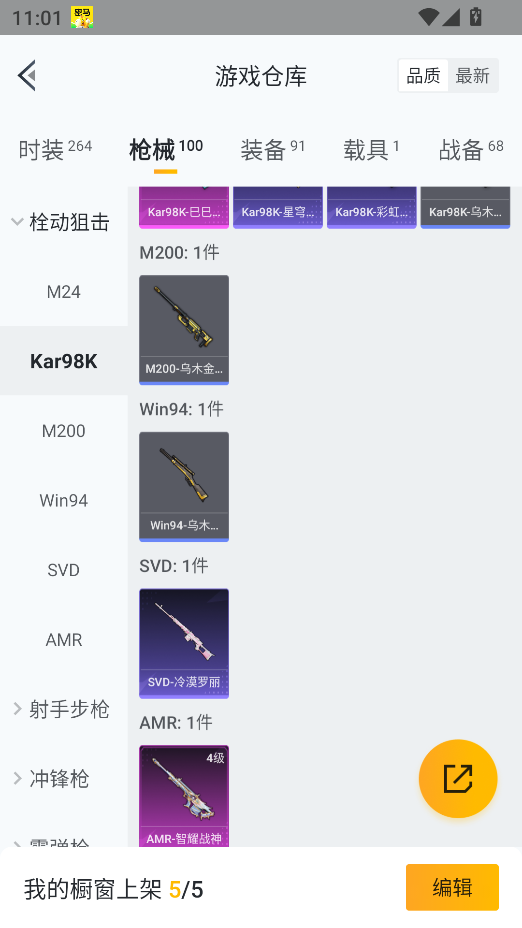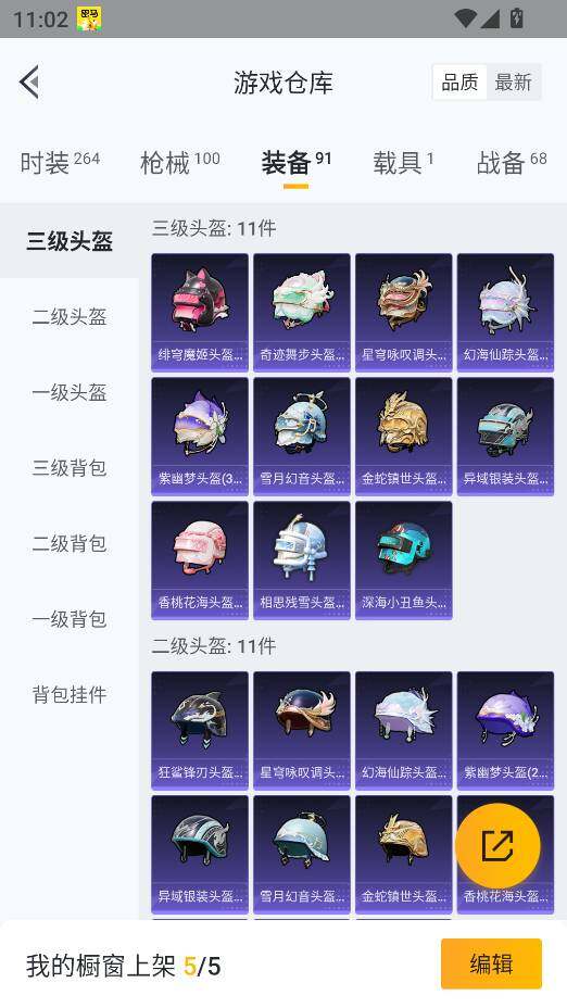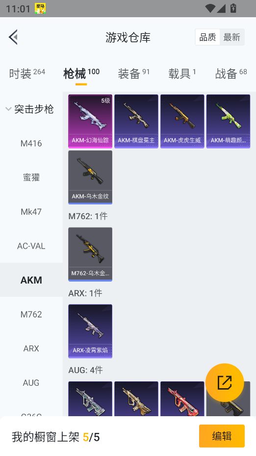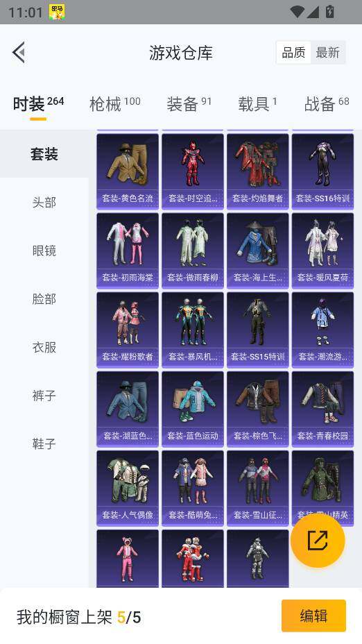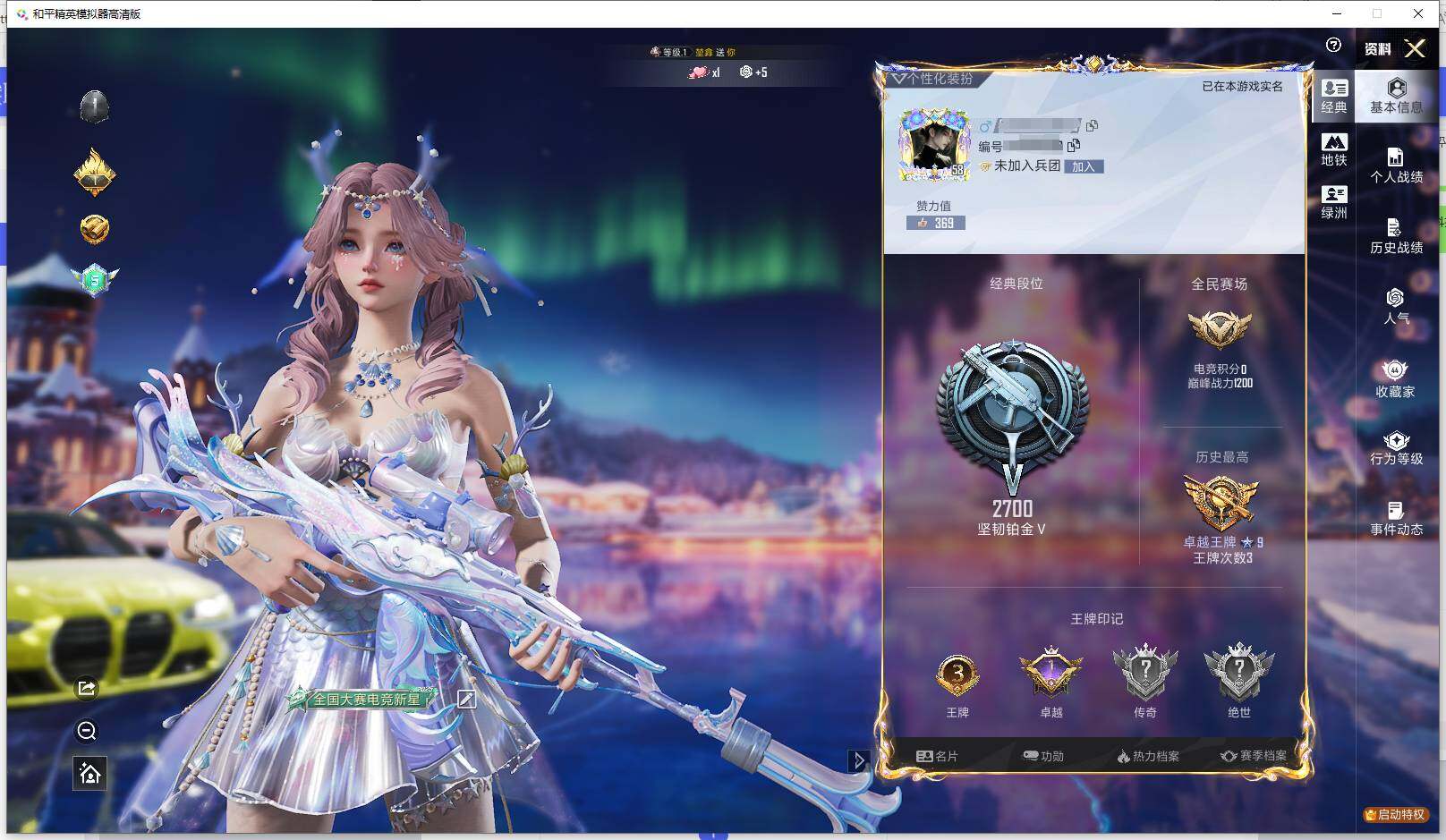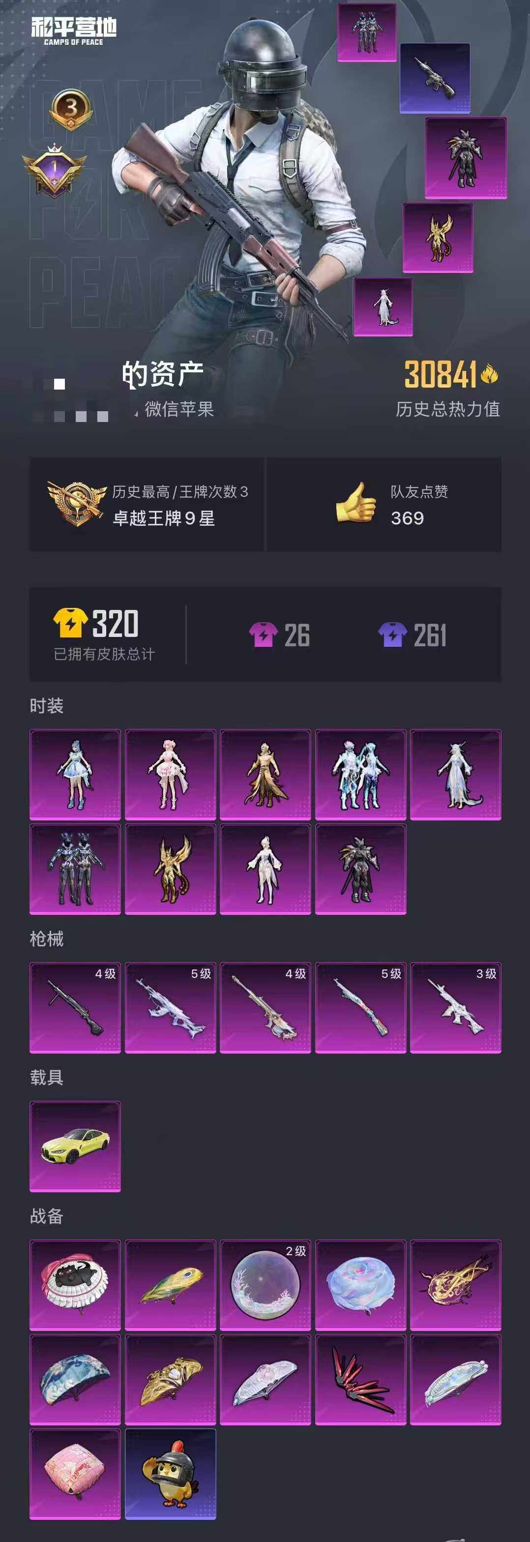 [14921333]实名: 可修改 时装数: 264 载具数: 1 呛械数: 100 战备数: 68 热门装扮: 苍蓝魅影飓风飞鹰女娲灵识凤凰座 一辉幻海仙踪幻彩电音罗征 载具: 宝马m4圣保罗黄 稀有呛皮: akm-幻海仙踪五级,m416-女娲灵识三级,kar98k-巳巳如意五级,amr-智耀战神四级,dp-28-豹影疾电四级