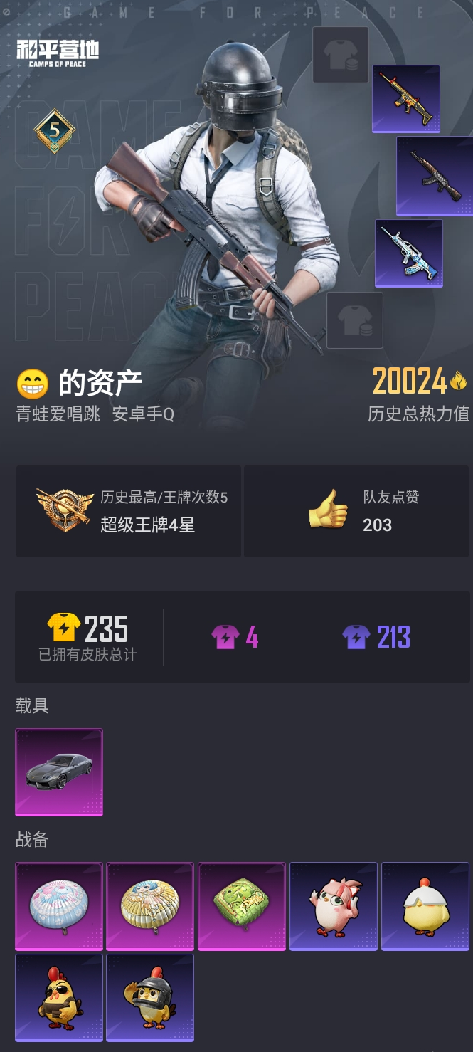 【和平精英】【lyhp18489】1载具 0粉装,0特效呛,1载具,历史最高段位:超级王牌4星 王牌印记5次 热力值:20024,57套装,74呛械,57装备,34战备;套装:套装-红色运动,套装-黑色伏地魔,套装-骑行爱好者,套装-竞技名士,套装-猛禽,套装-长空猛禽,套装-滨海假日,套装-人气偶像,套装-蓝彩潮人,套装-魅力单车,套装-都市漫游者,套装-破晓战魂,套装-酷潮明星,套装-幻世战舞者,套装-甜蜜菠萝,套装-甜蜜熊情侣,套装-冰川特警,套装-格斗先锋,套装-麻辣教官,套装-粉红小猪,套装-破蛋小黄鸡,套装-夏日音浪,套装-风华少年志,套装-探宝勇士,套装-牛气满满,套装-战术大师,套装-牛气冲天,套装-ss18特训,套装-耀粉歌者,套装-飞行日记,套装-ss17特训,套装-瑞龙福将,套装-团圆交子,套装-焰山流火,套装-极乐追光,套装-虎虎生威吉莉,套装-异彩先驱,套装-霓虹极客,套装-空投萌叽,套装-ss19特训,套装-飞驰魅影,套装-音速流光,套装-炫蓝之夏,套装-ss20特训,套装-ss21特训,套装-玉兔迎春,套装-ss22特训,套装-光之冒险,套装-ss23特训,套装-柠萌假日,套装-ss24特训,套装-龟仙人,套装-ss25特训,套装-龙的传人,套装-ss26特训,套装-空岛之星,套装-老实芭蕉;呛皮:akm-灼热熔岩,akm-荒野猎神,akm-彩虹符号,akm-虎虎生威,akm-龙的传人,蜜獾-天降萌叽,q-神秘黑猫,q-洛神天依,q-飞驰魅影,aug-耀粉歌者,aug-天降萌叽,scar-l-红色方程式,scar-l-流星咚咚,scar-l-玉兔迎春,scar-l-海盐豹豹,m16a4-幻世战舞者,m762-瑞龙福将,m762-天降萌叽,mk47-乌木金纹,groza-异彩先驱,m416-蓝色火焰,m416-糯团青竹,ac-val-乌木金纹,ac-val-天降萌叽,g36c-乌木金纹,kar98k-炫彩节奏,kar98k-洛神天依,kar98k-飞驰魅影,m24-炫彩节奏,m24-乌木金纹,amr-乌木金纹,awm-音爆索尼克,win94-瑞龙福将,莫辛纳甘-乌木金纹,mini14-春暖花开,mini14-异彩先驱,mini14-筑梦精灵,mini14-旋转彩虹,sks-天之羽翼,vss-彩虹符号,mk14-乌木金纹,p90-飞驰魅影,p90-玩趣呆呆,p90-乌木金纹,ump45-蓝色火焰,ump45-生命誓言,野牛-乌木金纹,uzi-红色方程式,uzi-天降萌叽,mp5k-蓝莓炮弹,mp5k-异彩先驱,mp5k-乌木金纹,vect-生命誓言,汤姆逊-炫彩节奏,汤姆逊-异彩先驱,s1897-炫彩节奏,s1897-飞驰魅影,s686-生命誓言,s12k-瑞龙福将,s12k-幻世战舞者,m249-彩虹符号,m249-糯团青竹,mg3-瑞龙福将,mg3-幻世战舞者,mg3-乌木金纹,dp-28-彩虹符号,平底锅-瑞龙福将,平底锅-空投萌叽,平底锅-异彩先驱,平底锅-飞驰魅影,平底锅-光之冒险,平底锅-空岛之星,撬棍-环太平洋,破片手留单-呆爆全场;载具:兰博基尼estoque银翼灰;降落伞:空岛之星尾迹; 详情看图
