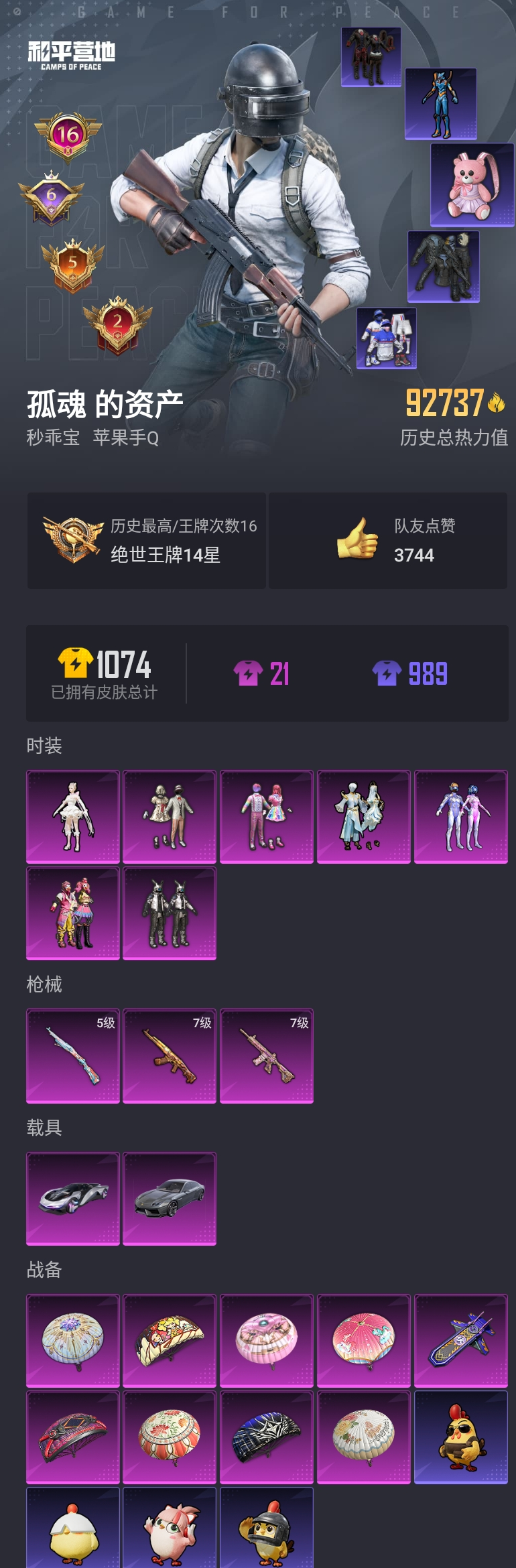 【和平精英】【lyhp18612】16印记 7粉3特2载具 粉熊包 都市 哥特 天命 蓝螳螂 猪妹 彩虹 奶油 火箭 满级ak巧克力 满级m4心之恋语 金羽特工 7粉装,3特效呛,2载具,历史最高段位:绝世王牌14星 王牌印记16次 热力值:92737,223套装,293呛械,353装备,173战备;套装:套装-数码大师,套装-宝贝奶油派,套装-天使彩虹糖,套装-梦幻火箭,套装-缤纷油彩,套装-金丰海韵,角色-千金淑猫,套装-特训学院,套装-猎鹰,套装-青年教官,套装-橘黑制服,套装-红色运动,套装-蓝色运动,套装-黄色伏地魔,套装-白色伏地魔,套装-黑色伏地魔,套装-竞技名士,套装-深蓝色名流,套装-酒红色名流,套装-湖蓝色名流,套装-黄色名流,套装-猛禽,套装-长空猛禽,套装-漫步者,套装-竞技勇士朋克,套装-黎明保卫者,套装-海岛探路者,套装-雨林探路者,套装-旭日情侣,套装-六六大吉,套装-冷焰舞者,套装-灼焰舞者,套装-都市猎人,套装-浪漫天命,套装-特战装甲,套装-贵族骑装,套装-战地督导,套装-街舞达人,套装-灰色格斗者,套装-龙腾端午,套装-滨海假日,套装-鹰眼刺客,套装-冰冻风暴,套装-完美偶像,套装-人气偶像,套装-幻影武者,套装-街头潮人,套装-蓝彩潮人,套装-千禧之恋,套装-神秘领域,套装-魅力单车,套装-绮丽涂鸦,套装-狂战萌兔,套装-坚韧舞者,套装-竞技达人朋克,套装-野性战心,套装-金羽特工,套装-狂沙舞者,套装-破晓战魂,套装-森林游猎者,套装-都市魅力,套装-荣耀,套装-热血青春,套装-沙漠兵团,套装-雪山精英,套装-酷潮明星,套装-传奇侦探,套装-幻世战舞者,套装-金耀舞者,套装-蓝调潮人,套装-暗影哥特,套装-青涩时光,套装-缤纷果语,套装-龙魂突击队,套装-冰川特警,套装-元素星魂,套装-极速红龙,套装-海上生明月,套装-麻辣教官,套装-破蛋小黄鸡,套装-疯狂小兔子,套装-机械英豪,套装-机械征服者,套装-ss5特训,套装-军械专家,套装-北国孤狼,套装-ss6特训,套装-拳皇97草薙京,套装-炽焰拳师,套装-格斗专家,套装-云纹魔法士,套装-跃动心情,套装-ss7特训,套装-黑色刀锋,套装-银河圣歌,套装-鹤鸣,套装-霓虹街区,套装-ss10特训,套装-ss8特训,套装-众神之王,套装-智慧之神,套装-神秘黑猫,套装-萌黄之夏,套装-ss9特训,套装-风华少年志,套装-白月香洋装,套装-神秘舞者,套装-探宝勇士,套装-牛气满满,套装-ss11特训,套装-怪笑疯兔,套装-青春冒险家,套装-潮流游乐家,套装-朱雀圣者,套装-原初圣火,套装-逆风勇士,套装-萌趣颜团子,套装-特种颜团子,套装-战术大师,套装-ss12特训,套装-牛气冲天,套装-ss18特训,套装-镭射皇者,套装-银白舞王,套装-耀粉歌者,套装-迅捷之星,套装-治愈之星,套装-科技之星,套装-飞行日记,套装-ss13特训,套装-竞技角斗士,套装-曼妙人鱼,套装-热情海星,套装-纯真浪花,套装-浪漫樱花,套装-ss14特训,套装-吉莉礼服,套装-ss15特训,套装-ss16特训,套装-暴风机械师,套装-时空追击者,套装-ss17特训,套装-瑞龙福将,套装-团圆交子,套装-爆裂葡萄,套装-炫光向阳,套装-福星高照,套装-虎虎生威吉莉,套装-缤纷焰火,套装-异彩先驱,套装-霓虹极客,套装-空投萌叽,套装-ss19特训,套装-极速竞梦,套装-飞驰魅影,套装-音速流光,套装-炫蓝之夏,套装-ss20特训,套装-猎梦纪元,套装-甜心亚梦,套装-虚音幻奏,套装-ss21特训,套装-萌趣咩咩,套装-娇憨猪猪,套装-酸甜橘柚,套装-玉兔迎春,套装-ss22特训,套装-和煦暖阳,套装-田园牧歌,套装-轻风白浪,套装-光之冒险,套装-ss23特训,套装-香榭午后,套装-灵蜜圈圈,套装-妙红点点,套装-幻彩翩翩,套装-王牌教练,套装-柠萌假日,套装-青玉碎影,套装-ss24特训,套装-龟仙人,套装-涂山之恋,套装-ss25特训,套装-香桃花海,套装-龙的传人,套装-冰河战士,套装-ss26特训,套装-空岛之星,套装-ss27特训,套装-恋语绒绒,套装-老实芭蕉,套装-ss28特训,套装暗影刺翼,角色-mark.06,套装-街头风暴,套装-海盐绵绵冰,套装-蝶变,套装-小熊娃娃,套装-ss29特训,套装-雏菊兔兔,套装-萝兰蝴蝶,套装-火种守卫者,套装-异域银装,套装-星途旅人,角色-俏兔智灵,套装-ss30特训,套装-青团波波,套装-棉花软糖,套装-糖糖葫芦,套装-ss31特训,套装-鱼渊荷华,套装-燕燕于飞,套装-智谋强哥,套装-紫幽梦,套装-粉恋花,套装-ss33特训,套装-巳巳如意,套装-ss32特训,套装-风舞幻音,套装-蓝冰羽,套装-大橘大利,套装-ss36特训,套装-雪国风尚;呛皮:aug-甜蜜菠萝,aug-耀粉歌者,aug-青春冒险家,aug-焰龙焚天,aug-天降萌叽,aug-乌木金纹,groza-影袭,groza-生命誓言,groza-黑色刀锋,groza-治愈之星,groza-彩虹符号,groza-蓝莓炮弹,groza-异彩先驱,groza-田园牧歌,groza-海盐豹豹,groza-乌木金纹,q-神秘黑猫,q-原初圣火,q-赛罗,q-彩虹符号,q-电玩视界,q-洛神天依,q-飞驰魅影,q-纯真浪花,q-乌木金纹,m762-奇异狩猎者,m762-甜心宝贝,m762-拳皇97,m762-牛气冲天,m762-镭射皇者,m762-瑞龙福将,m762-天降萌叽,m762-雏菊兔兔,m762-乌木金纹,7级akm-甜心宝贝,akm-灼热熔岩,akm-生命誓言,akm-影袭,akm-玉龙,akm-冰凉西瓜,akm-奇异狩猎者,akm-破晓战魂,akm-霓虹街区,akm-夜灯,akm-彩虹符号,akm-萌趣颜团子,akm-虎虎生威,akm-龙的传人,akm-乌木金纹,scar-l-红色方程式,scar-l-黄金龙骨,scar-l-炫彩节奏,scar-l-玉兔迎春,scar-l-星途旅人,scar-l-海盐豹豹,scar-l-乌木金纹,g36c-不夜海上花,g36c-时空追击者,g36c-乌木金纹,7级m416-心之恋语,m416-夜灯,m416-蓝色火焰,m416-绯红前夜,m416-红色方程式,m416-神秘黑猫,m416-梨园星光,m416-糯团青竹,m416-乌木金纹,m16a4-蓝色火