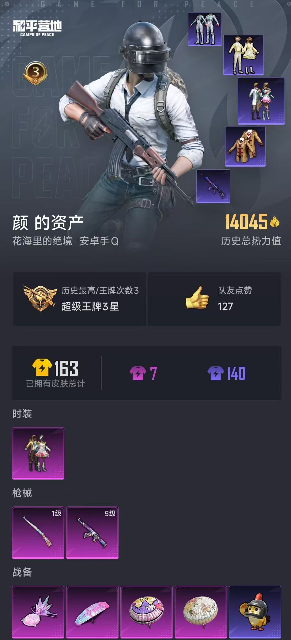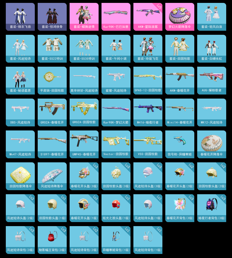 【和平精英】【lyhp18366】1粉装2特效呛 蝶舞迷情 5级星际浪客akm 1粉装,2特效呛,0载具,历史最高段位:超级王牌3星 王牌印记3次 热力值:14045,34套装,51呛械,47装备,20战备;套装:套装-蝶舞迷情,套装-特训学院,套装-竞技名士,套装-长空猛禽,套装-冷焰舞者,套装-甜蜜告白,套装-蓝彩潮人,套装-魅力单车,套装-夏日倾情,套装-缤纷果语,套装-青涩年华,套装-疯狂小兔子,套装-玲珑飞花,套装-战术大师,套装-吉莉礼服,套装-ss22特训,套装-田园牧歌,套装-轻风白浪,套装-白啸长虹,套装-光之冒险,套装-绯格组合,套装-王牌教练,套装-青玉碎影,套装-惊鸿侠骨,套装-锦衣飞扬,套装-龙的传人,套装-星途旅人,套装-ss31特训,套装-炫彩糖果,套装-ss35特训,套装-午间小调,套装-秘语星愿,套装-风迹短诗,套装-萌鸡速递;呛皮:m416-暗夜行者,蜜獾-天降萌叽,蜜獾-风迹短诗,5级akm-星际浪客,akm-春暖花开,akm-龙的传人,aug-耀粉歌者,aug-天降萌叽,aug-冰晶雪宝,scar-l-炫彩节奏,ac-val-天降萌叽,groza-春暖花开,groza-田园牧歌,mk47-风迹短诗,m200-惊鸿侠骨,m200-乌木金纹,1级kar98k-巳巳如意,kar98k-梦幻火箭,kar98k-炫彩节奏,m24-乌木金纹,莫辛纳甘-风迹短诗,win94-乌木金纹,mini14-春暖花开,mini14-炫彩节奏,mini14-香桃花海,vss-田园牧歌,vss-香桃花海,mk14-紫晶流影,slr-霓彩脉冲,mk12-风迹短诗,m417-惊鸿侠骨,vect-田园牧歌,p90-巳巳如意,p90-乌木金纹,ump45-生命誓言,ump45-春暖花开,uzi-炫彩糖果,dbs-风迹短诗,s12k-玩趣呆呆,s1897-春暖花开,spas-12-田园牧歌,spas-12-乌木金纹,mg3-幻世战舞者,mg3-乌木金纹,mg3-惊鸿侠骨,信号呛-异瞳寒姬,平底锅-田园牧歌,平底锅-光之冒险,平底锅-惊鸿侠骨,爆炸猎弓-惊鸿侠骨,铝热弹-炫彩糖果;降落伞:炫彩糖果飞行器; 详情看图