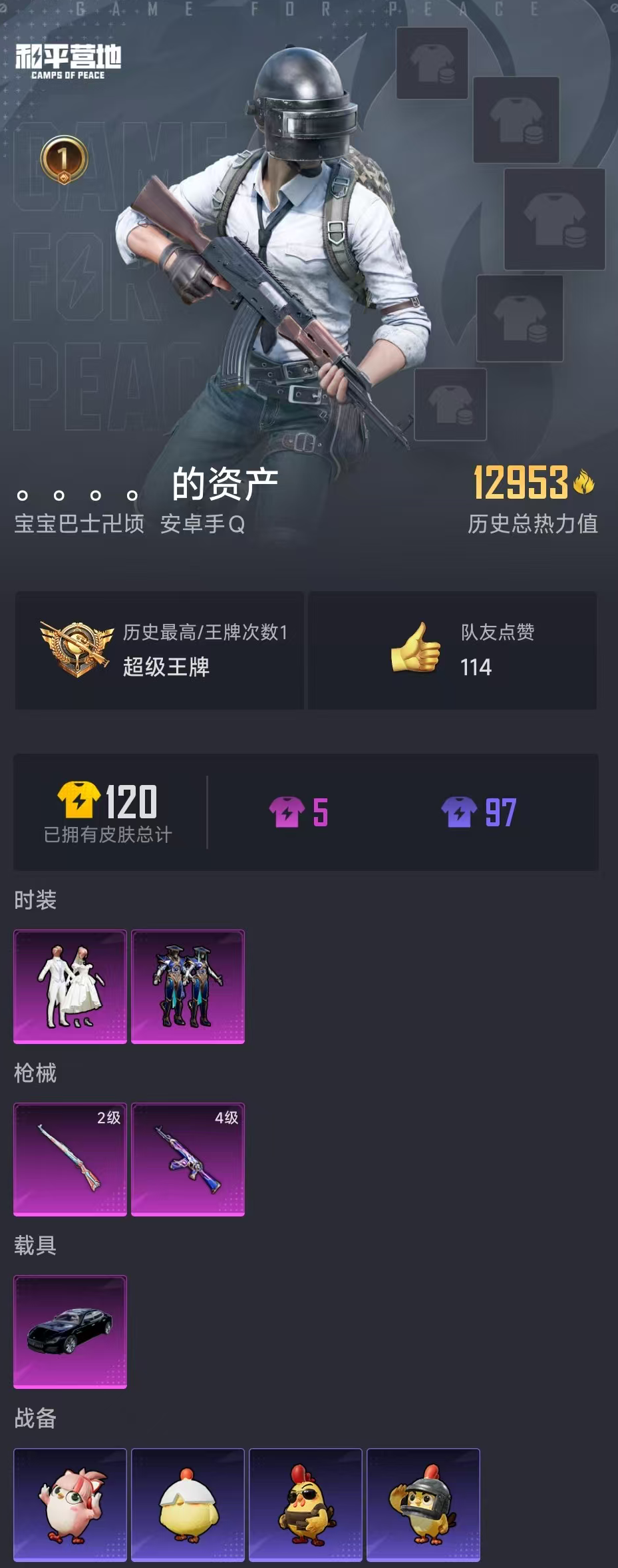 【和平精英】【lyhp18344】2粉装2特效呛1载具 4级星际浪客akm 玛莎拉蒂 2粉装,2特效呛,1载具,历史最高段位:超级王牌 王牌印记1次 热力值:12953,30套装,44呛械,22装备,14战备;套装:套装-碧穹智者,套装-心之回忆,套装-红色运动,套装-骑行爱好者,套装-竞技名士,套装-长空猛禽,套装-蓝色守护者,套装-冷焰舞者,套装-魅力单车,套装-缤纷果语,套装-极速红龙,套装-粉红小猪,套装-耀粉歌者,套装-ss22特训,套装-ss23特训,套装-王牌教练,套装-ss24特训,套装-ss25特训,套装-香桃花海,套装-恋语绒绒,套装-ss29特训,套装-星途旅人,套装-ss30特训,套装-ss31特训,套装-ss33特训,套装-ss32特训,套装-顶瓜瓜,套装-大橘大利,套装-ss34特训,套装-ss36特训;呛皮:aug-耀粉歌者,aug-异域银装,蜜獾-天降萌叽,蜜獾-乌木金纹,q-彩虹符号,scar-l-炫彩节奏,scar-l-星途旅人,4级akm-星际浪客,akm-彩虹符号,akm-虎虎生威,m762-天降萌叽,m416-红色方程式,m416-糯团青竹,ac-val-乌木金纹,ac-val-天降萌叽,g36c-星穹咏叹调,g36c-乌木金纹,famas-乌木金纹,2级kar98k-巳巳如意,m200-乌木金纹,莫辛纳甘-乌木金纹,mini14-炫彩节奏,mini14-香桃花海,mk20-h-星途旅人,mk20-h-乌木金纹,vss-香桃花海,sks-炫彩节奏,m417-玩趣呆呆,slr-彩虹符号,uzi-天降萌叽,uzi-啾咪啾咪,ump45-夜灯,ump45-生命誓言,ump45-海盐豹豹,野牛-乌木金纹,aks-74u-乌木金纹,p90-乌木金纹,spas-12-乌木金纹,s686-生命誓言,mg3-幻世战舞者,mg3-乌木金纹,平底锅-光之冒险,十子怒-异域银装,破片手留单-星途旅人;载具:玛莎拉蒂quattropte夜幕蓝;降落伞:顶峰精英尾迹,破刃行动尾迹; 详情看图