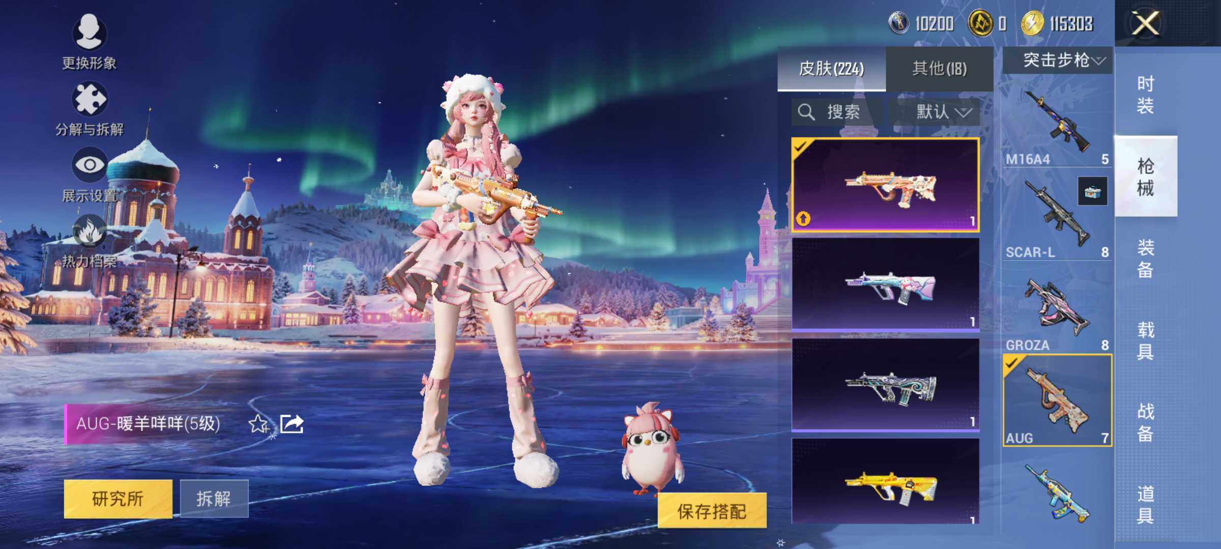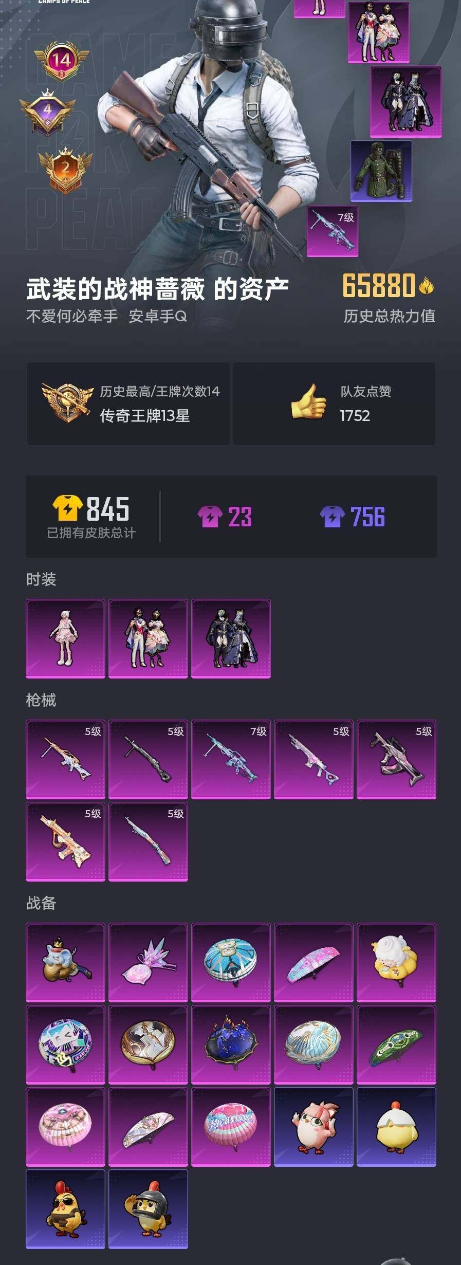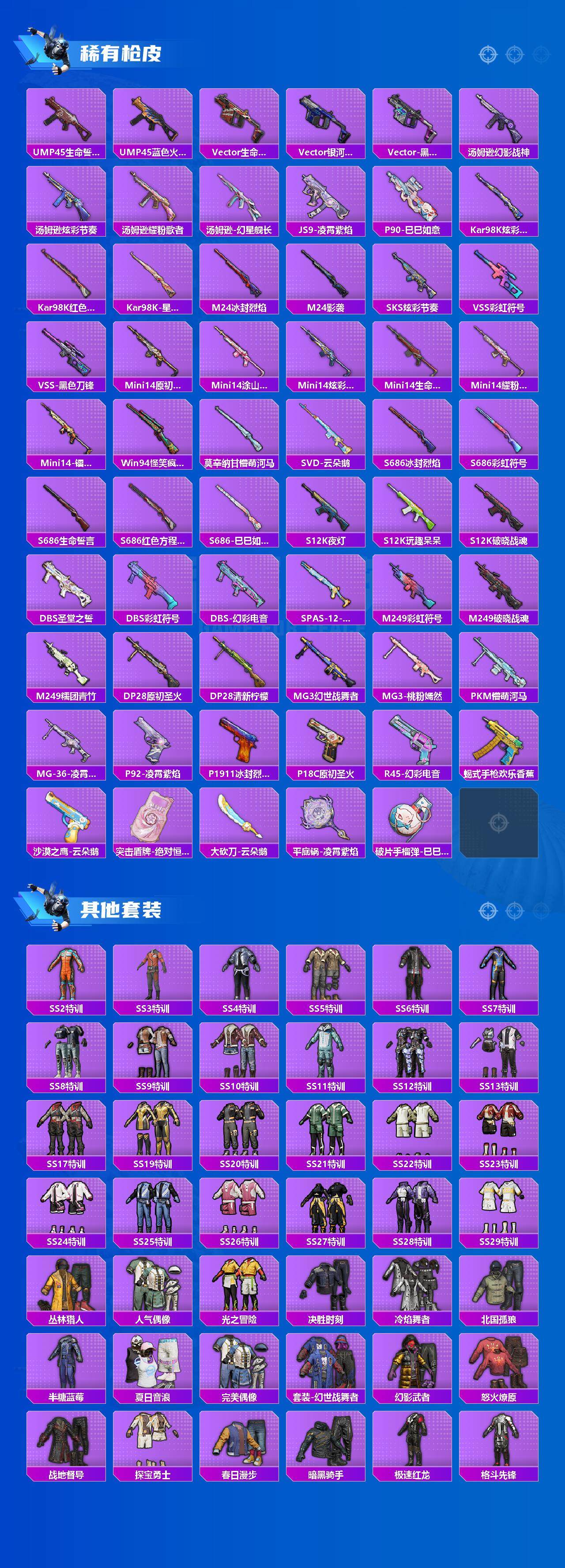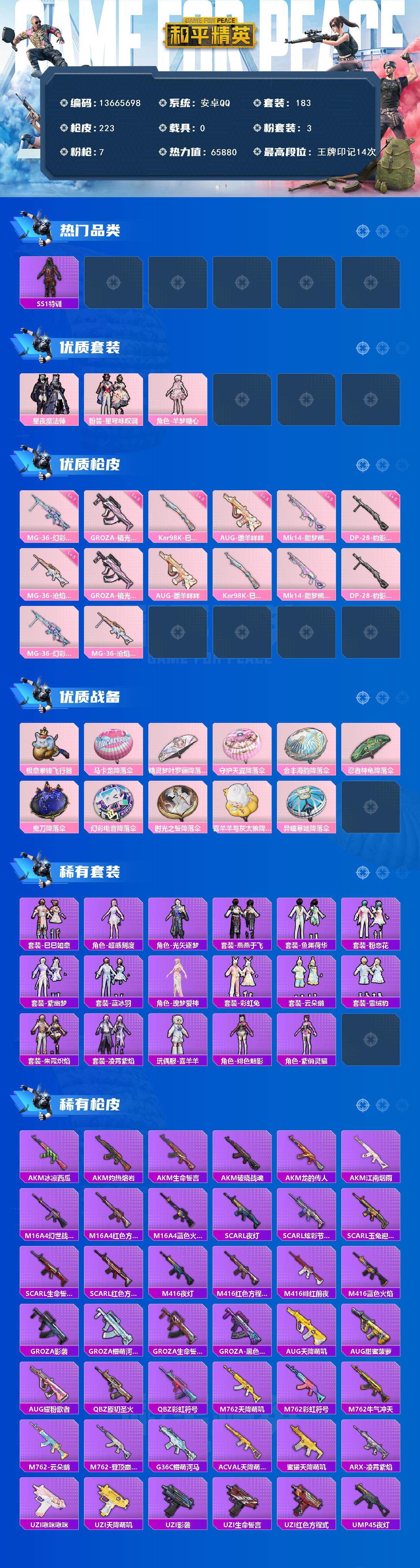 6121-3粉装-7特效呛-0载具-2粉色飞行器-65880热力值-14王牌印记-183套装-223呛皮 【热门品类】:套装-ss1特训,套装-龟仙人,套装-粉红小猪 【粉色套装】:粉装-星夜魔法师,粉装-星穹咏叹调,角色-羊梦糖心 【粉色呛皮等级】:groza-镜光银凌五级,aug-暖羊咩