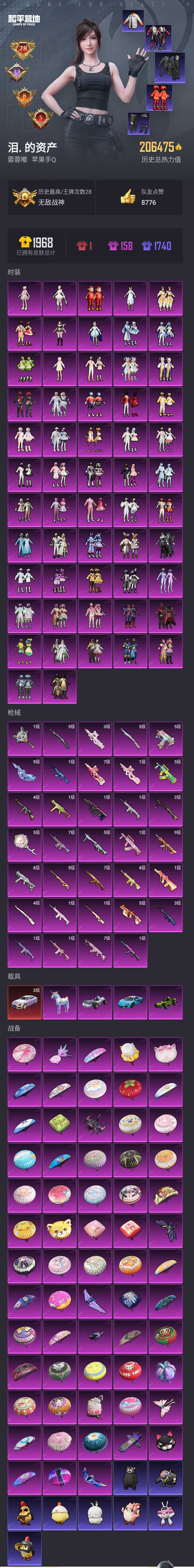【和平精英】【lyhp18569】高印记 紫logo ss17无敌战神 20w热力 57粉装34特效呛6载具含1飞机 雪国幻梦 赵灵儿 放客神游 暖熊萌萌 白勺歌姬 缤纷油彩 梦幻火箭 童趣迷兔 馨动时刻 第五大道 千金淑猫 甜梦小狐 羊梦糖心 (红熊番茄 都市猎人 追光服 巡查衣 胖达团团)满级aug星梦奇缘 满级m4至情至圣 满级p90甜蜜草莓 满级akm甜心宝贝 满级m762甜蜜誓约 满级死噶童趣迷兔 3级玛莎拉蒂 星空马 合金龙骨 迈凯伦 57粉装,34特效呛,5载具,历史最高段位:无敌战神 王牌印记28次 热力值:206475,401套装,497呛械,725装备,299战备;套装:套装-粉色回忆,套装-宝贝奶油派,套装-天使彩虹糖,套装-雪国幻梦,套装-梦幻火箭,套装-金风玉露,套装-蝶舞迷情,套装-静灵氛围,套装-缤纷油彩,套装-放客神游,套装-草莓生巧,套装-向日葵,套装-馨动时刻,套装-独舞天鹅,套装-冰霜白皇,套装-童趣迷兔,套装-炙焰红王,套装-彩虹鹿灵,套装-山涧鹿灵,套装-暗翼战神,套装-香水柠檬,套装-蜜桃特工,角色-洛天依,套装-星之彼岸,套装-黄伞悠悠,套装-黑伞漫漫,套装-筑梦精灵,套装-蓝莓炮弹,套装-恐龙拽拽,套装-甜心娃娃,套装-精灵娃娃,套装-绚丽摇曳,套装-橘柚倾心,套装-海盐物语,套装-绒雪飘舞,套装-傲雪凌霜,套装-暖熊萌萌,套装-霞光圣骑,套装-寒光使者,套装-甜梦小狐,套装-灵感创作师,套装-彩虹甜喵,套装-冰川粉黛,套装-冰川幽秘,套装-旋转彩虹,套装-甜蜜草莓,女娲后裔-赵灵儿,套装-苔丝玫瑰,套装-启明星,套装-音爆索尼克,角色-白勺歌姬,套装-第五大道,角色-白兰星,套装-未来歌姬,玩偶服-猪猪侠,角色-千金淑猫,角色-羊梦糖心,套装-特训学院,套装-冰川格斗者,套装-竞技名士,套装-猛禽,套装-游猎者,套装-长空猛禽,套装-漫步者,套装-竞技勇士朋克,套装-黎明保卫者,套装-蓝色守护者,套装-海岛探路者,套装-旭日情侣,套装-六六大吉,套装-冷焰舞者,套装-灼焰舞者,套装-都市猎人,套装-刚毅裁决者,套装-浪漫天命,套装-特战装甲,套装-战地菁英,套装-缤纷假日,套装-贵族骑装,套装-青春校园,套装-灰色格斗者,套装-活力之心,套装-甜蜜告白,套装-春日漫步,套装-龙腾端午,套装-燃烧卡路里,套装-滨海假日,套装-鹰眼刺客,套装-冰冻风暴,套装-完美偶像,套装-特战英豪,套装-街头潮人,套装-千禧之恋,套装-神秘领域,套装-怒火燎原,套装-魅力单车,套装-绮丽涂鸦,套装-耀眼新星,套装-狂战萌兔,套装-坚韧舞者,套装-野性战心,套装-野性战魂,套装-狂沙舞者,套装-都市魅力,套装-热血青春,套装-丛林猎人,套装-雪山精英,套装-传奇侦探,套装-极地朋克,套装-幻世战舞者,套装-冰凉西瓜,套装-奇异狩猎者,套装-金耀舞者,套装-蓝调潮人,套装-向日葵先生,套装-暗影哥特,套装-弄潮海豚,套装-迅捷狂鲨,套装-呆萌铁蟹,套装-深海小丑鱼,套装-夏日倾情,套装-甜蜜熊情侣,套装-青涩时光,套装-缤纷果语,套装-龙魂突击队,套装-冰川特警,套装-青涩年华,套装-灿烂千阳,套装-胖达团团,套装-胖达圆圆,套装-格斗先锋,套装-海上生明月,套装-麻辣教官,套装-小丑鱼,套装-金环蜂王,套装-恶魔宝贝,套装-萌神柯基,套装-粉红小猪,套装-破蛋小黄鸡,套装-疯狂小兔子,套装-深蓝冒险家,套装-迷域探索者,套装-机械英豪,套装-机械征服者,套装-好奇恐龙,套装-浪漫波比,套装-军械专家,套装-北国孤狼,套装-ss6特训,套装-拳皇97八神庵,套装-炽焰拳师,套装-格斗专家,套装-奇迹天团,套装-仓鼠灰灰,套装-淡雅花蕊,套装-跃动心情,套装-ss7特训,套装-黑色刀锋,套装-核芯基因,套装-精神漫游,套装-鹤鸣,套装-霓虹街区,套装-暗夜契约,套装-纯白誓言,套装-激萌罗小黑,套装-清香五月粽,套装-软嫩糖心蛋,套装-ss10特训,套装-潮萌小黄鸭,套装-ss8特训,套装-众神之王,套装-智慧之神,套装-神秘黑猫,套装-大橘为重,套装-软萌银虎,套装-白熊同盟,套装-萌黄之夏,套装-人鱼之吻,套装-摇滚狂鲨,套装-深海来使,套装-动感兔斯基人偶服,套装-夏日音浪,套装-ss9特训,套装-风华少年志,套装-白月香洋装,套装-丝绸行者,套装-顽皮玉兔,套装-抹茶蜜豆,套装-薄荷蓝莓,套装-神奈川冲浪里,套装-探宝勇士,套装-本愿之火,套装-辉星之火,套装-jdg战队服,套装-粉甜马卡龙,套装-蓝甜马卡龙,套装-牛气满满,套装-韶华初心,套装-梦之呓语,套装-ss11特训,套装-怪笑疯兔,套装-诡面顽熊,套装-青春冒险家,套装-潮流游乐家,套装-青龙圣者,套装-原初圣火,套装-逆风勇士,套装-初火先锋,套装-静谧青瓷,套装-娴静芝兰,套装-萌趣颜团子,套装-特种颜团子,套装-战术大师,套装-ss12特训,套装-牛气冲天,套装-ss18特训,套装-镭射皇者,套装-银白舞王,套装-耀粉歌者,套装-迅捷之星,套装-治愈之星,套装-科技之星,套装-飞行日记,套装-ss13特训,套装-光影梦想家,套装-梦起落英,套装-曼妙人鱼,套装-热情海星,套装-纯真浪花,套装-冰爽海盐,套装-浪漫樱花,套装-ss14特训,套装-天籁歌者,套装-电音精灵,套装-吉莉礼服,套装-暖风夏荷,套装-快乐星愿,套装-星梦畅游,套装-ss15特训,套装-jdg追光队服,套装-ss16特训,套装-暴风机械师,套装-时空追击者,套装-星辰守护者,套装-暗夜魅影,套装-暗夜傀儡,套装-ss17特训,套装-瑞龙福将,套装-团圆交子,套装-冰爽风暴,套装-福星高照,套装-豚鼠丹丹,套装-雪兔飞飞,套装-虎虎生威吉莉,套装-异彩先驱,套装-霓虹极客,套装-浓情摩卡,套装-空投萌叽,套装-ss19特训,套装-兔兔白日梦,套装-沁蓝冰爽,套装-浓情
