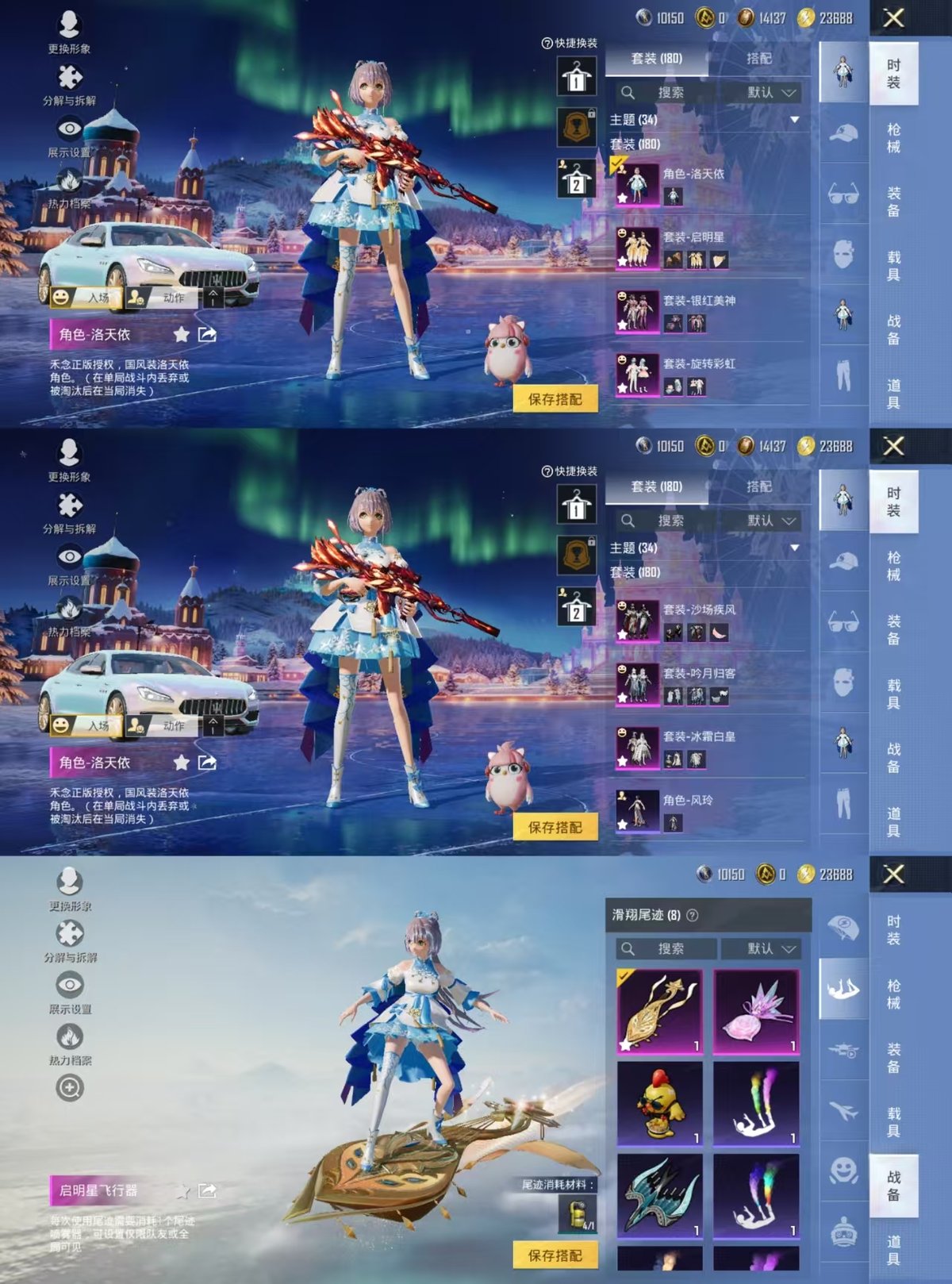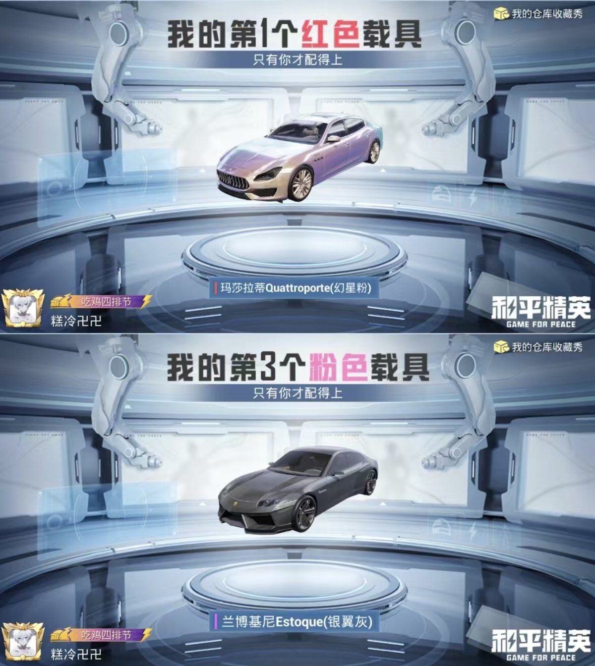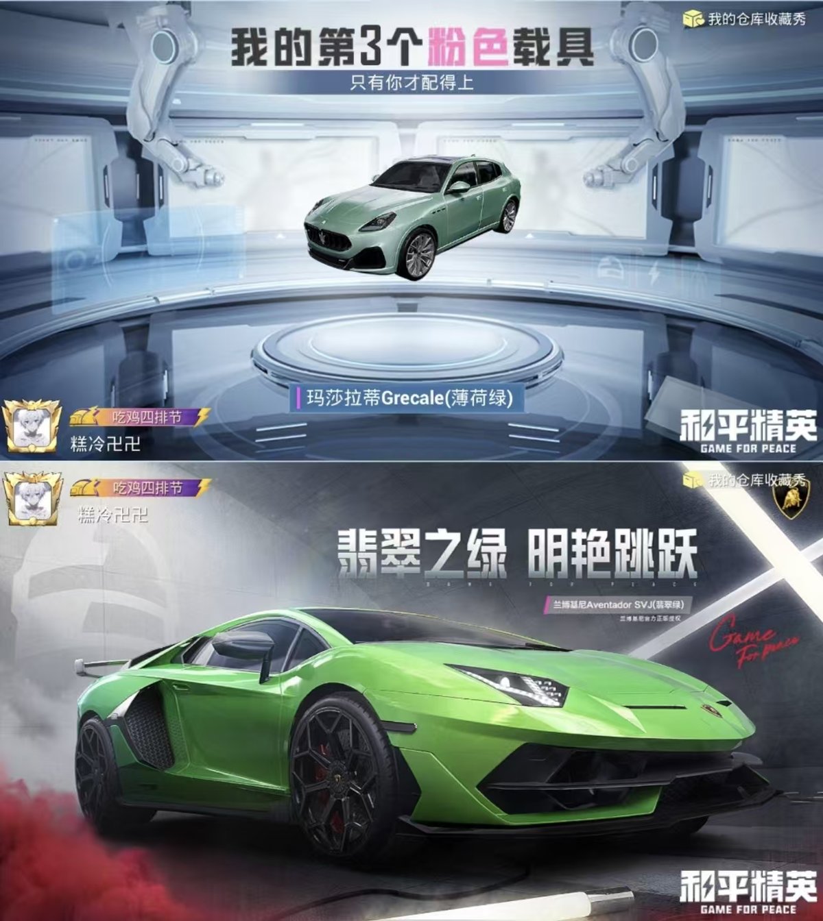 2329202-实名: 可修改 时装数: 699 载具数: 4 呛械数: 188 战备数: 144 热门装扮: 梦魇先生万圣娃娃狂徒小丑冰霜白皇沙场疾风吟月归客洛天依旋转彩虹银红美神启明星羊梦糖心 载具: 兰博基尼estoque银翼灰兰博基尼aventad svj翡翠绿玛莎拉蒂grecale薄荷绿玛莎拉蒂quattropte幻星粉 稀有呛皮: