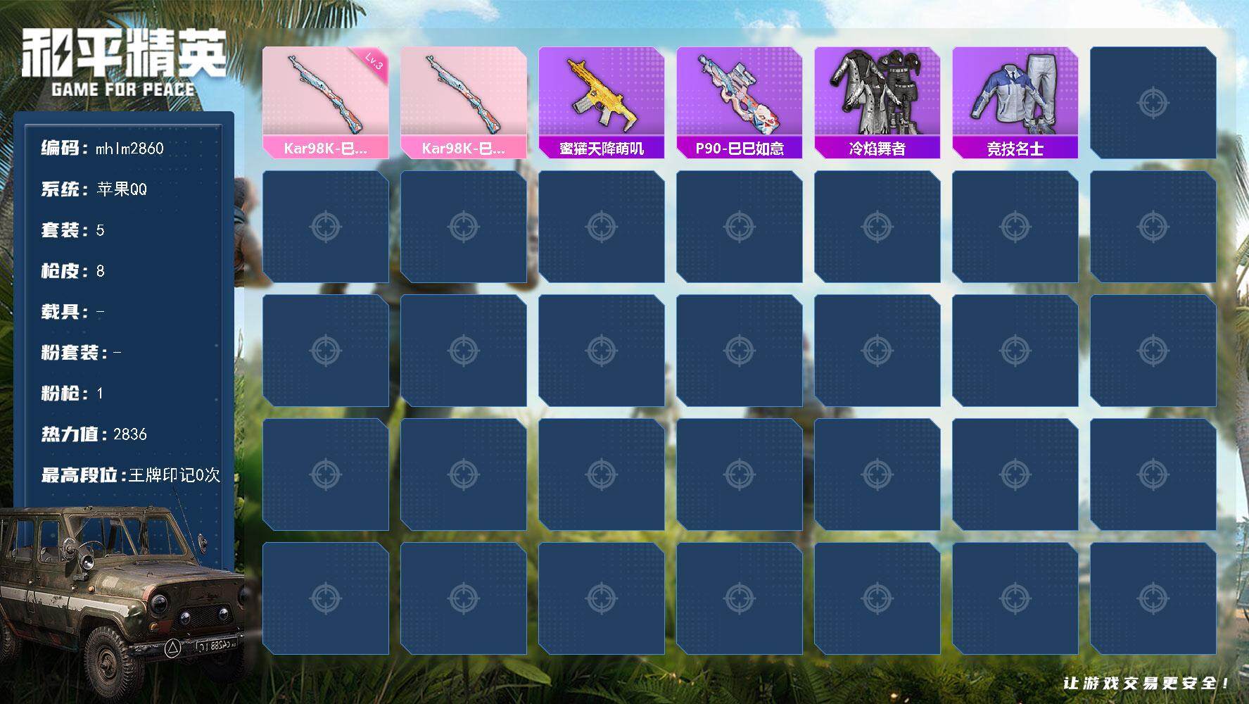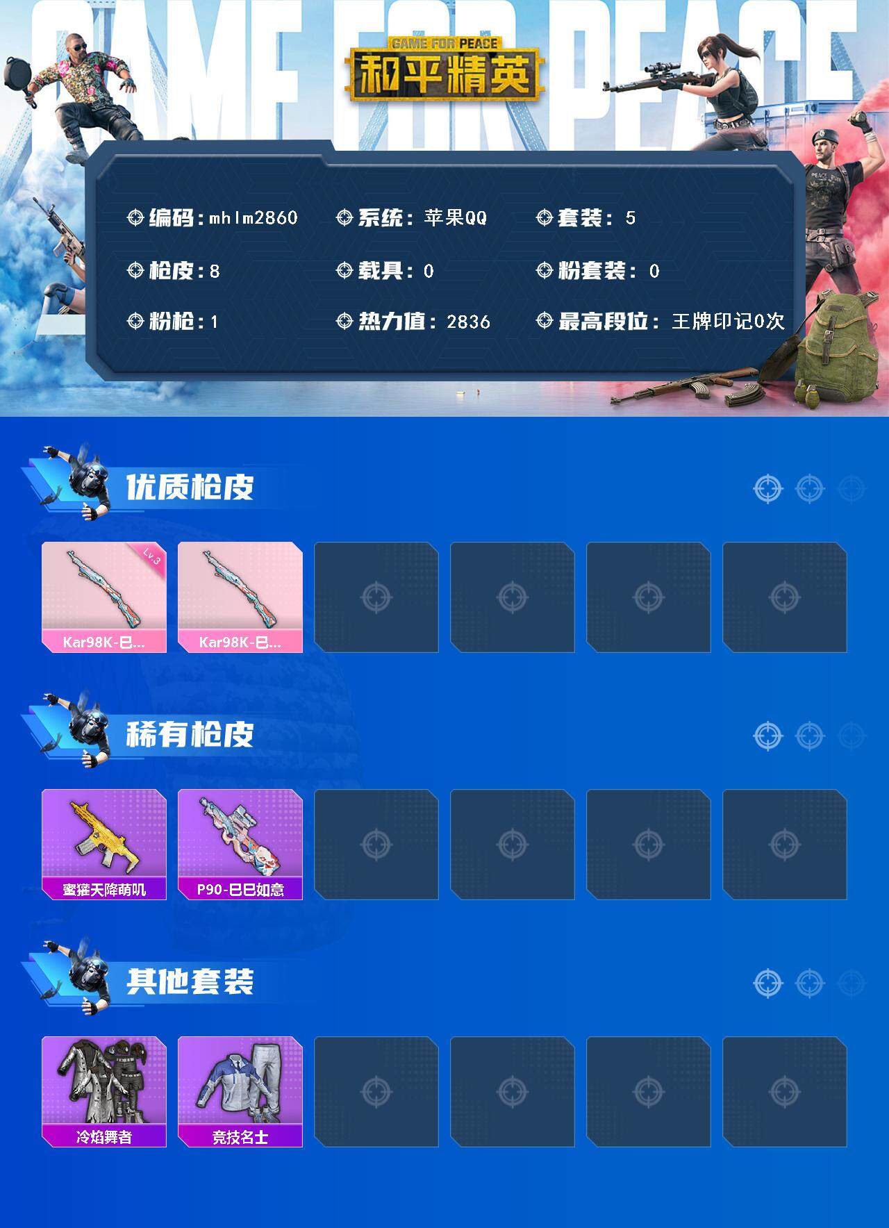 [14981404]【mhlm2860】苹果 手q-0粉装-1特效呛-0载具-0粉色飞行器-2836热力值-0王牌印记-5套装-8呛皮 【粉色呛皮等级】:kar98k-巳巳如意三级 【粉色呛皮】:kar98k-巳巳如意 【稀有呛皮】:蜜獾-天降萌叽,p90-巳巳如意 【其他套装】:套装-冷焰舞者,套装-竞技名士 【营地id】:1034772065