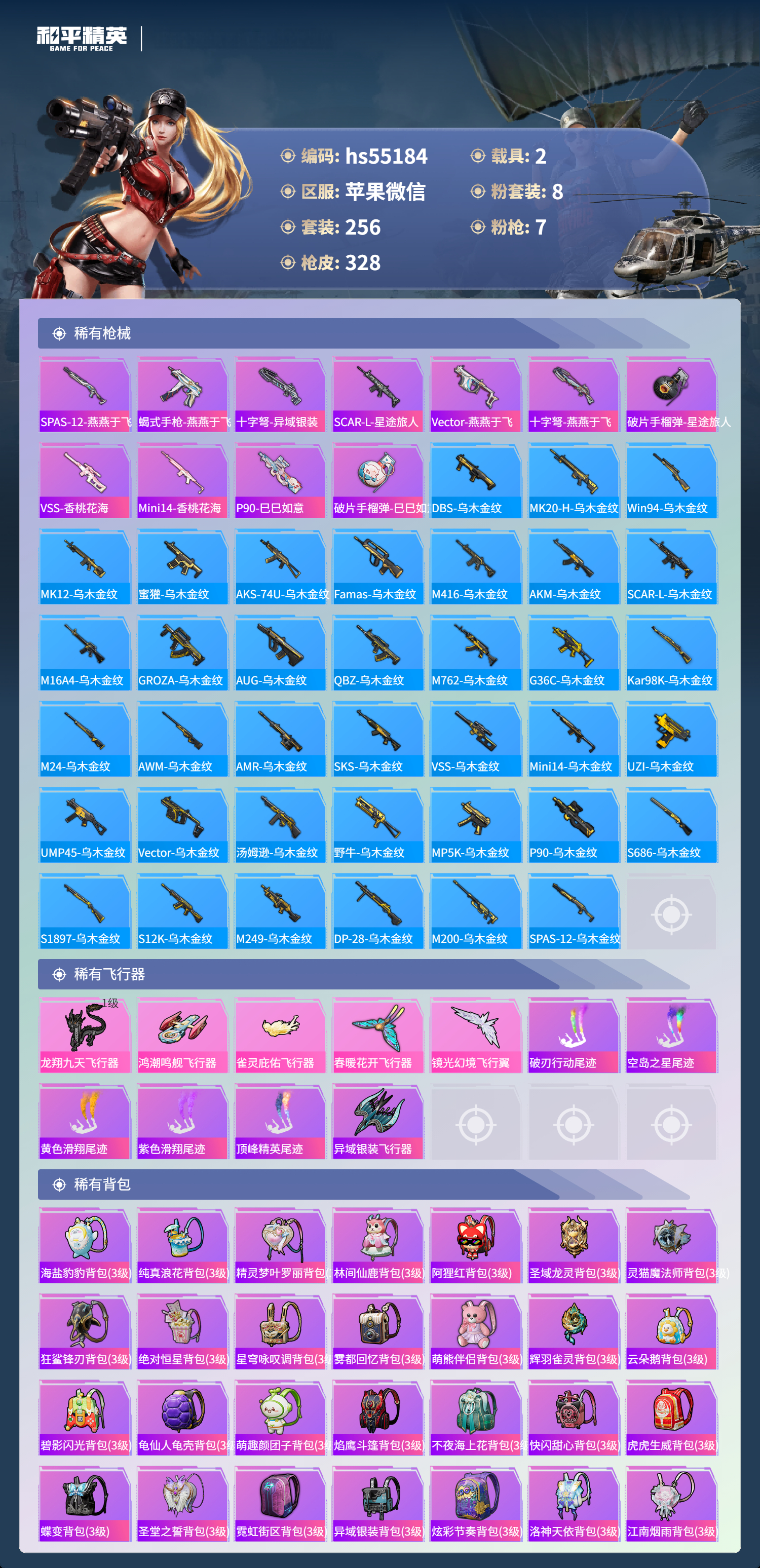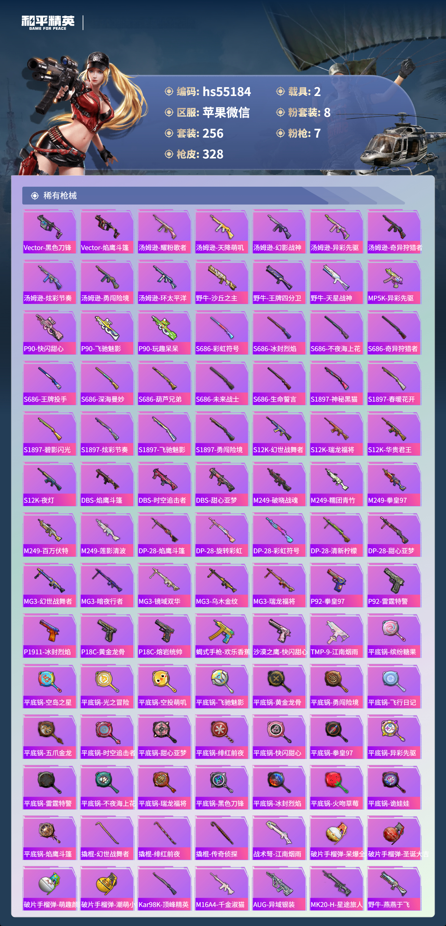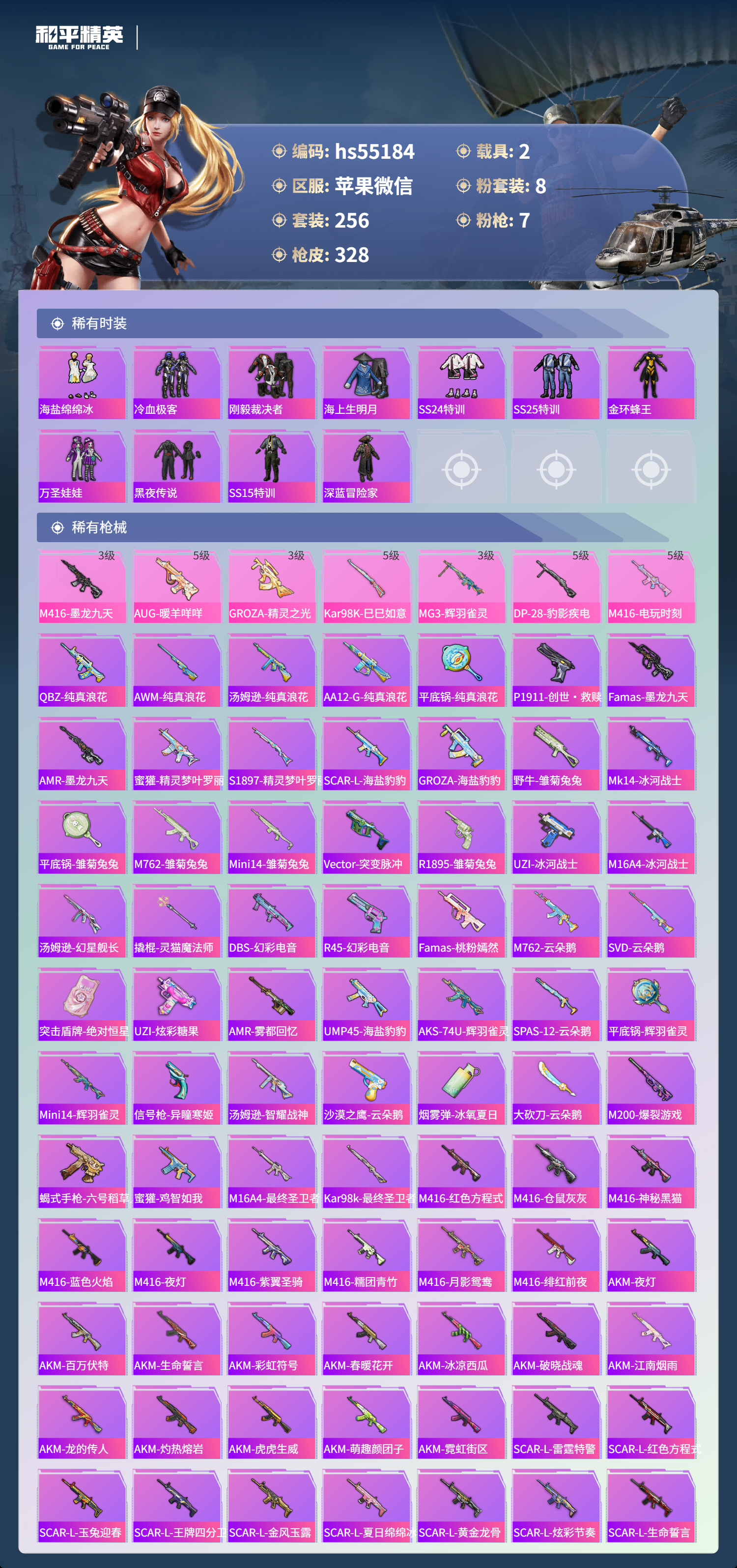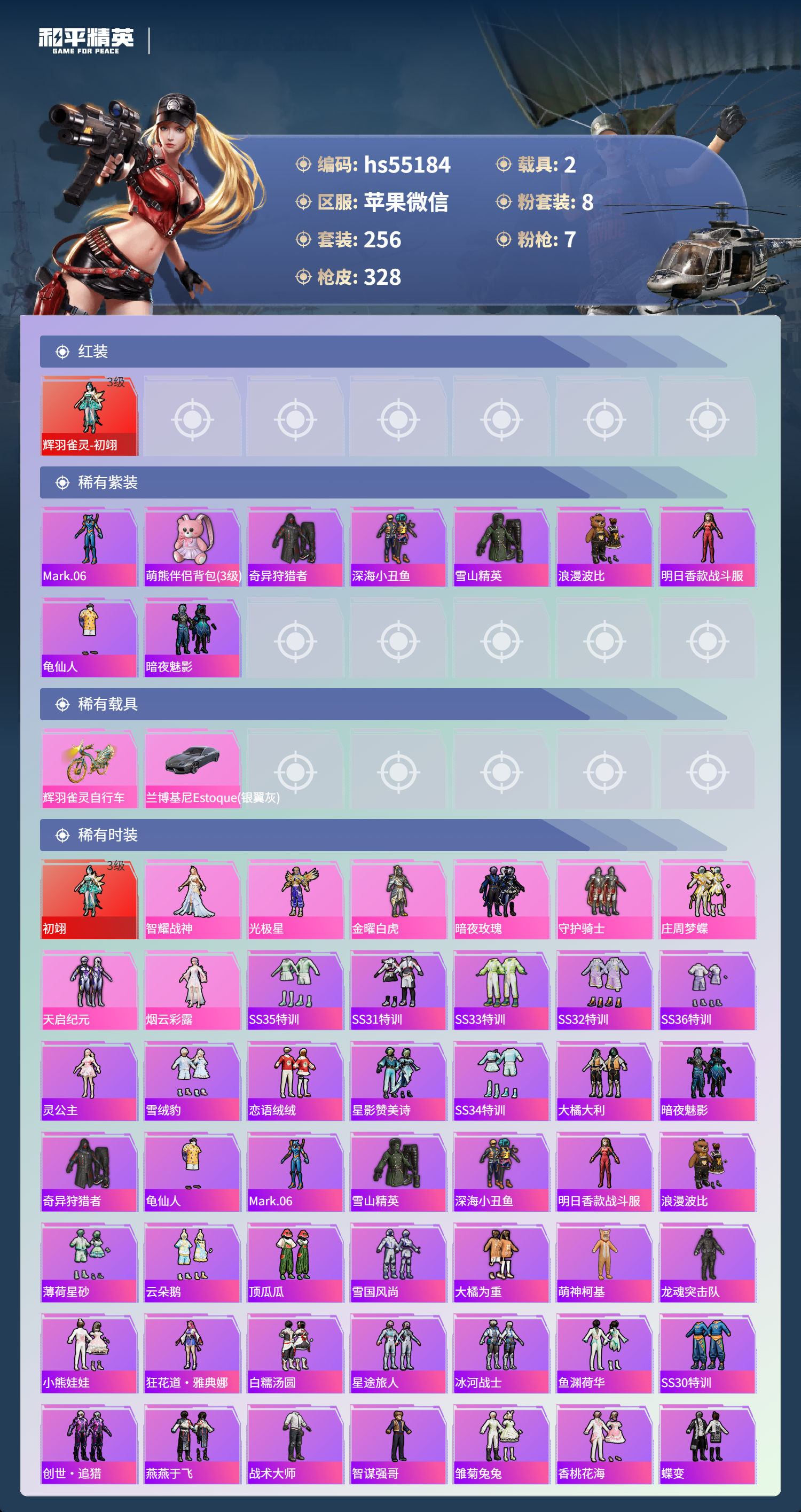 hs55184 苹果微信-14王牌印记-1红装-8粉装-7特效呛-2载具-热力值-256套装-328呛皮-2卓越印记【1红装】辉羽雀灵-初翊/3级【8粉装】角色-烟云彩露套装-金曜白虎套装-天启纪元套装-暗夜玫瑰套装-庄周梦蝶角色-光极星套装-守护骑士角色-智耀战神【7特效呛】mg3-辉羽雀灵/3级m416-墨龙九天/3级kar98k-巳巳如意/5级dp-28