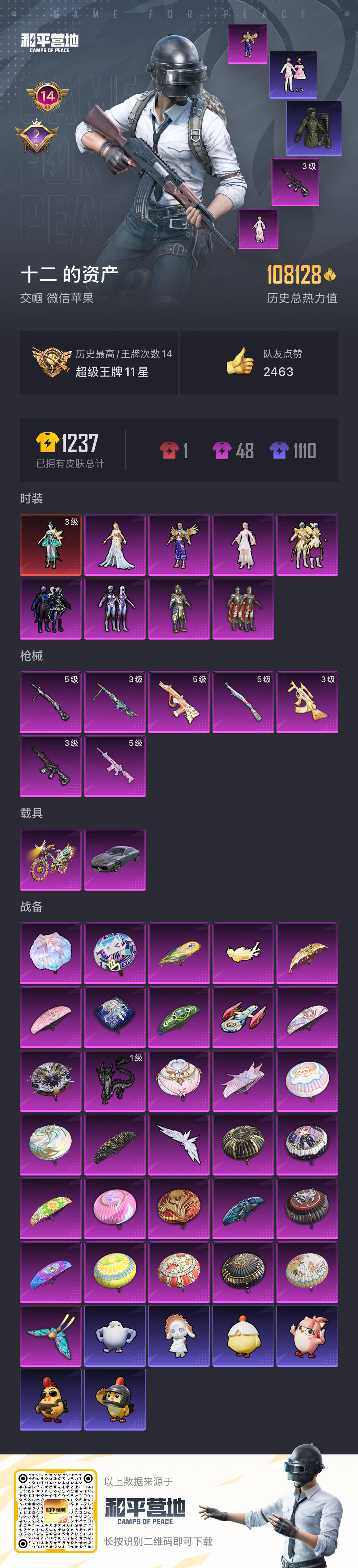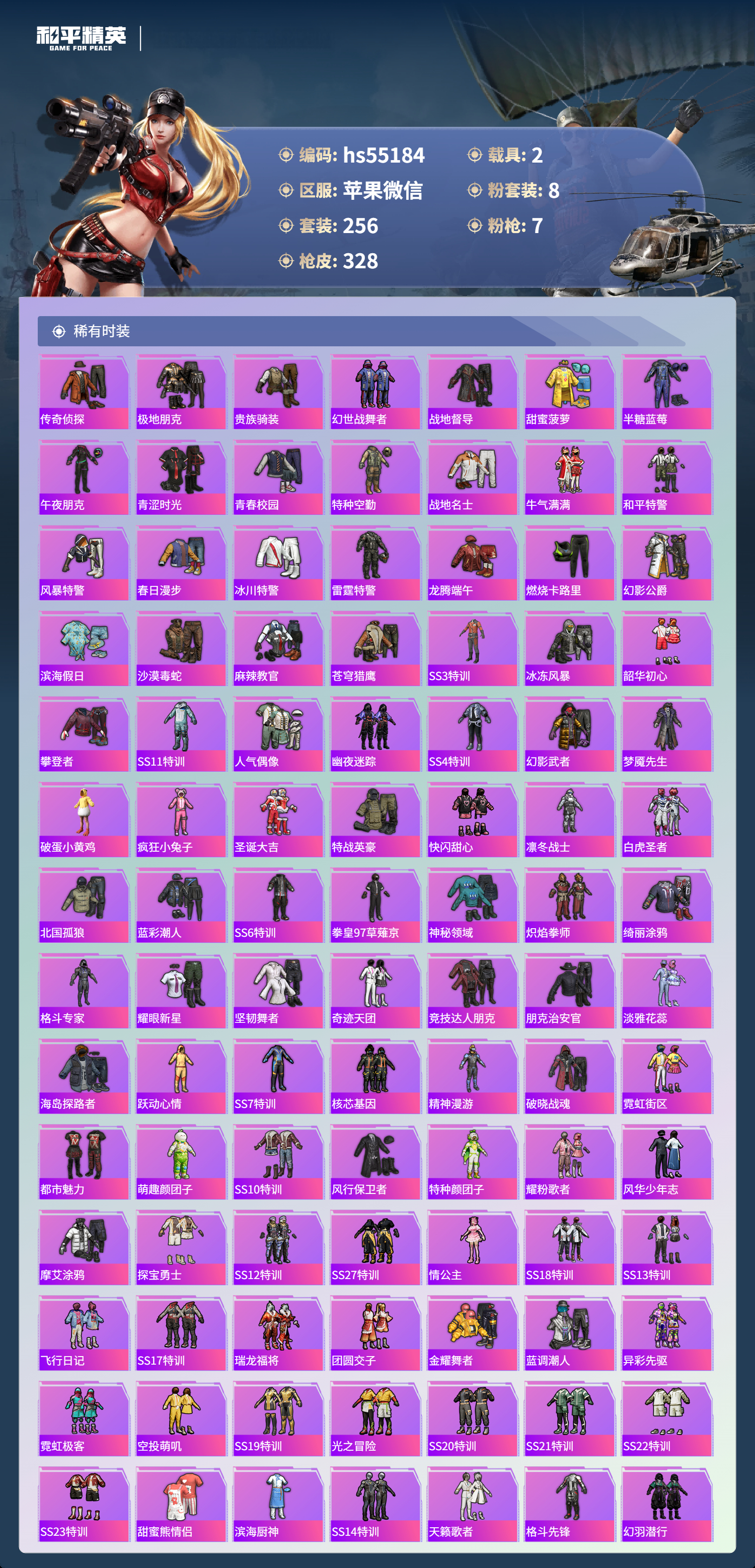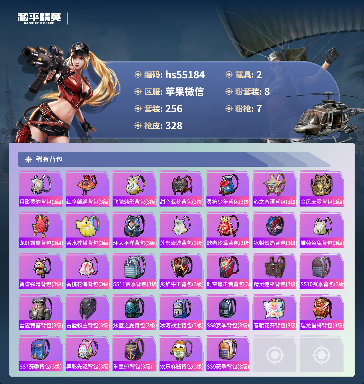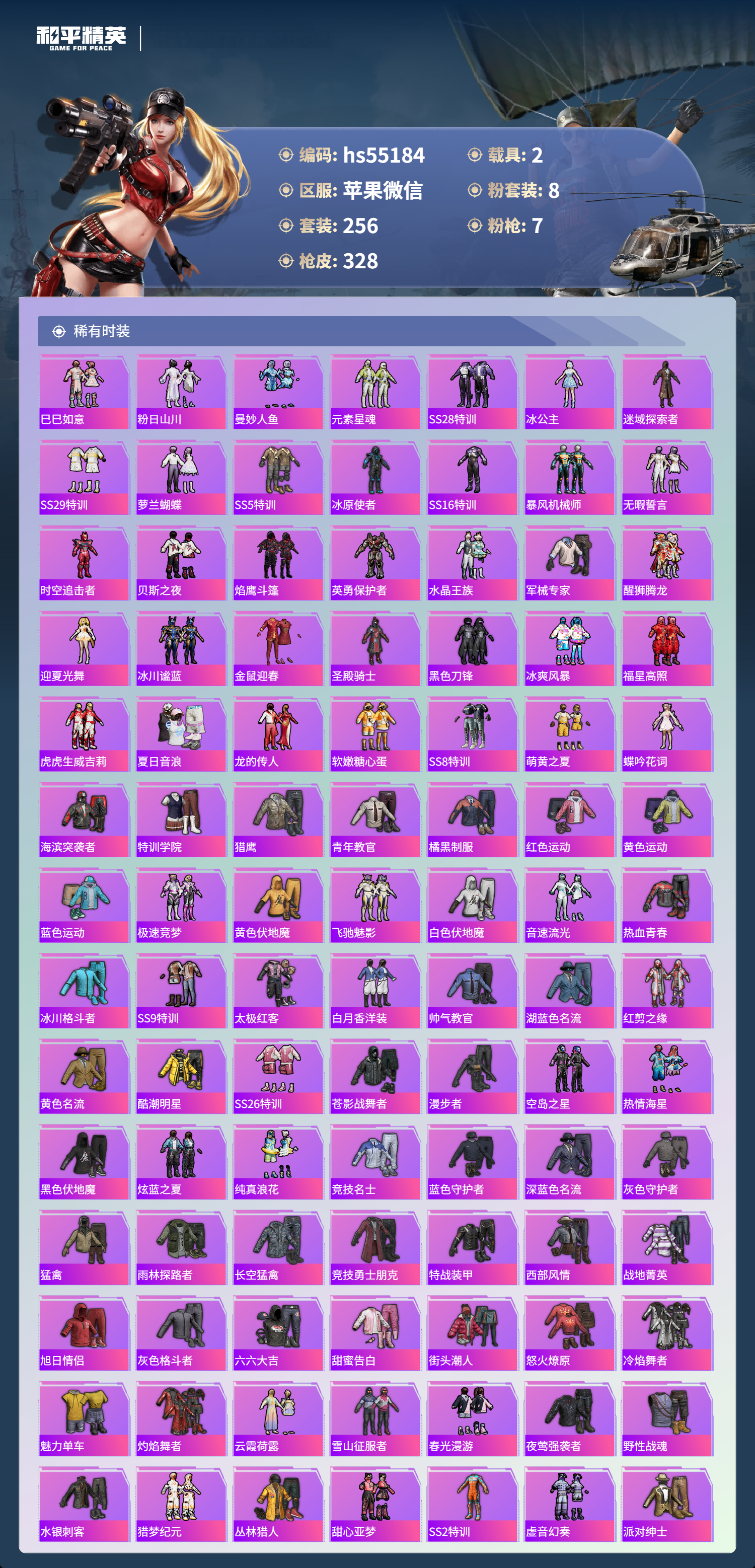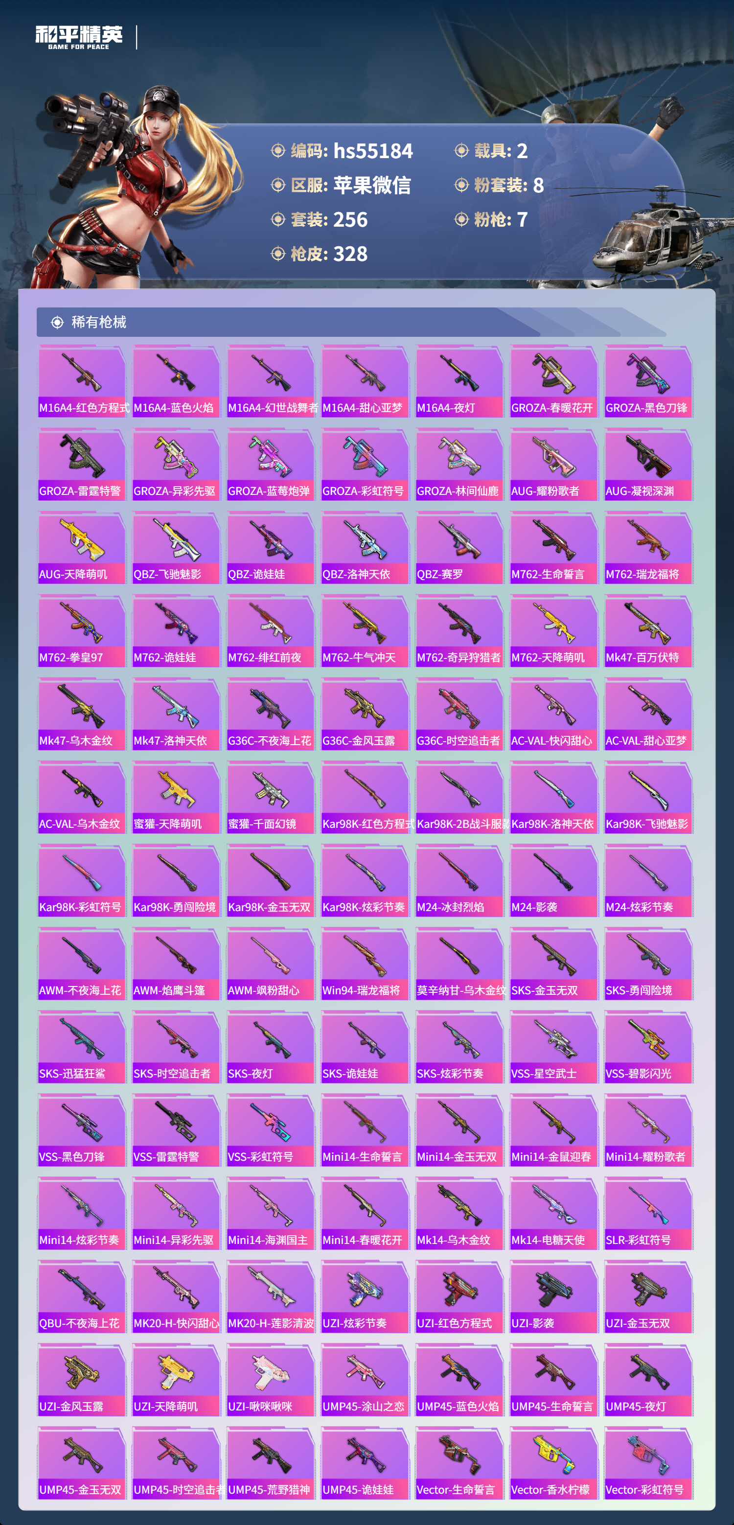 hs55184 苹果微信-14王牌印记-1红装-8粉装-7特效呛-2载具-热力值-256套装-328呛皮-2卓越印记【1红装】辉羽雀灵-初翊/3级【8粉装】角色-烟云彩露套装-金曜白虎套装-天启纪元套装-暗夜玫瑰套装-庄周梦蝶角色-光极星套装-守护骑士角色-智耀战神【7特效呛】mg3-辉羽雀灵/3级m416-墨龙九天/3级kar98k-巳巳如意/5级dp-28