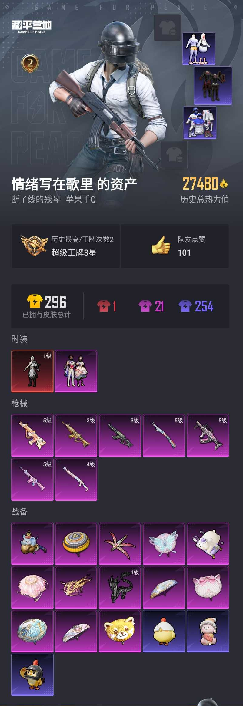 【和平精英】【lyhp18798】1红装1粉装7特效呛 1级熬渊 3级死噶金蛇镇世 3级akm幽焰骑士 满级aug 满级狗杂 1粉装,7特效呛,0载具,历史最高段位:超级王牌3星 王牌印记2次 热力值:27480,54套装,84呛械,102装备,44战备;套装:墨龙九天-敖渊,套装-星穹咏叹调,套装-竞技名士,套装-黄色名流,套装-长空猛禽,套装-海岛探路者,套装-浪漫天命,套装-春日漫步,套装-街头潮人,套装-魅力单车,套装-狂战萌兔,套装-超能勇士,套装-烈火街头,套装-暗影哥特,套装-夏日倾情,套装-缤纷果语,套装-alan walker,套装-疯狂小兔子,套装-鹤鸣,套装-战术大师,套装-绯格组合,套装-龟仙人,套装-香桃花海,套装-焰鹰斗篷,套装-幽夜迷踪,套装-幻羽潜行,套装-ss27特训,套装-ss28特训,套装-白辉玉蕊,套装-街头风暴,套装-海盐绵绵冰,套装-创世·幻影,套装-创世·追猎,套装-星途旅人,角色-俏兔智灵,套装-ss30特训,套装-青团波波,套装-棉花软糖,套装-糖糖葫芦,套装-小鸟芋圆,套装-绒宝小鹅,套装-ss31特训,套装-鱼渊荷华,套装-燕燕于飞,套装-智谋强哥,套装-紫幽梦,套装-ss33特训,套装-巳巳如意,套装-ss32特训,套装-蓝冰羽,套装-大橘大利,套装-蜜露汐语,套装-ss34特训,套装-ss36特训;呛皮:5级groza-镜光银凌,groza-晶梦幻蝶,ac-val-天降萌叽,ac-val-牡丹亭·游园,m16a4-千金淑猫,g36c-星穹咏叹调,3级scar-l-金蛇镇世,scar-l-炫彩节奏,scar-l-星途旅人,scar-l-海盐豹豹,蜜獾-天降萌叽,蜜獾-白蛇盈舞,蜜獾-糖糖葫芦,蜜獾-乌木金纹,5级m416-电玩时刻,m416-蓝色火焰,5级aug-暖羊咩咩,aug-甜蜜菠萝,aug-金蛇镇世,famas-墨龙九天,famas-乌木金纹,3级akm-幽焰骑士,akm-破晓战魂,m762-彩虹符号,m762-天降萌叽,5级kar98k-巳巳如意,amr-墨龙九天,m200-乌木金纹,awm-焰鹰斗篷,mk12-金蛇镇世,mk12-乌木金纹,mk14-紫幽梦,mk20-h-糖糖葫芦,sks-炫彩节奏,mini14-香桃花海,vect-焰鹰斗篷,vect-创世·救赎,vect-燕燕于飞,p90-玩趣呆呆,p90-巳巳如意,ump45-生命誓言,ump45-海盐豹豹,ump45-糖糖葫芦,ump45-绒宝小鹅,汤姆逊-炫彩节奏,汤姆逊-天降萌叽,uzi-天降萌叽,uzi-冰河战士,aks-74u-乌木金纹,mp5k-乌木金纹,野牛-燕燕于飞,4级spas-12-蜜语绒猫,spas-12-燕燕于飞,spas-12-乌木金纹,s686-巳巳如意,s1897-精灵梦叶罗丽,s1897-紫幽梦,dbs-焰鹰斗篷,dbs-游龙飞鱼,dbs-乌木金纹,s12k-霓彩脉冲,dp-28-彩虹符号,dp-28-焰鹰斗篷,pkm-啾咪啾咪,pkm-紫幽梦,mg3-幻世战舞者,蝎式手呛-千金淑猫,蝎式手呛-燕燕于飞,短管霰弹-星穹咏叹调,r1895-镭金极速,p18c-糖糖葫芦,tmp-9-幽焰骑士,p92-紫幽梦,p1911-创世·救赎,撬棍-突变脉冲,平底锅-焰鹰斗篷,平底锅-糖糖葫芦,平底锅-紫幽梦,平底锅-属我最6,破片手留单-炽纹蛇影,破片手留单-巳巳如意,破片手留单-爆破雪人,爆炸猎弓-青蛇行歌,十子怒-燕燕于飞;降落伞:酣梦熊熊飞行器,祥瑞起舞飞行器,万象金身飞行器,极意拳锋飞行器,龙翔九天飞行器,顶峰精英尾迹,登顶巅峰飞行器; 详情看图