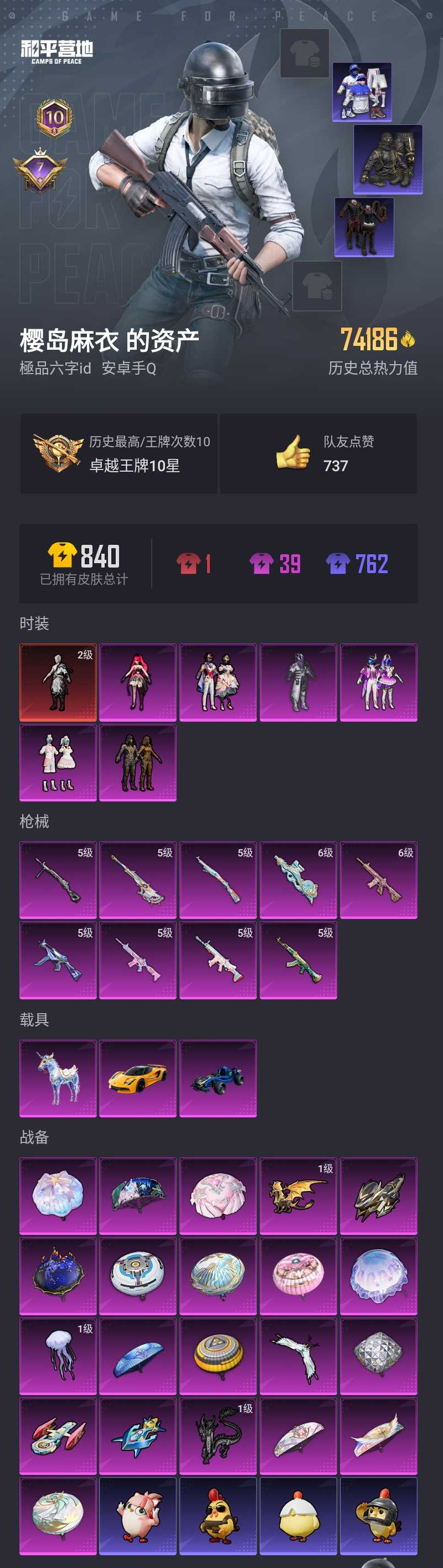 【和平精英】【lyhp18791】1红装6粉装9特效呛3载具 2级熬渊 幻影战神 金羽特工 暗影哥特 浪漫天命 6级m4心之恋语 星空马 合金龙骨 6粉装,9特效呛,3载具,历史最高段位:卓越王牌10星 王牌印记10次 热力值:74206,178套装,217呛械,271装备,150战备;套装:墨龙九天-敖渊,套装-幻影战神,套装-极致幻想,套装-蜜语绒猫,套装-繁龙极客,角色-绯穹魔姬,套装-星穹咏叹调,套装-特训学院,套装-猎鹰,套装-青年教官,套装-橘黑制服,套装-红色运动,套装-黄色运动,套装-蓝色运动,套装-黄色伏地魔,套装-白色伏地魔,套装-黑色伏地魔,套装-竞技名士,套装-深蓝色名流,套装-酒红色名流,套装-湖蓝色名流,套装-黄色名流,套装-猛禽,套装-长空猛禽,套装-漫步者,套装-海岛探路者,套装-雨林探路者,套装-旭日情侣,套装-六六大吉,套装-冷焰舞者,套装-灼焰舞者,套装-水银刺客,套装-浪漫天命,套装-战地督导,套装-青春校园,套装-活力之心,套装-春日漫步,套装-燃烧卡路里,套装-滨海假日,套装-完美偶像,套装-人气偶像,套装-幻影武者,套装-摇滚战魂,套装-特战英豪,套装-街头潮人,套装-红潮炫舞,套装-蓝彩潮人,套装-千禧之恋,套装-怒火燎原,套装-魅力单车,套装-绮丽涂鸦,套装-耀眼新星,套装-狂战萌兔,套装-竞技达人朋克,套装-金羽特工,套装-超能勇士,套装-破晓战魂,套装-都市魅力,套装-热血青春,套装-沙漠兵团,套装-幻世战舞者,套装-清新柠檬,套装-装甲骑士,套装-血色贵族,套装-暗影哥特,套装-迅捷狂鲨,套装-缤纷果语,套装-滨海厨神,套装-alan walker,套装-龙魂突击队,套装-元素星魂,套装-忍者信条,套装-极速红龙,套装-麻辣教官,套装-破蛋小黄鸡,套装-疯狂小兔子,套装-霓虹街区,套装-激萌罗小黑,套装-白熊同盟,套装-萌黄之夏,套装-探宝勇士,套装-白糯汤圆,套装-萌趣颜团子,套装-战术大师,套装-牛气冲天,套装-ss18特训,套装-耀粉歌者,套装-飞行日记,套装-曼妙人鱼,套装-热情海星,套装-纯真浪花,套装-ss14特训,套装-ss17特训,套装-福星高照,套装-虎虎生威吉莉,套装-空投萌叽,套装-ss20特训,套装-绯格组合,套装-ss23特训,套装-王牌教练,套装-柠萌假日,套装-ss24特训,套装-龟仙人,套装-涂山之恋,套装-ss25特训,套装-惊鸿侠骨,套装-锦衣飞扬,套装-香桃花海,角色-2b战斗服款,套装-龙的传人,套装-冰河战士,套装-ss26特训,套装-快闪甜心,套装-春光漫游,套装-漫游都市,套装-空岛之星,套装-明鸳圣池,套装-云魄琉璃,套装-贝斯之夜,套装-焰鹰斗篷,套装-幽夜迷踪,套装-幻羽潜行,套装-ss27特训,套装-恋语绒绒,套装-老实芭蕉,套装-ss28特训,角色-湖雨初晴,套装暗影刺翼,角色-迎夏光舞,角色-白光莹,角色-情公主,角色-冰公主,套装-街头风暴,套装-海盐绵绵冰,套装-蝶变,套装-创世·追猎,套装-湖畔霞光,套装-粉日山川,套装-小熊娃娃,套装-ss29特训,套装-雏菊兔兔,套装-萝兰蝴蝶,角色-无面战甲,套装-异域银装,套装-星途旅人,套装-ss30特训,套装-青团波波,套装-棉花软糖,角色-光矢逐梦,套装-糖糖葫芦,套装-ss31特训,套装-鱼渊荷华,套装-燕燕于飞,套装-智谋强哥,角色-风玲,套装-紫幽梦,套装-粉恋花,套装-ss33特训,套装-云朵鹅,套装-巳巳如意,套装-ss32特训,套装-彩虹兔,套装-蓝冰羽,套装-顶瓜瓜,套装-雪绒豹,角色-虚空骇客,套装-大橘大利,角色-时希公主,角色-灵公主,套装-霓虹热舞,玩偶服-美羊羊,套装-ss34特训,套装-朱霞炽焰,套装-游乐,套装-凌霄紫焰,套装-薄荷星砂,套装-ss36特训,套装-雪国风尚;呛皮:蜜獾-天降萌叽,蜜獾-精灵梦叶罗丽,蜜獾-白蛇盈舞,蜜獾-糖糖葫芦,蜜獾-乌木金纹,groza-海盐豹豹,groza-无面战甲,q-彩虹符号,q-纯真浪花,6级m416-心之恋语,5级m416-电玩时刻,m416-蓝色火焰,m416-绯红前夜,m416-红色方程式,m416-阿狸红,m416-糯团青竹,m16a4-蓝色火焰,m16a4-幻世战舞者,m16a4-冰河战士,5级akm-绿萝繁花,akm-影袭,akm-缤纷海域,akm-破晓战魂,akm-春暖花开,akm-霓虹街区,akm-夜灯,akm-萌趣颜团子,akm-龙的传人,akm-江南烟雨,akm-荧星灵猫,5级scar-l-锦绣绵绵,scar-l-红色方程式,scar-l-星途旅人,scar-l-海盐豹豹,scar-l-冷漠罗丽,ac-val-乌木金纹,ac-val-闲梦青缨,ac-val-快闪甜心,ac-val-梦海之灵,ac-val-兔兔小魔女,g36c-桃粉嫣然,g36c-蛇蝎美人,g36c-乌木金纹,m762-彩虹符号,m762-彩虹甜喵,m762-天降萌叽,m762-萌物绒绒,m762-雏菊兔兔,m762-云朵鹅,aug-耀粉歌者,aug-天降萌叽,aug-异域银装,famas-乌木金纹,mk47-炫光之旅,arx-凌霄紫焰,5级amr-智耀战神,amr-乌木金纹,m200-惊鸿侠骨,m200-乌木金纹,awm-黄金龙骨,awm-天降萌叽,awm-焰鹰斗篷,awm-纯真浪花,awm-盛世惊鸿,awm-乌木金纹,5级kar98k-巳巳如意,kar98k-幻影战神,kar98k-梦幻火箭,kar98k-彩虹符号,kar98k-顶峰精英,kar98k-乌木金纹,m24-奇异狩猎者,m24-仲夏莫吉托,莫辛纳甘-乌木金纹,svd-云朵鹅,mini14-金玉无双,mini14-耀粉歌者,mini14-海渊国主,mini14-香桃花海,mini14-雏菊兔兔,mk14-乌木金纹,mk14-冰河战士,mk14-电糖天使,mk14-紫幽梦,mk14-幻星舰长,mk14-薄荷星砂,slr-守护天翼,slr-墨龙九天,mk20-h-快闪甜心,mk20-h-星梦奇缘,mk20-h-星途旅人,mk20-h-糖糖葫芦,mk20-h-狂鲨锋刃,mk20-h-乌木金纹,vss-彩虹符号,vss-香桃花海,mk12-乌木金纹,m417-惊鸿侠骨,uzi-影袭,uzi-金玉无双,uzi-炫彩节奏,uzi-烈焰拳霸,uzi-天降萌叽,uzi-冰河战士,uzi-啾咪啾咪,5级ump45-量子极限,ump45-夜灯,ump45-蓝色火焰,ump45-金玉无双,ump45-海盐豹豹,ump45-糖糖葫芦,汤姆逊-耀粉歌者,汤姆逊-天降萌叽,汤姆逊-纯真浪花,汤姆逊-智耀战神,汤姆