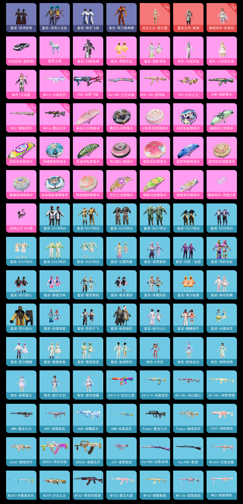 【和平精英】【lyhp18727】3红装6粉装10特效呛2载具 4级图卡盟 2级欧若拉 1级敖渊 深海小丑鱼 3级m4女娲灵识 3级m4墨龙九天 3级p90沙丘之主 星空马 6粉装,10特效呛,2载具,历史最高段位:卓越王牌11星 王牌印记5次 热力值:57690,82套装,142呛械,205装备,75战备;套装:沙丘之主-图卡盟,墨龙九天-敖渊,镜域双华-欧若拉,套装-幻影战神,角色-水仙星,套装-莲影清波,角色-小叽联名款,套装-憨憨奶龙,角色-冷漠罗丽,套装-红色运动,套装-黄色运动,套装-黄色伏地魔,套装-白色伏地魔,套装-黑色伏地魔,套装-竞技名士,套装-湖蓝色名流,套装-黄色名流,套装-猛禽,套装-长空猛禽,套装-海岛探路者,套装-幻影武者,套装-魅力单车,套装-烈火街头,套装-深海小丑鱼,套装-缤纷果语,套装-龙魂突击队,套装-破蛋小黄鸡,套装-战术大师,套装-ss18特训,套装-热情海星,套装-纯真浪花,套装-电音精灵,角色-军刀雅典娜,套装-异彩先驱,套装-霓虹极客,套装-ss19特训,套装-ss20特训,套装-ss21特训,套装-摩登艾咪,套装-柠萌假日,套装-惊鸿侠骨,套装-锦衣飞扬,套装-云霞荷露,套装-果汁能量,套装-冰河战士,套装-快闪甜心,套装-春光漫游,角色-舰行太空,套装-ss27特训,套装-ss28特训,角色-湖雨初晴,角色-极地流光,角色-粉雾星云,角色-8号机,套装-海盐绵绵冰,套装-蝶变,套装-创世·追猎,套装-粉日山川,套装-ss29特训,套装-雏菊兔兔,套装-萝兰蝴蝶,套装-异域银装,角色-都市丽猫,角色-怀庆长公主,套装-ss30特训,套装-青团波波,套装-棉花软糖,套装-糖糖葫芦,套装-ss31特训,套装-鱼渊荷华,套装-燕燕于飞,套装-ss33特训,套装-ss32特训,套装-顶瓜瓜,套装-大橘大利,套装-元气之梦,套装-ss34特训,套装-擎苍青焰,套装-朱霞炽焰,套装-凌霄紫焰,套装-ss35特训,套装-萌鸡速递;呛皮:scar-l-彩虹符号,scar-l-玉兔迎春,g36c-桃粉嫣然,g36c-镜域双华,groza-春暖花开,groza-异彩先驱,ac-val-闲梦青缨,ac-val-快闪甜心,m762-奇异狩猎者,m762-第五大道,m762-天降萌叽,m762-雏菊兔兔,蜜獾-糖糖葫芦,蜜獾-绯穹魔姬,蜜獾-乌木金纹,famas-墨龙九天,famas-镜域双华,famas-霓彩脉冲,famas-乌木金纹,m16a4-冰河战士,m16a4-天使羽翼,5级akm-绿萝繁花,akm-涂鸦街区,akm-龙的传人,akm-霓彩脉冲,aug-海螺星光,aug-异域银装,aug-月影灵韵,3级m416-墨龙九天,3级m416-女娲灵识,arx-凌霄紫焰,q-纯真浪花,mk47-乌木金纹,3级m24-镜域双华,m24-乌木金纹,5级kar98k-巳巳如意,kar98k-影袭,kar98k-幻影战神,莫辛纳甘-炙焰牛王,莫辛纳甘-乌木金纹,amr-墨龙九天,amr-鸡智如我,amr-乌木金纹,win94-乌木金纹,awm-纯真浪花,m200-仲夏莫吉托,m200-惊鸿侠骨,m200-乌木金纹,vss-香桃花海,mk20-h-快闪甜心,mk20-h-星梦奇缘,mk20-h-糖糖葫芦,mk20-h-狂鲨锋刃,mk20-h-乌木金纹,m417-惊鸿侠骨,mini14-异彩先驱,mini14-香桃花海,mini14-雏菊兔兔,mini14-鸡智如我,mk14-乌木金纹,mk14-冰河战士,mk14-紫晶流影,slr-墨龙九天,slr-霓彩脉冲,sks-金玉无双,sks-未来歌姬,3级p90-沙丘之主,p90-快闪甜心,p90-玩趣呆呆,p90-乌木金纹,ump45-海盐豹豹,ump45-糖糖葫芦,mp5k-异彩先驱,mp5k-未来领航者,mp5k-乌木金纹,uzi-影袭,uzi-冰河战士,uzi-月影灵韵,汤姆逊-异彩先驱,汤姆逊-星梦奇缘,汤姆逊-纯真浪花,4级aks-74u-星穹咏叹调,aks-74u-乌木金纹,vect-生命誓言,vect-彩虹符号,vect-突变脉冲,vect-创世·救赎,vect-燕燕于飞,野牛-沙丘之主,野牛-雏菊兔兔,野牛-燕燕于飞,野牛-乌木金纹,js9-凌霄紫焰,aa12-g-炫光之旅,aa12-g-纯真浪花,s1897-糯团青竹,spas-12-天使羽翼,spas-12-燕燕于飞,spas-12-狂鲨锋刃,spas-12-乌木金纹,3级dbs-幻影飞狐,dbs-乌木金纹,s12k-霓彩脉冲,5级mg-36-沧焰双生,mg-36-凌霄紫焰,m249-彩虹符号,m249-沙丘之主,pkm-啾咪啾咪,mg3-乌木金纹,mg3-惊鸿侠骨,mg3-桃粉嫣然,mg3-镜域双华,5级dp-28-豹影疾电,沙墨之鹦-旋转彩虹,沙墨之鹦-快闪甜心,沙墨之鹦-未来领航者,信号呛-异瞳寒姬,电击呛-喜羊羊与灰太狼,r1895-雏菊兔兔,短管霰弹-竹节火铳,p92-凌霄紫焰,蝎式手呛-金丰海韵,蝎式手呛-燕燕于飞,p18c-糖糖葫芦,大砍刀-黑金刀,平底锅-异彩先驱,平底锅-惊鸿侠骨,平底锅-快闪甜心,平底锅-精灵梦叶罗丽,平底锅-纯真浪花,平底锅-雏菊兔兔,平底锅-糖糖葫芦,平底锅-许七安,平底锅-属我最6,平底锅-凌霄紫焰,撬棍-沙丘之主权杖,破片手留单-拽到爆炸,十子怒-异瞳寒姬,十子怒-燕燕于飞,十子怒-异域银装,盐雾蛋-冰氧夏日,爆炸猎弓-惊鸿侠骨;载具:时空跃影星辉银,星梦玉骢;降落伞:镜域双华-灵镜之阶,酣梦熊熊飞行器,祥瑞起舞飞行器,炫彩糖果飞行器,沙丘之主天马,龙翔九天飞行器,圣域金龙飞行器,异域银装飞行器,破刃行动尾迹,鸡智如我飞行器; 详情看图