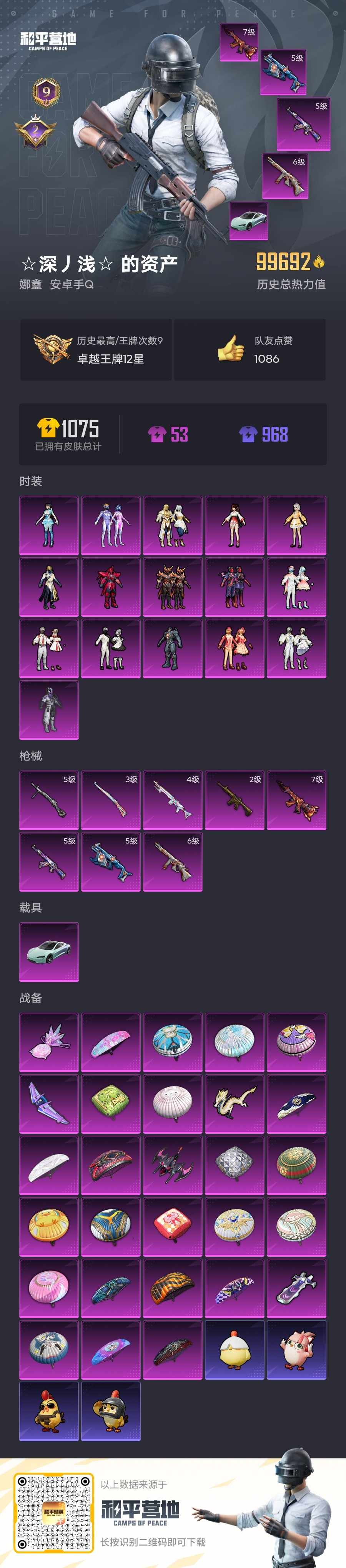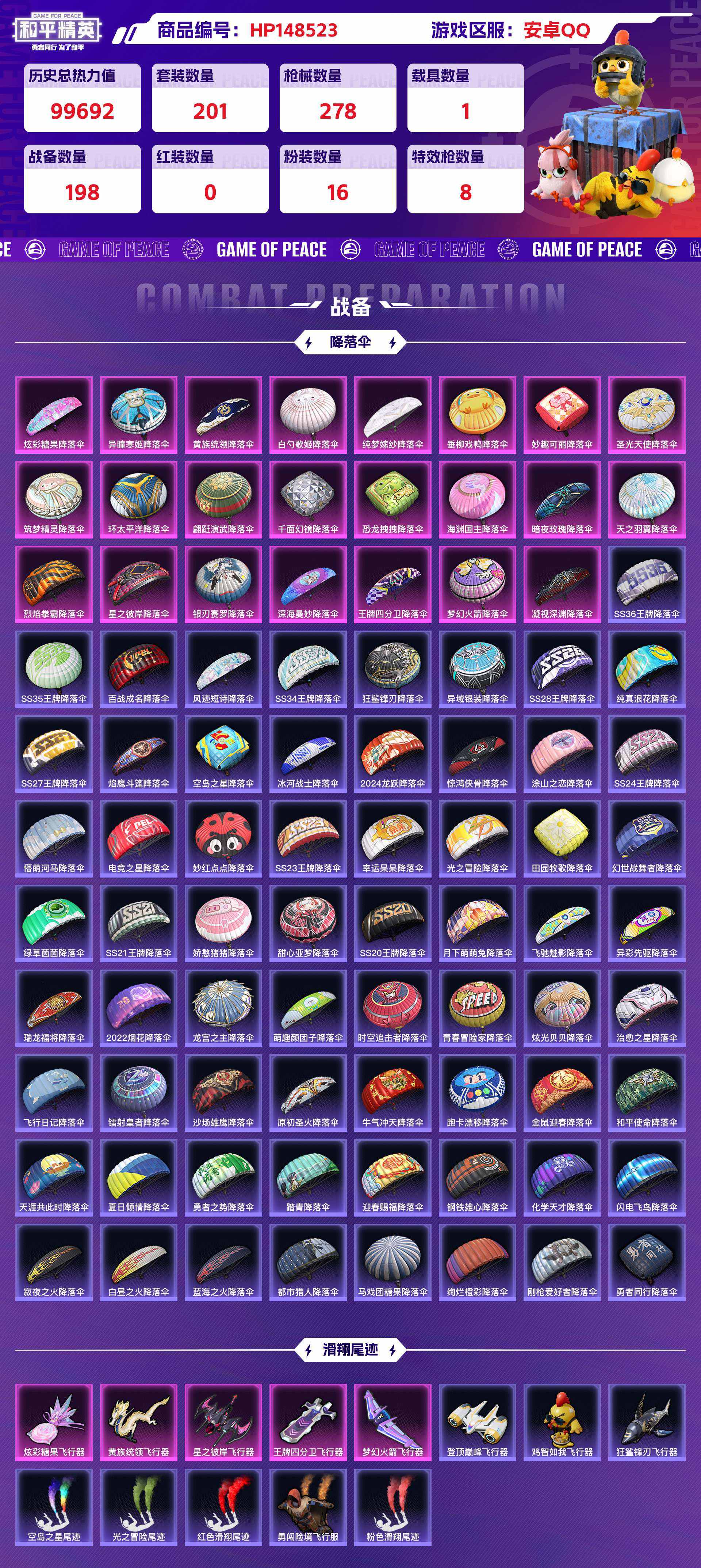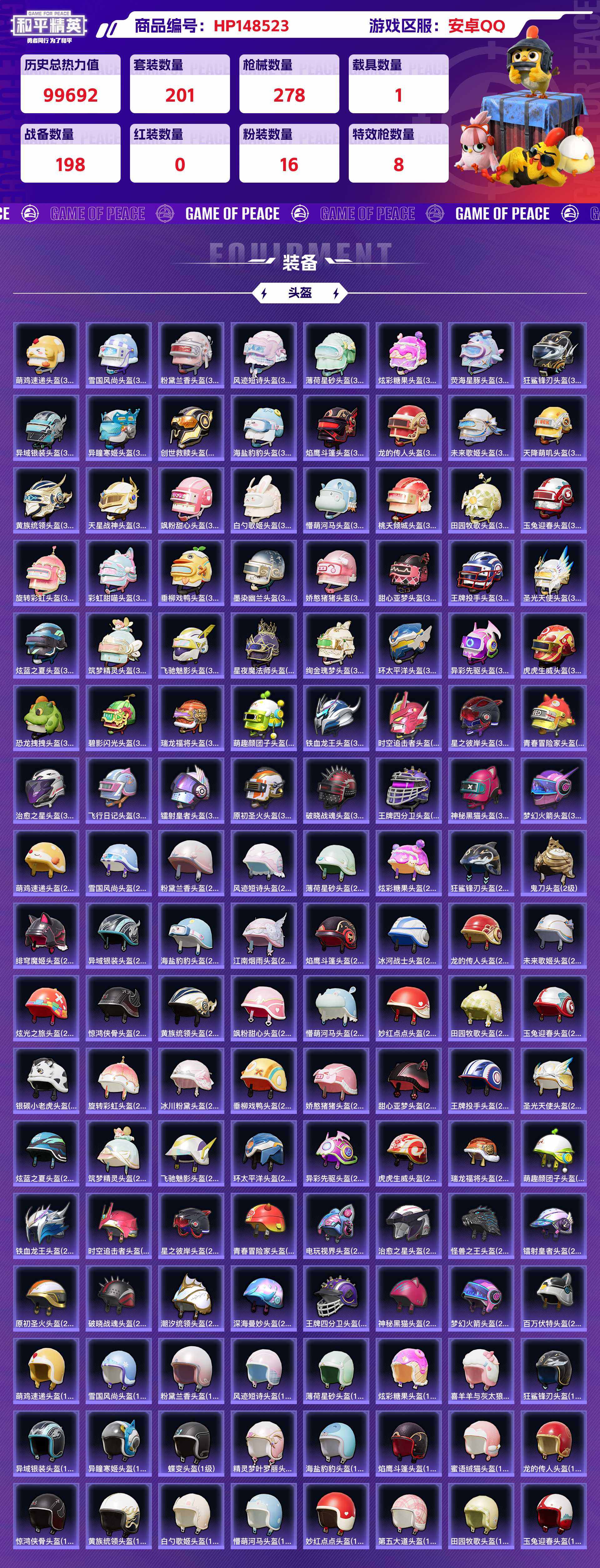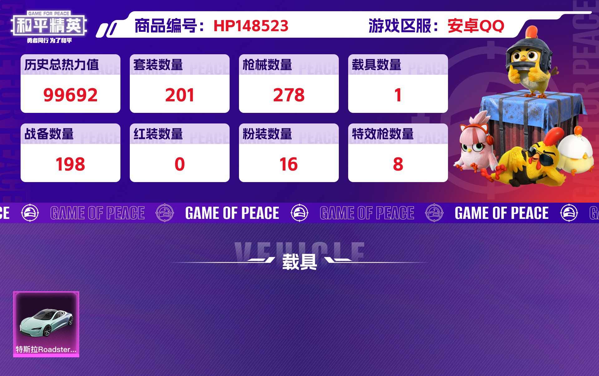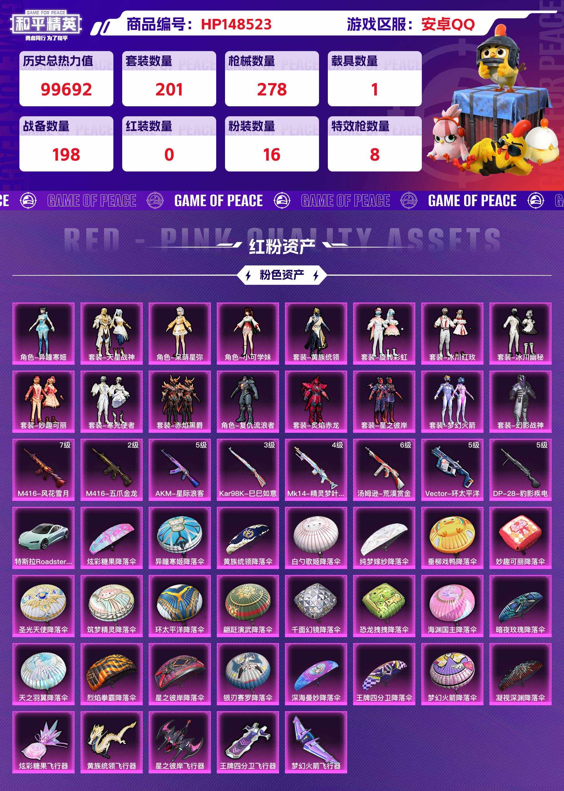 hp148523|精品和平号低价出 安卓qq 16粉装(异瞳寒姬天星战神呆萌星弥黄族统领旋转彩虹) 8粉呛(mk14-精灵梦叶汤姆逊-荒漠赏金vect-环太平洋dp-28-豹影疾电m416-五爪金龙 akm-星际浪客 kar98k-巳已如意) 1个七级(m416-风花雪月) 1载具