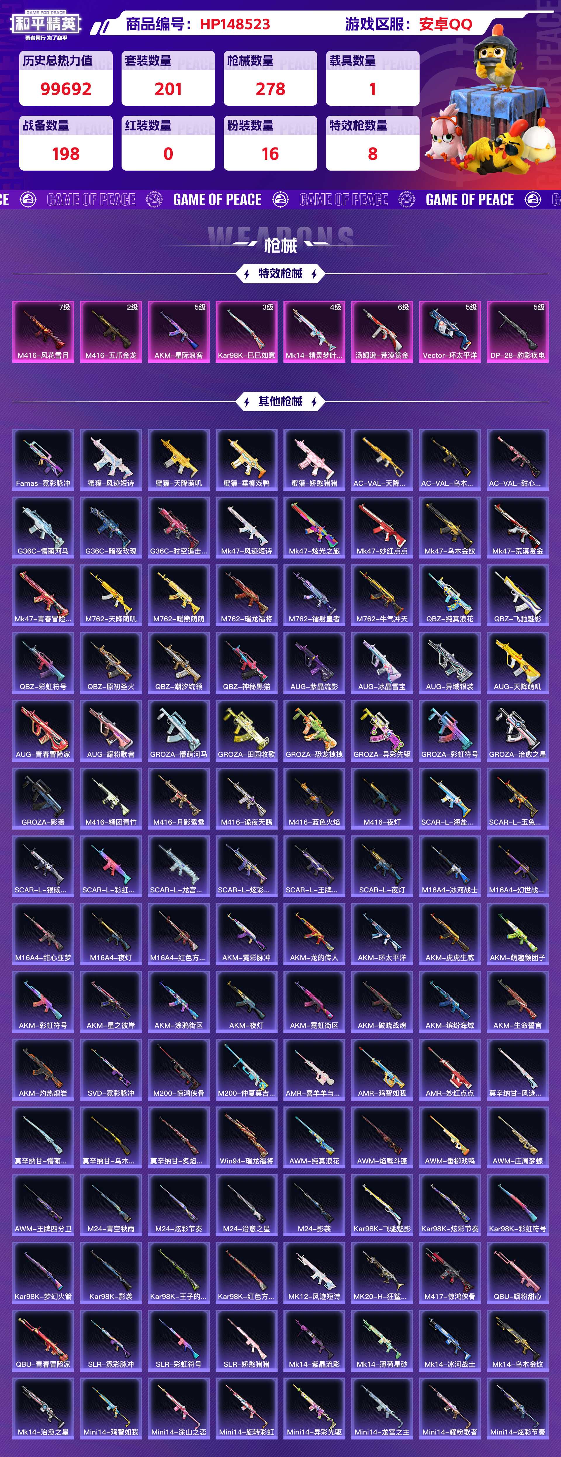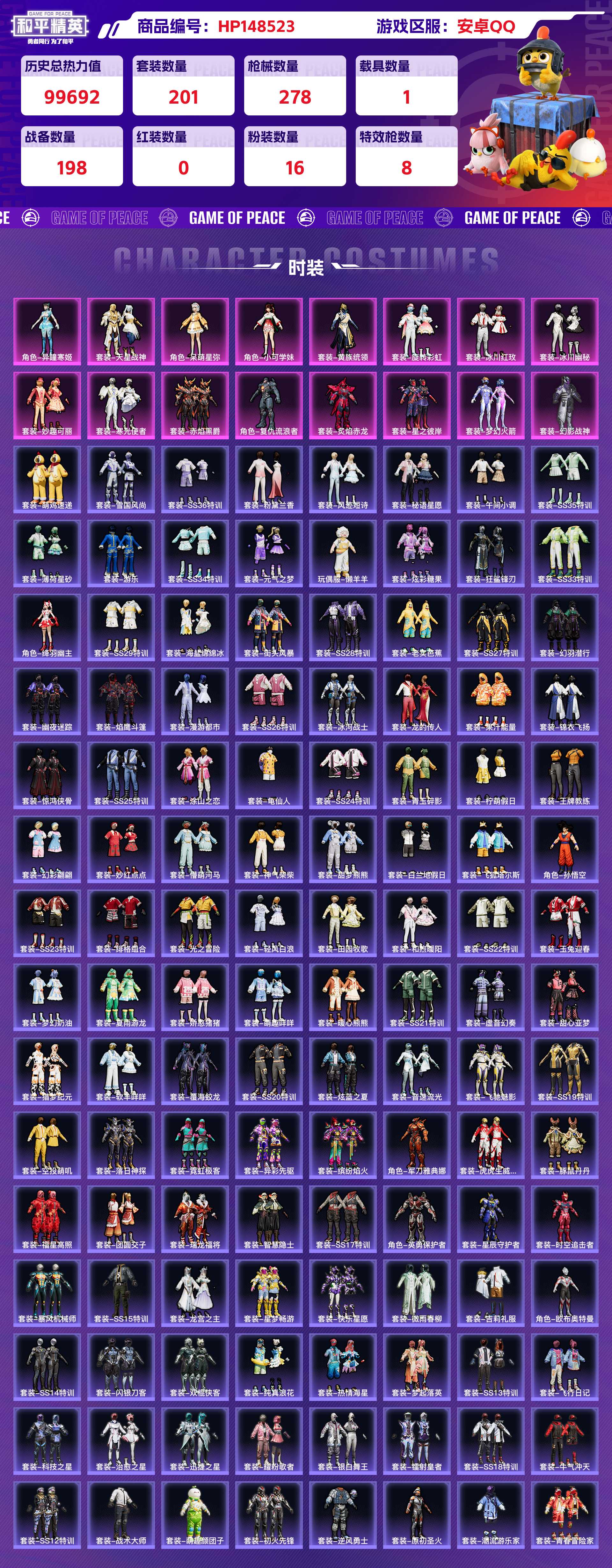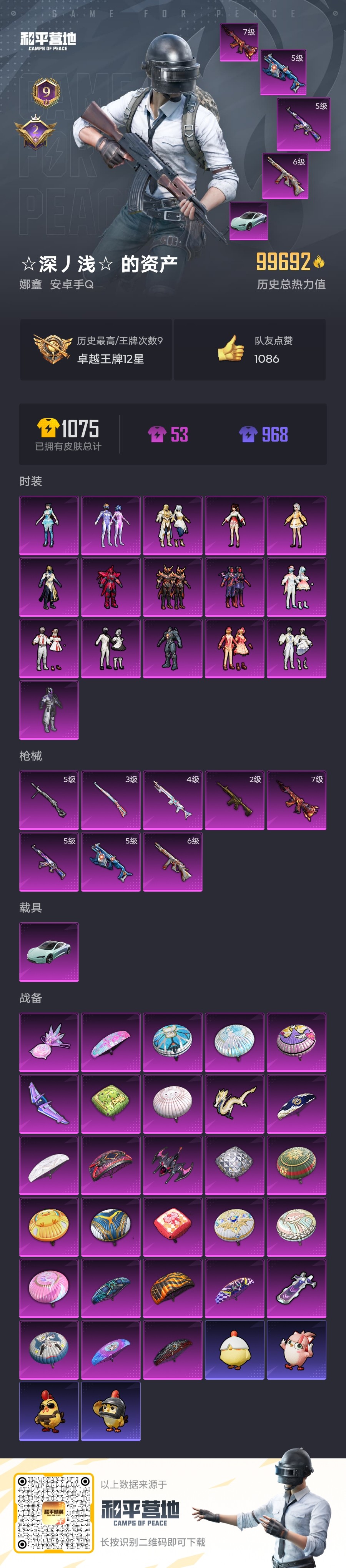 _2331421-安卓qq历史总热力值:99692粉装数量:16特效呛数量:8载具数量:1王牌印记:9历史最高段位:卓越王牌12星套装数量:201时装数量:733呛械数量:278战备数量:198装备数量:397载具:特斯拉roadster水滴蓝时装:套装-冰川幽秘套装-冰川红玫套装-天星战神套装-妙趣可丽套装-寒光使者套装-幻影战神套装-旋转彩虹套装-星之彼岸套装-梦幻火箭套装-炙焰赤龙套装-赤焰黑爵套装-黄族统领角色-呆萌星弥角色-复仇流浪者角色-小可学妹角色-异瞳寒姬套装-alanwalker套装-ss11特训套装-ss12特训套装-ss13特训套装-ss14特训套装-ss15特训套装-ss17特训套装-ss18特训套装-ss19特训套装-ss20特训套装-ss21特训套装-ss22特训套装-ss23特训套装-ss24特训套装-ss25特训套装-ss26特训套装-ss27特训套装-ss28特训套装-ss29特训套装-ss33特训套装-ss34特训套装-ss35特训套装-ss36特训套装-传奇侦探套装-元气之梦套装-光之冒险套装-冰川特警套装-冰河战士套装-击剑大师套装-初火先锋套装-北国孤狼套装-千禧之恋套装-午间小调套装-原初圣火套装-双棍侠客套装-吉莉礼服套装-和煦暖阳套装-团圆交子套装-坚韧舞者套装-夏雨游龙套装-大橘为重套装-妙红点点套装-娇憨猪猪套装-幻世保卫者套装-幻世战舞者套装-幻彩翩翩套装-幻影武者套装-幻羽潜行套装-幽夜迷踪套装-异彩先驱套装-微雨春柳套装-快乐星愿套装-怒火燎原套装-惊鸿侠骨套装-懵萌河马套装-战地督导套装-战地菁英套装-战术大师套装-探宝勇士套装-摇滚狂鲨套装-旭日情侣套装-时空追击者套装-星梦畅游套装-星辰守护者套装-春日漫步套装-智慧隐士套装-暖心熊熊套装-暗夜契约套装-暴风机械师套装-极速红龙套装-果汁能量套装-柠萌假日套装-梦幻奶油套装-梦起落英套装-沙漠兵团套装-沙漠毒蛇套装-治愈之星套装-浪漫天命套装-浪漫波比套装-海上生明月套装-海岛探路者套装-海洋之心套装-海盐绵绵冰套装-涂山之恋套装-游乐套装-湖蓝色名流套装-漫游都市套装-潮流游乐家套装-灰色格斗者套装-灼焰舞者套装-炫彩糖果套装-炫蓝之夏套装-热情海星套装-热血青春套装-焰鹰斗篷套装-牛气冲天套装-牛气满满套装-特战装甲套装-特殊使命套装-狂沙舞者套装-狂鲨锋刃套装-猎梦纪元套装-玉兔迎春套装-王牌教练套装-瑞龙福将套装-甜心亚梦套装-甜梦熊熊套装-田园牧歌套装-疯狂小兔子套装-白兰地假日套装-白熊同盟套装-白色伏地魔套装-破晓战魂套装-神气柴柴套装-神秘领域套装-福星高照套装-科技之星套装-秘语星愿套装-空投萌叽套装-竞技名士套装-竞技达人朋克套装-粉黛兰香套装-纯白誓言套装-纯真浪花套装-绯格组合套装-缤纷焰火套装-耀眼新星套装-耀粉歌者套装-老实芭蕉套装-荣耀套装-萌趣咩咩套装-萌趣颜团子套装-萌鸡速递套装-萌黄之夏套装-落日神探套装-蓝色运动套装-薄荷星砂套装-虎虎生威吉莉套装-虚音幻奏套装-街头风暴套装-覆海蛟龙套装-豚鼠丹丹套装-超能拳王套装-软羊咩咩套装-轻风白浪套装-迅捷之星套装-逆风勇士套装-都市漫游者套装-酒红色名流套装-酷潮明星套装-野性战心套装-银河圣歌套装-银白舞王套装-锦衣飞扬套装-镭射皇者套装-长空猛禽套装-闪银刀客套装-雪国风尚套装-霓虹极客套装-霓虹街区套装-青春冒险家套装-青涩时光套装-青玉碎影套装-音速流光套装-风迹短诗套装-飞狐塔尔斯套装-飞行日记套装-飞驰魅影套装-魅力单车套装-鹤鸣套装-麻辣教官套装-黄色名流套装-黄色运动套装-黎明保卫者套装-黑色伏地魔套装-龙宫之主套装-龙的传人套装-龙魂突击队套装-龟仙人玩偶服-懒羊羊角色-军刀雅典娜角色-孙悟空角色-欧布奥特曼角色-绛羽幽主角色-英勇保护者呛械:akm-星际浪客5级m416-五爪金龙2级m416-风花雪月7级ac-val-乌木金纹ac-val-天降萌叽ac-val-甜心亚梦akm-夜灯akm-彩虹符号akm-星之彼岸akm-涂鸦街区akm-灼热熔岩akm-环太平洋akm-生命誓言akm-破晓战魂akm-缤纷海域akm-萌趣颜团子akm-虎虎生威akm-霓彩脉冲akm-霓虹街区akm-龙的传人aug-冰晶雪宝aug-天降萌叽aug-异域银装aug-紫晶流影aug-耀粉歌者aug-青春冒险家famas-霓彩脉冲g36c-懵萌河马g36c-时空追击者g36c-暗夜玫瑰groza-异彩先驱groza-彩虹符号groza-影袭groza-恐龙拽拽groza-懵萌河马groza-治愈之星groza-田园牧歌m16a4-冰河战士m16a4-夜灯m16a4-幻世战舞者m16a4-甜心亚梦m16a4-红色方程式m416-夜灯m416-月影鸳鸯m416-糯团青竹m416-蓝色火焰m416-诡夜天鹅m762-天降萌叽m762-暖熊萌萌m762-牛气冲天m762-瑞龙福将m762-镭射皇者mk47-乌木金纹mk47-妙红点点mk47-炫光之旅mk47-荒漠赏金mk47-青春冒险家mk47-风迹短诗q-原初圣火q-彩虹符号q-潮汐统领q-神秘黑猫q-纯真浪花q-飞驰魅影scar-l-夜灯scar-l-彩虹符号scar-l-海盐豹豹scar-l-炫彩节奏scar-l-玉兔迎春scar-l-王牌四分卫scar-l-银碳小老虎scar-l-龙宫之主蜜獾-垂柳戏鸭蜜獾-天降萌叽蜜獾-娇憨猪猪蜜獾-风迹短诗kar98k-巳巳如意3级amr-喜羊羊与灰太狼amr-妙红点点amr-鸡智如我awm-垂柳戏鸭awm-庄周梦蝶awm-焰鹰斗篷awm-王牌四分卫awm-纯真浪花kar98k-彩虹符号kar98k-影袭kar98k-梦幻火箭kar98k-炫彩节奏kar98k-王子的夏天kar98k-红色方程式kar98k-飞驰魅影m200-仲夏莫吉托m200-惊鸿侠骨m24-影袭m24-治愈之星m24-炫彩节奏m24-青空秋雨svd-霓彩脉冲win94-瑞龙福将莫辛纳甘-乌木金纹莫辛纳甘-懵萌河马莫辛纳甘-炙焰牛王莫辛纳甘-风迹短诗mk14-精灵梦叶罗丽4级m417-惊鸿侠骨mk12-风迹短诗mk20-h-
