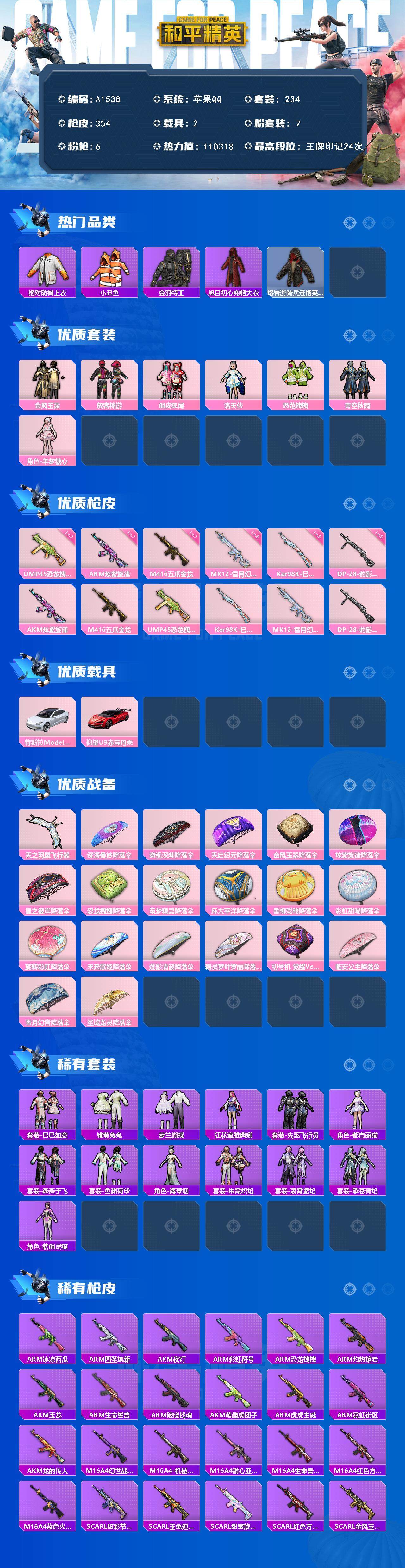 [14888020]苹果 【小号】手q-7粉装-6特效呛-2载具-1粉色飞行器-110318热力值-24王牌印记-234套装-354呛皮 【热门品类】:绝对防御上衣,套装-小丑鱼,套装-金羽特工,旭日初心兜帽大衣,套装-龟仙人,角色-mark.06,熔岩游骑兵连帽夹克 【粉色套装】:粉装-金风玉露,粉装-放客神游,粉装-俏皮狐尾,角色-洛天依,粉装-恐龙拽拽,粉装-青空秋雨,角色-羊梦糖心 【粉色呛皮等级】:akm-炫紫旋律七级,m416-五爪金龙七级,ump45-恐龙拽拽七级,kar98k-巳巳如意五级,mk12-雪月幻音六级,dp-28-豹影疾电五级 【粉色载具】:特斯拉model 3(珍珠白),仰望u9(赤霞丹朱) 【粉色呛皮】:akm-炫紫旋律,m416-五爪金龙,ump45-恐龙拽拽,kar98k-巳巳如意,mk12-雪月幻音,dp-28-豹影疾电 【粉色飞行器】:天之羽翼飞行器 【粉色降落伞】:深海曼妙降落伞,凝视深渊降落伞,天启纪元降落伞,金风玉露降落伞,炫紫旋律降落伞,星之彼岸降落伞,恐龙拽拽降落伞,筑梦精灵降落伞,环太平洋降落伞,垂柳戏鸭降落伞,彩虹甜喵降落伞,旋转彩虹降落伞,未来歌姬降落伞,莲影清波降落伞,精灵梦叶罗丽降落伞,初号机 觉醒ver.降落伞,临安公主降落伞,雪月幻音降落伞,圣域龙灵降落伞 【稀有套装】:套装-龟仙人,套装-巳巳如意,套装-雏菊兔兔,套装-萝兰蝴蝶,角色-狂花道·雅典娜,套装-先驱飞行员,角色-都市丽猫,套装-燕燕于飞,套装-鱼渊荷华,角色-海琴烟,套装-朱霞炽焰,套装-凌霄紫焰,套装-擎苍青焰,角色-紫俏灵猫 【稀有呛皮】:akm-冰凉西瓜,akm-四圣焕新,akm-夜灯,akm-彩虹符号,akm-恐龙拽拽,akm-灼热熔岩,akm-玉龙,akm-生命誓言,akm-破晓战魂,akm-萌趣颜团子,akm-虎虎生威,akm-霓虹街区,akm-龙的传人,m16a4-幻世战舞者,m16a4-机械英豪,m16a4-甜心亚梦,m16a4-生命誓言,m16a4-红色方程式,m16a4-蓝色火焰,scar-l-炫彩节奏,scar-l-玉兔迎春,scar-l-甜蜜旋律,scar-l-红色方程式,scar-l-金风玉露,scar-l-雷霆特警,scar-l-黄金龙骨,m416-仓鼠灰灰,m416-夜灯,m416-糯团青竹,m416-