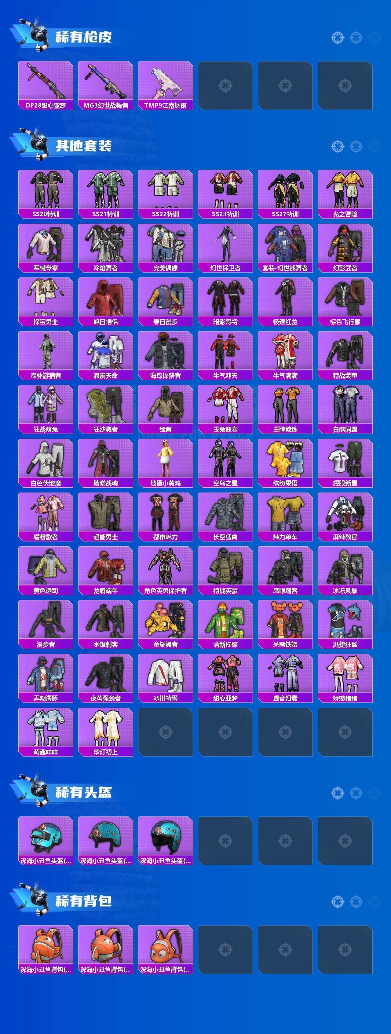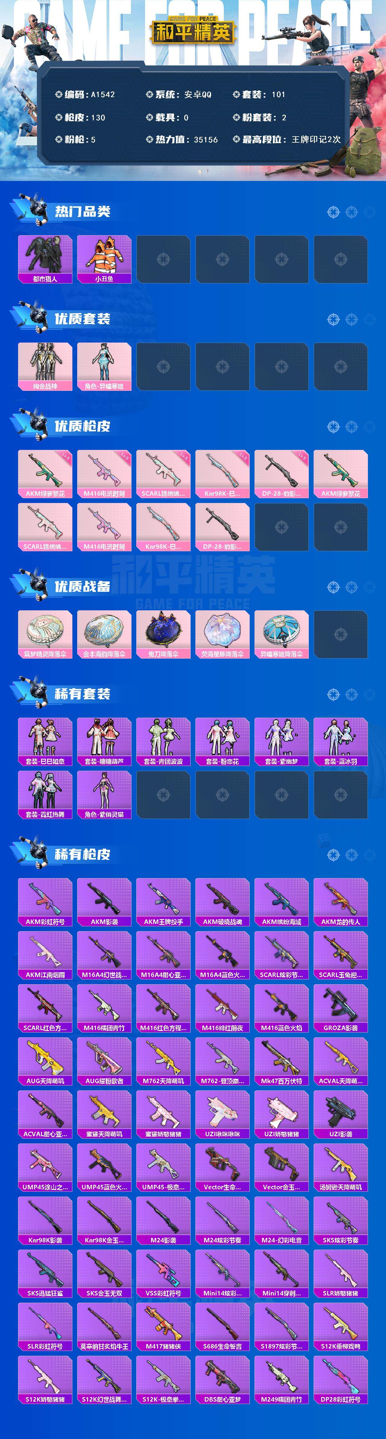 [14832655]安卓 【男神号 浪漫天命/都市猎人/akm-绿萝繁花五级】手q-2粉装-5特效呛-0载具-1粉色飞行器-35156热力值-2王牌印记-101套装-130呛皮 【热门品类】:套装-浪漫天命,套装-都市猎人,套装-小丑鱼,套装-暗影哥特 【粉色套装】:粉装-绚金战神,角色-异瞳寒姬 【粉色呛皮等级】:akm-绿萝繁花五级,scar-l-锦绣绵绵五级,m416-电玩时刻五级,kar98k-巳巳如意五级,dp-28-豹影疾电五级 【粉色呛皮】:akm-绿萝繁花,scar-l-锦绣绵绵,m416-电玩时刻,kar98k-巳巳如意,dp-28-豹影疾电 【粉色降落伞】:筑梦精灵降落伞,金丰海韵降落伞,鬼刀降落伞,荧海星豚降落伞,异瞳寒姬降落伞 【稀有套装】:套装-巳巳如意,套装-雪国风尚,套装-糖糖葫芦,套装-青团波波,套装-粉恋花,套装-紫幽梦,套装-蓝冰羽,套装-霓虹热舞,角色-紫俏灵猫,套装-炫彩糖果 【稀有呛皮】:aug-冰晶雪宝,akm-彩虹符号,akm-影袭,akm-江南烟雨,akm-王牌投手,akm-破晓战魂,akm-缤纷海域,akm-龙的传人,m16a4-幻世战舞者,m16a4-甜心亚梦,m16a4-蓝色火焰,scar-l-炫彩节奏,scar-l-玉兔迎春,scar-l-红色方程式,m416-糯团青竹,m416-红色方程式,m416-绯红前夜,m416-蓝色火焰,groza-影袭,aug-天降萌叽,aug-耀粉歌者,m762-天降萌叽,m762-登顶巅峰,mk47-百万伏特,ac-val-天降萌叽,ac-val-甜心亚梦,蜜獾-天降萌叽,蜜獾-娇憨猪猪,uzi-啾咪啾咪,uzi-娇憨猪猪,uzi-影袭,ump45-涂山之恋,ump45-蓝色火焰,ump45-极意拳锋,vect-生命誓言,vect-金玉无双,汤姆逊-天降萌叽,kar98k-影袭,kar98k-金玉无双,m24-影袭,m24-炫彩节奏,m24-幻彩电音,sks-炫彩节奏,sks-迅猛狂鲨,sks-金玉无双,vss-彩虹符号,mini14-炫彩节奏,mini14-穿刺龙虾,slr-娇憨猪猪,slr-彩虹符号,莫辛纳甘-炙焰牛王,m417-猪猪侠,s686-生命誓言,s1897-炫彩节奏,s12k-垂柳戏鸭,s12k-娇憨猪猪,s12k-幻世战舞者,s12k-极意拳锋,
