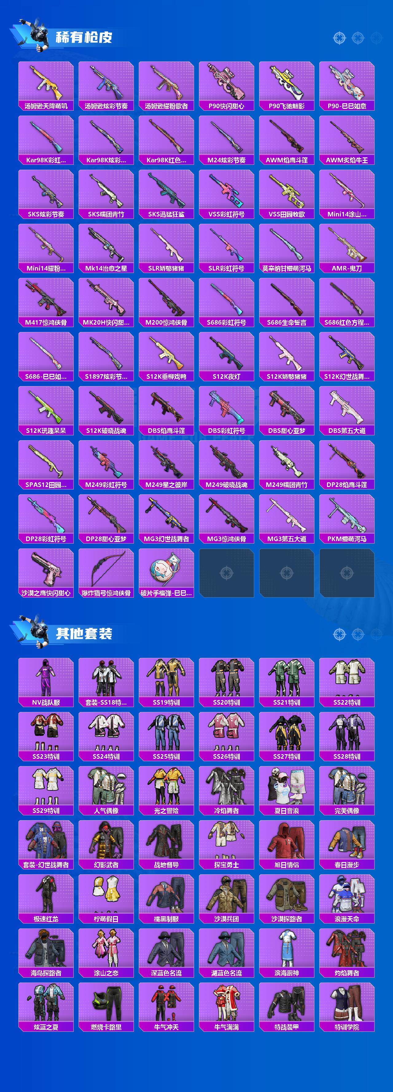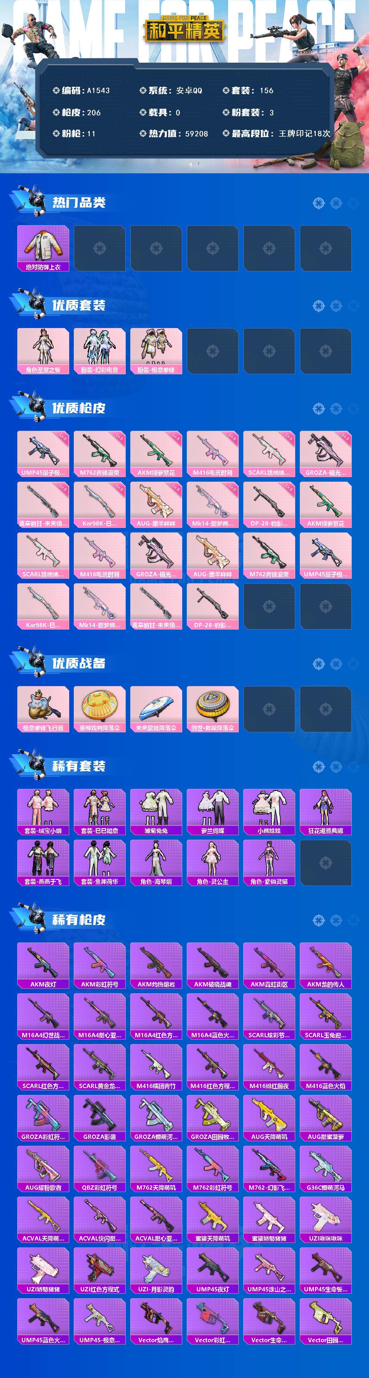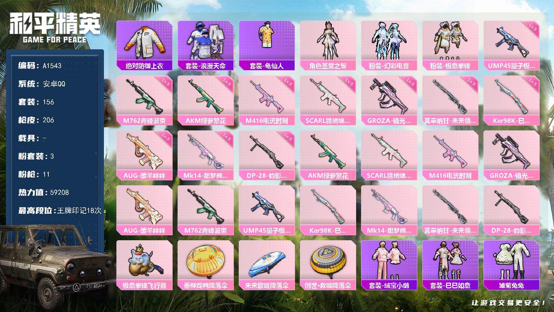 [14829476]安卓 【小号 粉装-幻彩电音/粉装-极意拳锋/浪漫天命】手q-3粉装-11特效呛-0载具-2粉色飞行器-59208热力值-18王牌印记-156套装-206呛皮 【热门品类】:绝对防御上衣,套装-浪漫天命,套装-龟仙人 【粉色套装】:角色-圣堂之誓,粉装-幻彩电音,粉装-极意拳锋 【粉色呛皮等级】:akm-绿萝繁花五级,scar-l-锦绣绵绵五级,m416-电玩时刻五级,groza-镜光银凌五级,aug-暖羊咩咩五级,m762-青锋波束五级,ump45-量子极限五级,kar98k-巳巳如意五级,mk14-甜梦熊击五级,莫辛纳甘-未来领航者五级,dp-28-豹影疾电五级 【粉色呛皮】:akm-绿萝繁花,scar-l-锦绣绵绵,m416-电玩时刻,groza-镜光银凌,aug-暖羊咩咩,m762-青锋波束,ump45-量子极限,kar98k-巳巳如意,mk14-甜梦熊击,莫辛纳甘-未来领航者,dp-28-豹影疾电 【粉色飞行器】:极意拳锋飞行器 【粉色降落伞】:垂柳戏鸭降落伞,未来歌姬降落伞,创世·救赎降落伞 【稀有套装】:套装-龟仙人,套装-绒宝小鹅,套装-巳巳如意,套装-雏菊兔兔,套装-萝兰蝴蝶,套装-小熊娃娃,角色-狂花道·雅典娜,套装-燕燕于飞,套装-鱼渊荷华,角色-海琴烟,角色-灵公主,角色-紫俏灵猫,套装-炫彩糖果 【稀有呛皮】:aug-冰晶雪宝,akm-夜灯,akm-彩虹符号,akm-灼热熔岩,akm-破晓战魂,akm-霓虹街区,akm-龙的传人,m16a4-幻世战舞者,m16a4-甜心亚梦,m16a4-红色方程式,m16a4-蓝色火焰,scar-l-炫彩节奏,scar-l-玉兔迎春,scar-l-红色方程式,scar-l-黄金龙骨,m416-糯团青竹,m416-红色方程式,m416-绯红前夜,m416-蓝色火焰,groza-彩虹符号,groza-影袭,groza-懵萌河马,groza-田园牧歌,aug-天降萌叽,aug-甜蜜菠萝,aug-耀粉歌者,q-彩虹符号,m762-天降萌叽,m762-彩虹符号,m762-幻影飞狐,g36c-懵萌河马,ac-val-天降萌叽,ac-val-快闪甜心,ac-val-甜心亚梦,蜜獾-天降萌叽,蜜獾-娇憨猪猪,uzi-啾咪啾咪,uzi-娇憨猪猪,uzi-红色方程式,uzi-月