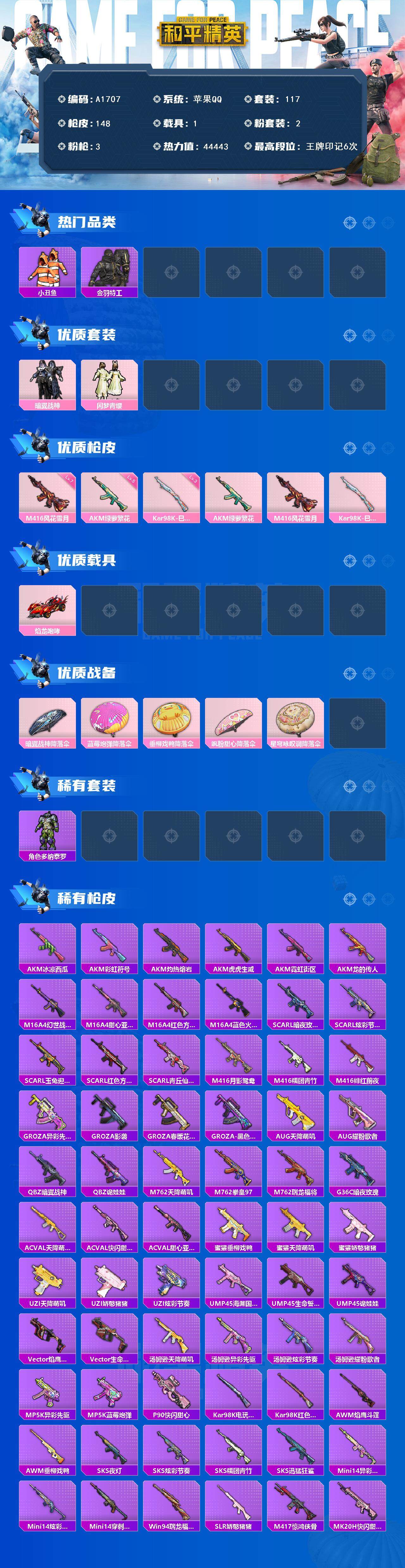 [14930598]苹果 手q-2粉装-3特效呛-1载具-0粉色飞行器-44443热力值-6王牌印记-117套装-148呛皮 【热门品类】:套装-浪漫天命,套装-小丑鱼,套装-金羽特工,套装-暗影哥特,套装-粉红小猪,角色-mark.06 【粉色套装】:粉装-暗翼战神,粉装-闲梦青缨 【粉色呛皮等级】:akm-绿萝繁花五级,m416-风花雪月七级,kar98k-巳巳如意三级 【粉色载具】:焰龙咆哮 【粉色呛皮】:akm-绿萝繁花,m416-风花雪月,kar98k-巳巳如意 【粉色降落伞】:暗翼战神降落伞,蓝莓炮弹降落伞,垂柳戏鸭降落伞,飒粉甜心降落伞,星穹咏叹调降落伞 【稀有套装】:套装-雪国风尚,角色-多纳泰罗 【稀有呛皮】:akm-冰凉西瓜,akm-彩虹符号,akm-灼热熔岩,akm-虎虎生威,akm-霓虹街区,akm-龙的传人,m16a4-幻世战舞者,m16a4-甜心亚梦,m16a4-红色方程式,m16a4-蓝色火焰,scar-l-暗夜玫瑰,scar-l-炫彩节奏,scar-l-玉兔迎春,scar-l-红色方程式,scar-l-青丘仙客,m416-月影鸳鸯,m416-糯团青竹,m416-绯红前夜,groza-异彩先驱,groza-影袭,groza-春暖花开,groza-黑色刀锋,aug-天降萌叽,aug-耀粉歌者,q-暗翼战神,q-诡娃娃,m762-天降萌叽,m762-拳皇97,m762-瑞龙福将,g36c-暗夜玫瑰,ac-val-天降萌叽,ac-val-快闪甜心,ac-val-甜心亚梦,蜜獾-垂柳戏鸭,蜜獾-天降萌叽,蜜獾-娇憨猪猪,uzi-天降萌叽,uzi-娇憨猪猪,uzi-炫彩节奏,ump45-海渊国主,ump45-生命誓言,ump45-诡娃娃,vect-焰鹰斗篷,vect-生命誓言,汤姆逊-天降萌叽,汤姆逊-异彩先驱,汤姆逊-炫彩节奏,汤姆逊-耀粉歌者,mp5k-异彩先驱,mp5k-蓝莓炮弹,p90-快闪甜心,kar98k-电玩视界,kar98k-红色方程式,awm-焰鹰斗篷,awm-垂柳戏鸭,sks-夜灯,sks-炫彩节奏,sks-糯团青竹,sks-迅猛狂鲨,mini14-异彩先驱,mini14-炫彩节奏,mini14-穿刺龙虾,win94-瑞龙福将,slr-娇憨猪猪,m417-惊鸿侠骨,mk20-h-快闪甜心,m200-惊鸿侠骨,s686