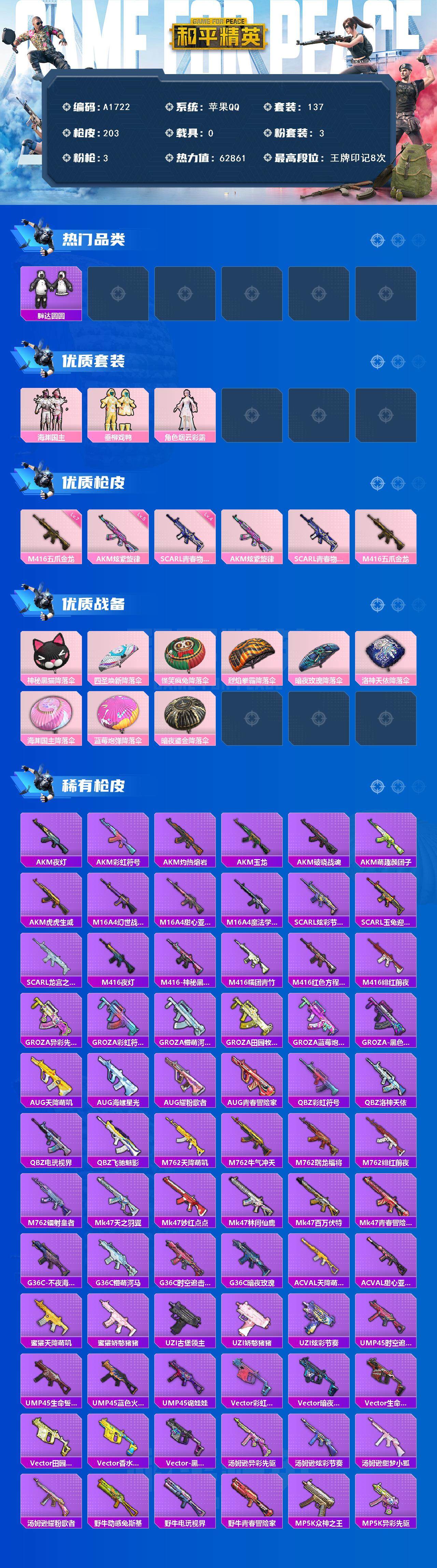 [14899862]苹果【小号/暗影哥特】 手q-3粉装-3特效呛-0载具-0粉色飞行器-62861热力值-8王牌印记-137套装-203呛皮 【热门品类】:套装-浪漫天命,套装-胖达圆圆,套装-龟仙人,套装-暗影哥特,套装-粉红小猪 【粉色套装】:粉装-海渊国主,粉装-垂柳戏鸭,角色-烟云彩露 【粉色呛皮等级】:akm-炫紫旋律五级,scar-l-青春物语四级,m416-五爪金龙七级 【粉色呛皮】:akm-炫紫旋律,scar-l-青春物语,m416-五爪金龙 【粉色降落伞】:神秘黑猫降落伞,四圣焕新降落伞,怪笑疯兔降落伞,烈焰拳霸降落伞,暗夜玫瑰降落伞,洛神天依降落伞,海渊国主降落伞,蓝莓炮弹降落伞,暗夜鎏金降落伞 【稀有套装】:套装-龟仙人,套装-雪国风尚 【稀有呛皮】:akm-夜灯,akm-彩虹符号,akm-灼热熔岩,akm-玉龙,akm-破晓战魂,akm-萌趣颜团子,akm-虎虎生威,m16a4-幻世战舞者,m16a4-甜心亚梦,m16a4-魔法学院,scar-l-炫彩节奏,scar-l-玉兔迎春,scar-l-龙宫之主,m416-夜灯,m416-神秘黑猫,m416-糯团青竹,m416-红色方程式,m416-绯红前夜,groza-异彩先驱,groza-彩虹符号,groza-懵萌河马,groza-田园牧歌,groza-蓝莓炮弹,groza-黑色刀锋,aug-天降萌叽,aug-海螺星光,aug-耀粉歌者,aug-青春冒险家,q-彩虹符号,q-洛神天依,q-电玩视界,q-飞驰魅影,m762-天降萌叽,m762-牛气冲天,m762-瑞龙福将,m762-绯红前夜,m762-镭射皇者,mk47-天之羽翼,mk47-妙红点点,mk47-林间仙鹿,mk47-百万伏特,mk47-青春冒险家,g36c-不夜海上花,g36c-懵萌河马,g36c-时空追击者,g36c-暗夜玫瑰,ac-val-天降萌叽,ac-val-甜心亚梦,蜜獾-天降萌叽,蜜獾-娇憨猪猪,uzi-古堡领主,uzi-娇憨猪猪,uzi-炫彩节奏,ump45-时空追击者,ump45-生命誓言,ump45-蓝色火焰,ump45-诡娃娃,vect-彩虹符号,vect-暗夜玫瑰,vect-生命誓言,vect-田园牧歌,vect-香水柠檬,vect-黑色刀锋,汤姆逊-异彩先驱,汤姆逊-炫彩节奏