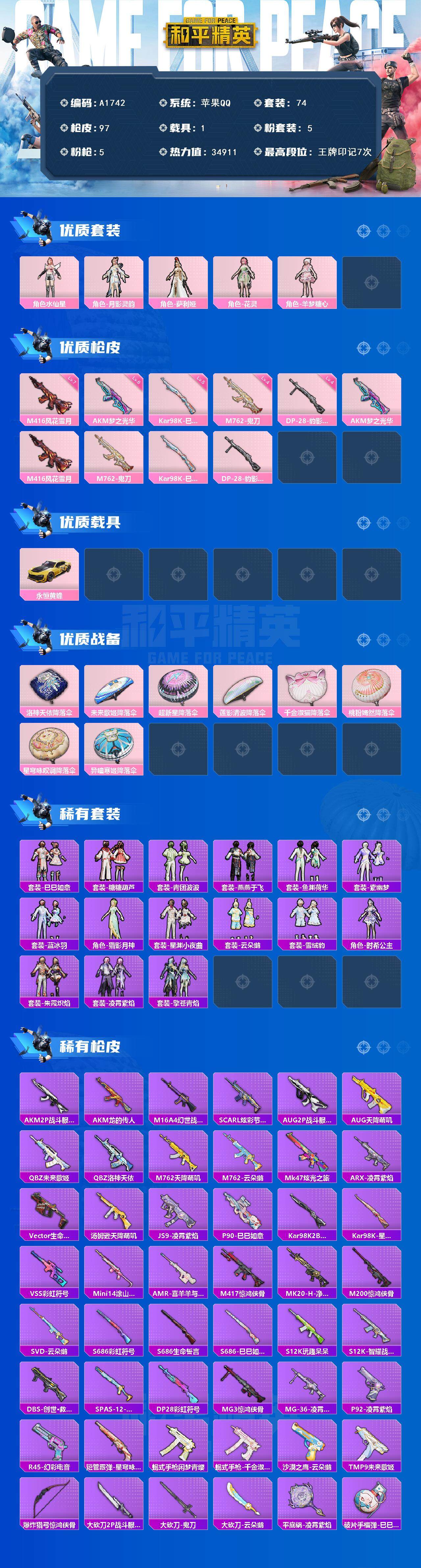 [14956630]苹果【小号/粉螳螂/蓝螳螂/5粉装-5特效呛-1载具-1粉色飞行器】 手q34911热力值-7王牌印记-74套装-97呛皮 【热门品类】:角色-2b战斗服款,角色-2p战斗服款,角色-8号机,角色-mark.06 【粉色套装】:角色-水仙星,角色-月影灵韵,角色-萨利娅,角色-花灵,角色-羊梦糖心 【粉色呛皮等级】:akm-梦之光华六级,m416-风花雪月七级,m762-鬼刀四级,kar98k-巳巳如意五级,dp-28-豹影疾电四级 【粉色载具】:永恒黄蜂 【粉色呛皮】:akm-梦之光华,m416-风花雪月,m762-鬼刀,kar98k-巳巳如意,dp-28-豹影疾电 【粉色降落伞】:洛神天依降落伞,未来歌姬降落伞,超新星降落伞,莲影清波降落伞,千金淑猫降落伞,桃粉嫣然降落伞,星穹咏叹调降落伞,异瞳寒姬降落伞 【稀有套装】:套装-巳巳如意,套装-糖糖葫芦,套装-青团波波,套装-燕燕于飞,套装-鱼渊荷华,套装-紫幽梦,套装-蓝冰羽,角色-猎影月神,套装-星渊小夜曲,套装-云朵鹅,套装-雪绒豹,角色-时希公主,套装-朱霞炽焰,套装-凌霄紫焰,套装-擎苍青焰,套装-炫彩糖果 【稀有呛皮】:akm-2p战斗服款,akm-龙的传人,m16a4-幻世战舞者,scar-l-炫彩节奏,aug-2p战斗服款,aug-天降萌叽,q-未来歌姬,q-洛神天依,m762-天降萌叽,m762-云朵鹅,mk47-炫光之旅,arx-凌霄紫焰,vect-生命誓言,汤姆逊-天降萌叽,js9-凌霄紫焰,p90-巳巳如意,kar98k-2b战斗服款,kar98k-星穹咏叹调,vss-彩虹符号,mini14-涂山之恋,amr-喜羊羊与灰太狼,m417-惊鸿侠骨,mk20-h-净心行者,m200-惊鸿侠骨,svd-云朵鹅,s686-彩虹符号,s686-生命誓言,s686-巳巳如意,s12k-玩趣呆呆,s12k-智耀战神,dbs-创世·救赎,spas-12-云朵鹅,dp-28-彩虹符号,mg3-惊鸿侠骨,mg-36-凌霄紫焰,p92-凌霄紫焰,r45-幻彩电音,短管霰弹-星穹咏叹调,蝎式手呛-闲梦青缨,蝎式手呛-千金淑猫,沙墨之鹦-云朵鹅,tmp-9-未来歌姬,爆炸猎弓-惊鸿侠骨,大砍刀-2p战斗服款,大砍刀-云朵鹅,大砍刀-鬼刀,平底锅-凌霄紫焰,破片手留单-巳巳如意 【