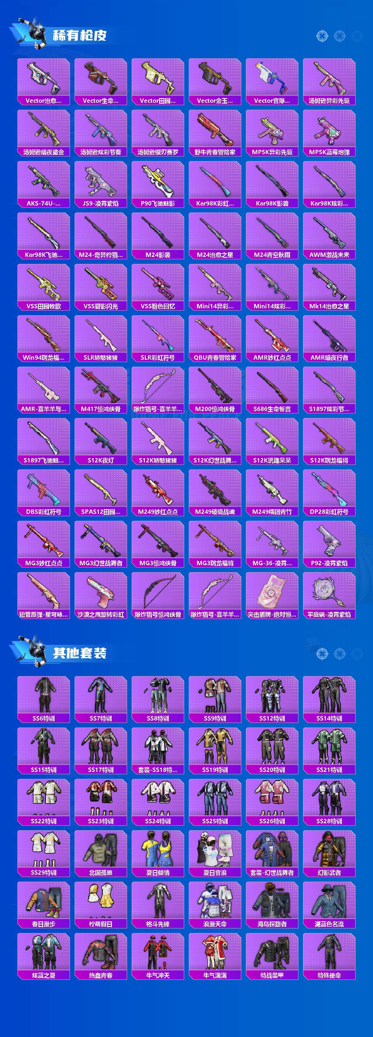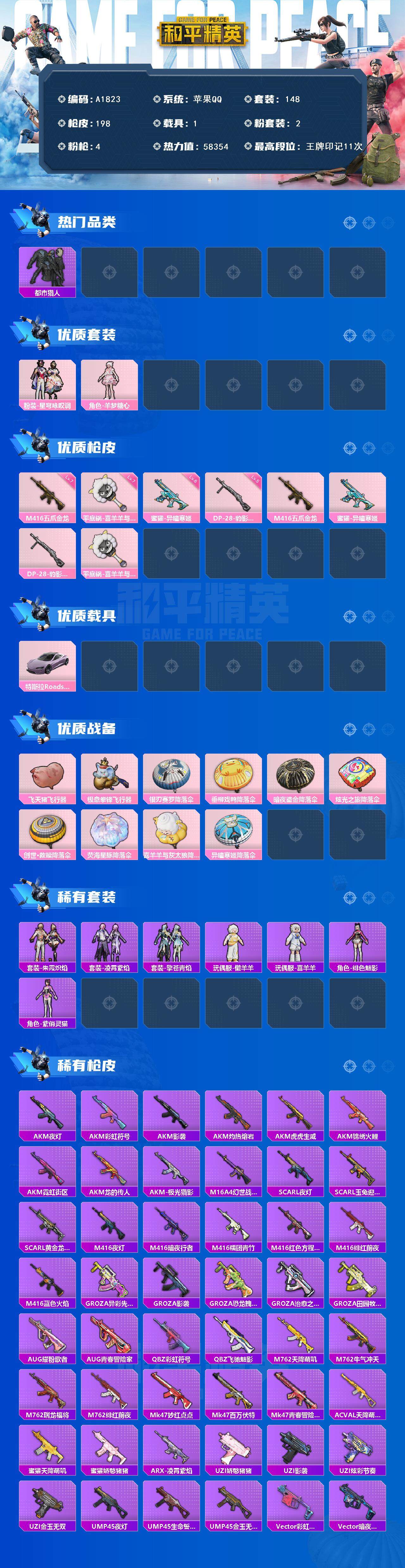[14899783]苹果 手q-2粉装-4特效呛-1载具-3粉色飞行器-58354热力值-11王牌印记-148套装-198呛皮 【热门品类】:套装-浪漫天命,套装-都市猎人,套装-龟仙人 【粉色套装】:粉装-星穹咏叹调,角色-羊梦糖心 【粉色呛皮等级】:m416-五爪金龙七级,蜜獾-异瞳寒姬六级,dp-28-豹影疾电五级,平底锅-喜羊羊与灰太狼七级 【粉色载具】:特斯拉roadster(沁心粉) 【粉色呛皮】:m416-五爪金龙,蜜獾-异瞳寒姬,dp-28-豹影疾电,平底锅-喜羊羊与灰太狼 【粉色飞行器】:飞天猪飞行器,极意拳锋飞行器 【粉色降落伞】:银刃赛罗降落伞,垂柳戏鸭降落伞,暗夜鎏金降落伞,炫光之旅降落伞,创世·救赎降落伞,荧海星豚降落伞,喜羊羊与灰太狼降落伞,异瞳寒姬降落伞 【稀有套装】:套装-龟仙人,套装-朱霞炽焰,套装-凌霄紫焰,套装-擎苍青焰,玩偶服-懒羊羊,玩偶服-喜羊羊,角色-绯色魅影,角色-紫俏灵猫,套装-炫彩糖果 【稀有呛皮】:aug-冰晶雪宝,akm-夜灯,akm-彩虹符号,akm-影袭,akm-灼热熔岩,akm-虎虎生威,akm-锦绣火鲤,akm-霓虹街区,akm-龙的传人,akm-极光猎影,m16a4-幻世战舞者,scar-l-夜灯,scar-l-玉兔迎春,scar-l-黄金龙骨,m416-夜灯,m416-暗夜行者,m416-糯团青竹,m416-红色方程式,m416-绯红前夜,m416-蓝色火焰,groza-异彩先驱,groza-影袭,groza-恐龙拽拽,groza-治愈之星,groza-田园牧歌,aug-耀粉歌者,aug-青春冒险家,q-彩虹符号,q-飞驰魅影,m762-天降萌叽,m762-牛气冲天,m762-瑞龙福将,m762-绯红前夜,mk47-妙红点点,mk47-百万伏特,mk47-青春冒险家,ac-val-天降萌叽,蜜獾-天降萌叽,蜜獾-娇憨猪猪,arx-凌霄紫焰,uzi-娇憨猪猪,uzi-影袭,uzi-炫彩节奏,uzi-金玉无双,ump45-夜灯,ump45-生命誓言,ump45-金玉无双,vect-彩虹符号,vect-暗夜玫瑰,vect-治愈之星,vect-生命誓言,vect-田园牧歌,vect-金玉无双,vect-音爆索尼克,汤姆逊-异彩先驱,汤姆逊-暗夜鎏金,汤姆逊-炫彩节奏,汤姆逊