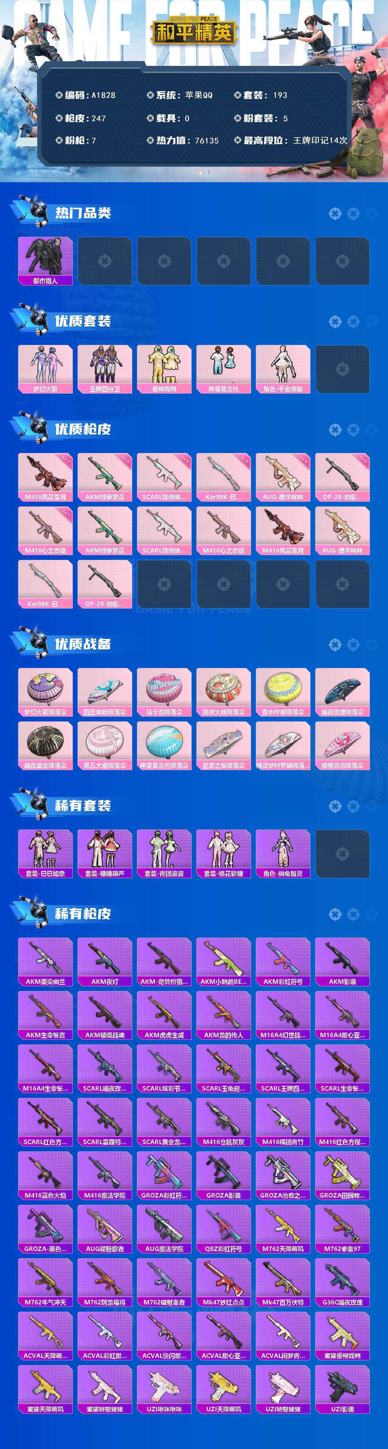 [14989579]苹果【小号/梦幻火箭/都市猎人/百万伏特背包】 手q-5粉装-7特效呛-0载具-1粉色飞行器-76135热力值-14王牌印记-193套装-247呛皮 【热门品类】:粉装-梦幻火箭,套装-浪漫天命,套装-都市猎人,套装-深海小丑鱼,套装-奇异狩猎者,套装-龟仙人 【粉色套装】:粉装-梦幻火箭,粉装-王牌四分卫,粉装-垂柳戏鸭,粉装-仲夏莫吉托,角色-千金淑猫 【粉色呛皮等级】:akm-绿萝繁花五级,scar-l-锦绣绵绵五级,m416-心之恋语一级,m416-风花雪月七级,aug-暖羊咩咩五级,kar98k-巳巳如意五级,dp-28-豹影疾电五级 【粉色呛皮】:akm-绿萝繁花,scar-l-锦绣绵绵,m416-心之恋语,m416-风花雪月,aug-暖羊咩咩,kar98k-巳巳如意,dp-28-豹影疾电 【粉色降落伞】:梦幻火箭降落伞,四圣焕新降落伞,马卡龙降落伞,锦绣火鲤降落伞,香水柠檬降落伞,暗夜玫瑰降落伞,暗夜鎏金降落伞,第五大道降落伞,仲夏莫吉托降落伞,圣堂之誓降落伞,精灵梦叶罗丽降落伞,樱桃泡泡降落伞 【稀有套装】:套装-龟仙人,套装-巳巳如意,套装-雪国风尚,套装-糖糖葫芦,套装-青团波波,套装-棉花软糖,角色-俏兔智灵,套装-炫彩糖果 【稀有呛皮】:akm-墨染幽兰,akm-夜灯,akm-奇异狩猎者,akm-小鹦鹉bebe,akm-彩虹符号,akm-影袭,akm-生命誓言,akm-破晓战魂,akm-虎虎生威,akm-龙的传人,m16a4-幻世战舞者,m16a4-甜心亚梦,m16a4-生命誓言,scar-l-暗夜玫瑰,scar-l-炫彩节奏,scar-l-玉兔迎春,scar-l-王牌四分卫,scar-l-生命誓言,scar-l-红色方程式,scar-l-雷霆特警,scar-l-黄金龙骨,m416-仓鼠灰灰,m416-糯团青竹,m416-红色方程式,m416-蓝色火焰,m416-魔法学院,groza-彩虹符号,groza-影袭,groza-治愈之星,groza-田园牧歌,groza-黑色刀锋,aug-耀粉歌者,aug-魔法学院,q-彩虹符号,m762-天降萌叽,m762-拳皇97,m762-牛气冲天,m762-瑞龙福将,m762-镭射皇者,mk47-妙红点点,mk47-百万伏特,g36c-暗夜玫瑰,ac-val-天降萌叽,a