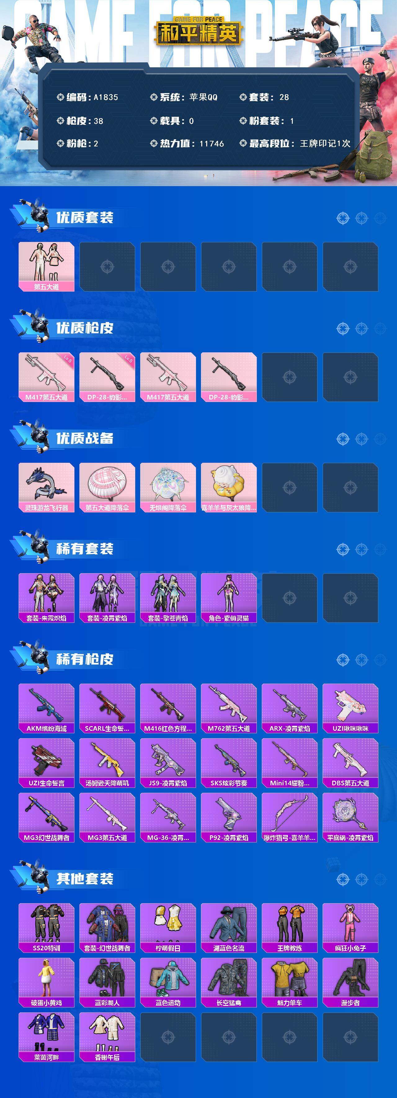 [14989756]苹果 【小号】手q-1粉装-2特效呛-0载具-2粉色飞行器-11746热力值-1王牌印记-28套装-38呛皮 【粉色套装】:粉装-第五大道 【粉色呛皮等级】:m417-第五大道五级,dp-28-豹影疾电五级 【粉色呛皮】:m417-第五大道,dp-28-豹影疾电 【粉色飞行器】:灵珠游龙飞行器 【粉色降落伞】:第五大道降落伞,无垠阁降落伞,喜羊羊与灰太狼降落伞 【稀有套装】:套装-雪国风尚,套装-朱霞炽焰,套装-凌霄紫焰,套装-擎苍青焰,角色-紫俏灵猫,套装-炫彩糖果 【稀有呛皮】:aug-冰晶雪宝,akm-缤纷海域,scar-l-生命誓言,m416-红色方程式,m762-第五大道,arx-凌霄紫焰,uzi-啾咪啾咪,uzi-生命誓言,汤姆逊-天降萌叽,js9-凌霄紫焰,sks-炫彩节奏,mini14-耀粉歌者,dbs-第五大道,mg3-幻世战舞者,mg3-第五大道,mg-36-凌霄紫焰,p92-凌霄紫焰,爆炸猎弓-喜羊羊与灰太狼,平底锅-凌霄紫焰 【其他套装】:套装-ss20特训,套装-幻世战舞者,套装-柠萌假日,套装-湖蓝色名流,套装-王牌教练,套装-疯狂小兔子,套装-破蛋小黄鸡,套装-蓝彩潮人,套装-蓝色运动,套装-长空猛禽,套装-魅力单车,套装-漫步者,套装-莱茵河畔,套装-香榭午后 【营地id】:976362265
