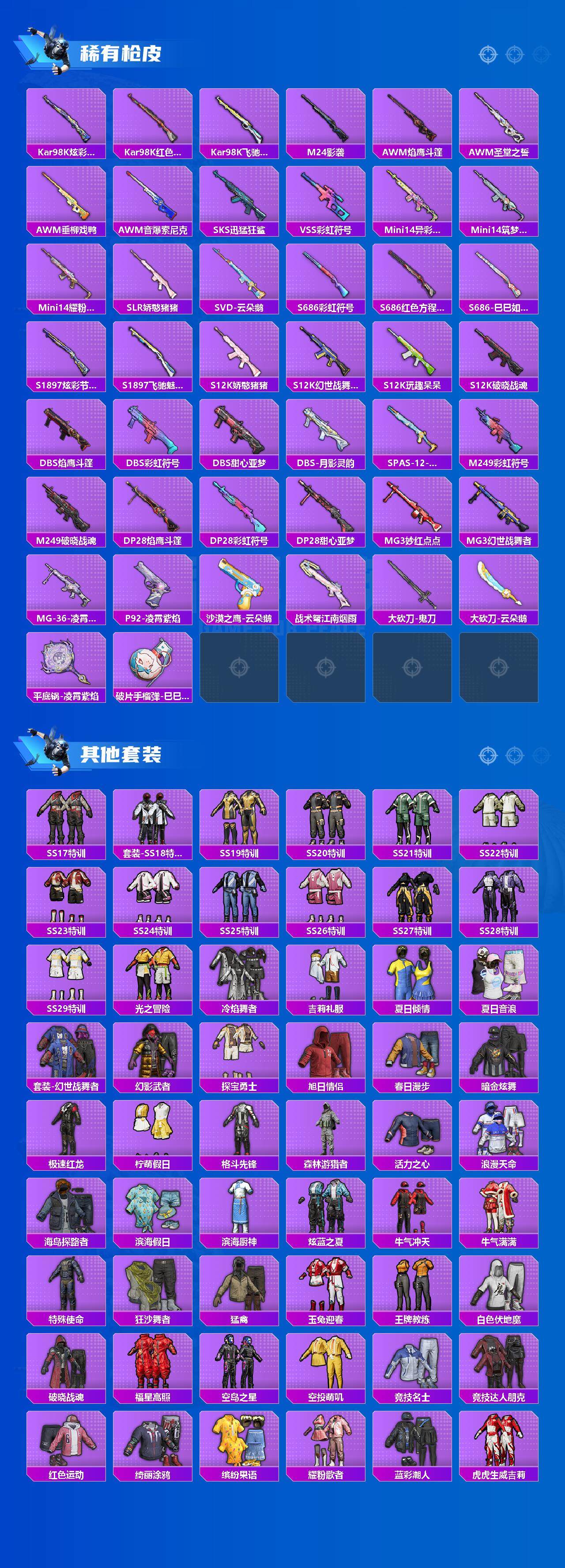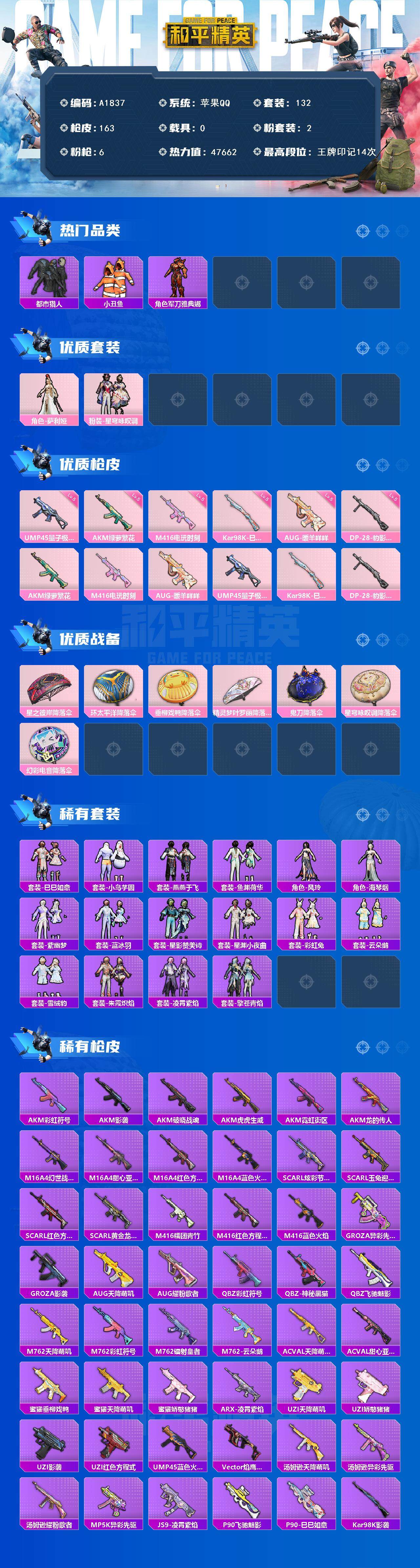 [14990077]苹果【小号/都市猎人】 手q-2粉装-6特效呛-0载具-0粉色飞行器-47662热力值-14王牌印记-132套装-163呛皮 【热门品类】:套装-浪漫天命,套装-都市猎人,套装-小丑鱼,角色-军刀雅典娜,套装-龟仙人 【粉色套装】:角色-萨利娅,粉装-星穹咏叹调 【粉色呛皮等级】:akm-绿萝繁花五级,m416-电玩时刻五级,aug-暖羊咩咩五级,ump45-量子极限五级,kar98k-巳巳如意五级,dp-28-豹影疾电五级 【粉色呛皮】:akm-绿萝繁花,m416-电玩时刻,aug-暖羊咩咩,ump45-量子极限,kar98k-巳巳如意,dp-28-豹影疾电 【粉色降落伞】:星之彼岸降落伞,环太平洋降落伞,垂柳戏鸭降落伞,精灵梦叶罗丽降落伞,鬼刀降落伞,星穹咏叹调降落伞,幻彩电音降落伞 【稀有套装】:套装-龟仙人,套装-巳巳如意,套装-小鸟芋圆,套装-燕燕于飞,套装-鱼渊荷华,角色-风玲,角色-海琴烟,套装-紫幽梦,套装-蓝冰羽,套装-星影赞美诗,套装-星渊小夜曲,套装-彩虹兔,套装-云朵鹅,套装-雪绒豹,套装-朱霞炽焰,套装-凌霄紫焰,套装-擎苍青焰 【稀有呛皮】:akm-彩虹符号,akm-影袭,akm-破晓战魂,akm-虎虎生威,akm-霓虹街区,akm-龙的传人,m16a4-幻世战舞者,m16a4-甜心亚梦,m16a4-红色方程式,m16a4-蓝色火焰,scar-l-炫彩节奏,scar-l-玉兔迎春,scar-l-红色方程式,scar-l-黄金龙骨,m416-糯团青竹,m416-红色方程式,m416-蓝色火焰,groza-异彩先驱,groza-影袭,aug-天降萌叽,aug-耀粉歌者,q-彩虹符号,q-神秘黑猫,q-飞驰魅影,m762-天降萌叽,m762-彩虹符号,m762-镭射皇者,m762-云朵鹅,ac-val-天降萌叽,ac-val-甜心亚梦,蜜獾-垂柳戏鸭,蜜獾-天降萌叽,蜜獾-娇憨猪猪,arx-凌霄紫焰,uzi-天降萌叽,uzi-娇憨猪猪,uzi-影袭,uzi-红色方程式,ump45-蓝色火焰,vect-焰鹰斗篷,汤姆逊-天降萌叽,汤姆逊-异彩先驱,汤姆逊-耀粉歌者,mp5k-异彩先驱,js9-凌霄紫焰,p90-飞驰魅影,p90-巳巳如意,kar98k-影袭,kar98k-炫彩节奏,kar98k-红色方程式