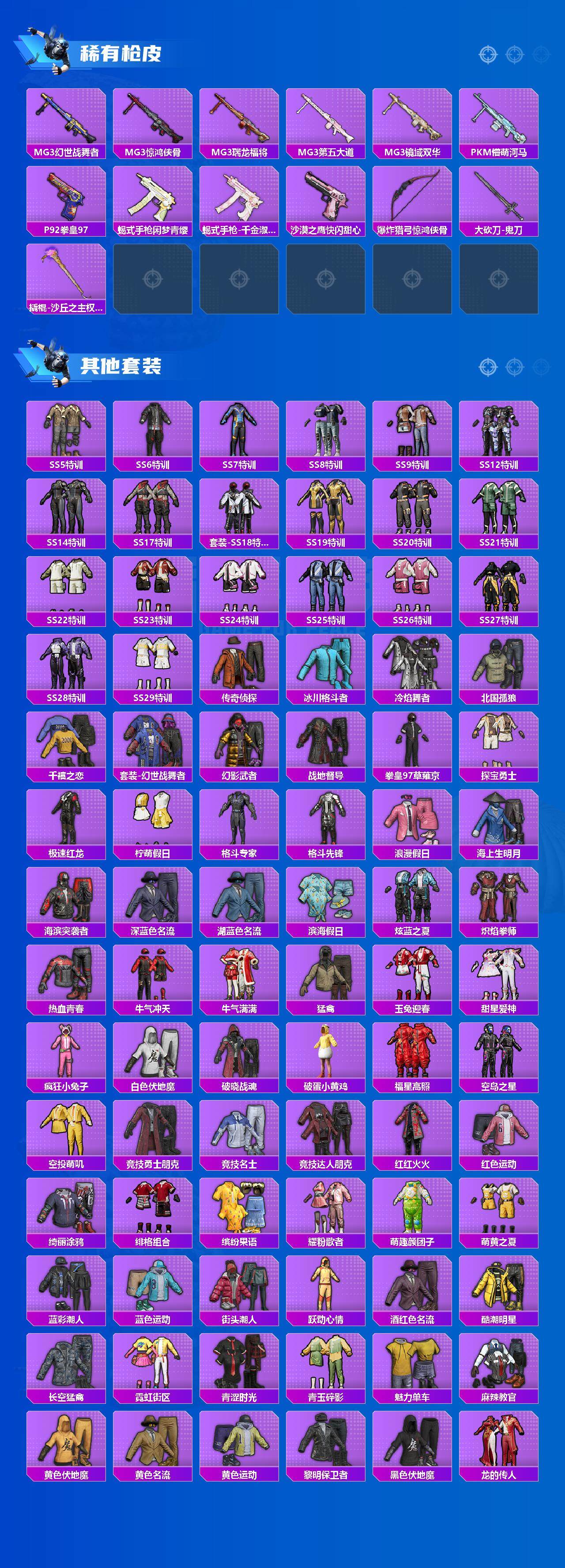 2载具-163套装-215呛皮-163套装/呛械8/装备254/载具2/战备130/王牌印记9/热力值71907/六级akm-梦之光华/六级scar-l-梦幻火箭/五级scar-l-锦绣绵绵/七级m416-五爪金龙/五级kar98k-巳巳如意/五级amr-炫光之旅/五级dp-28-千金淑猫/一级dp-28-豹影疾电/深海小丑鱼/奇异狩猎者/军刀雅典娜/套装-龟仙人/套装-浪漫波比/套装-红红火火/天使彩虹糖/暗夜玫瑰/山涧鹿