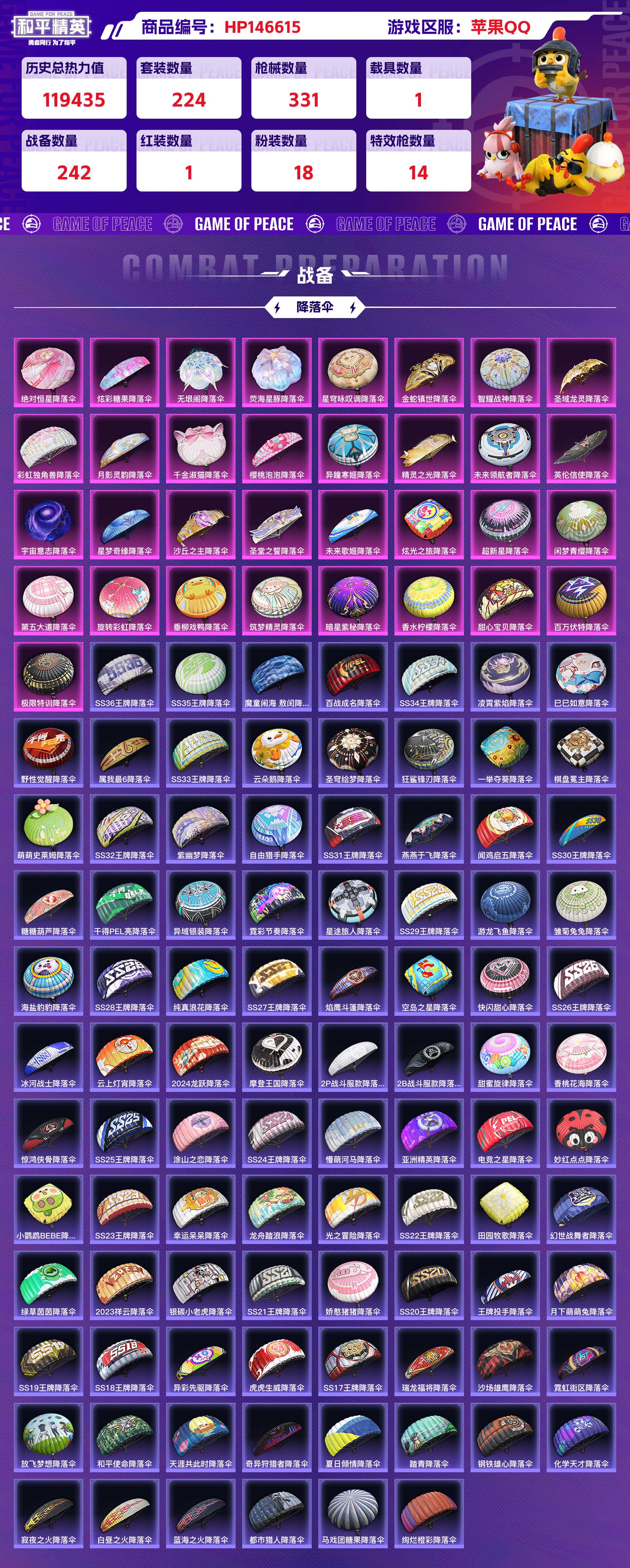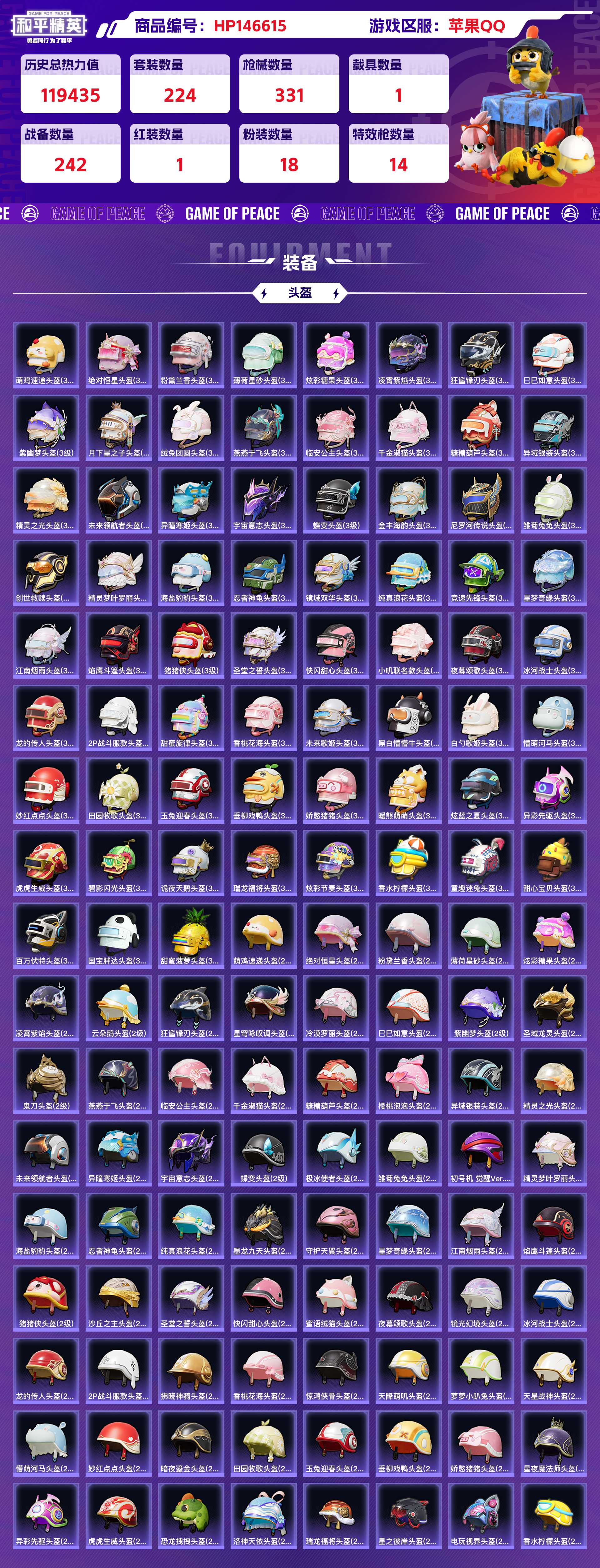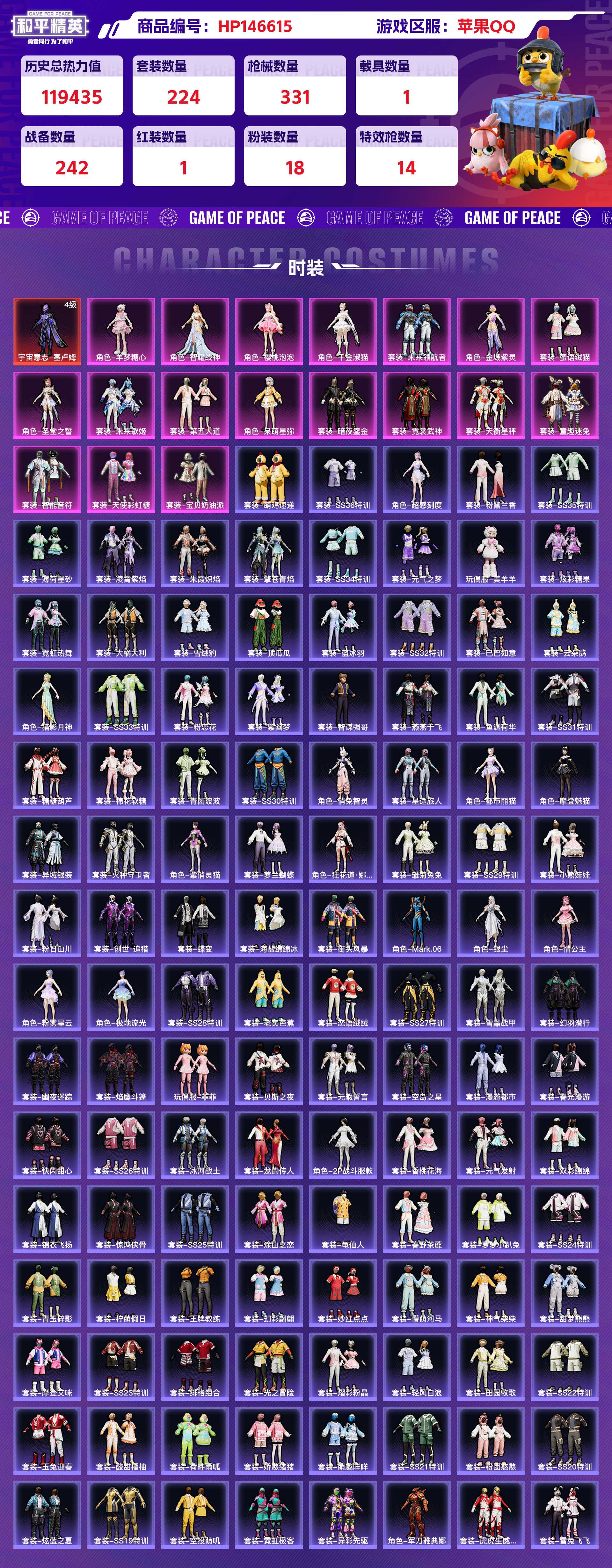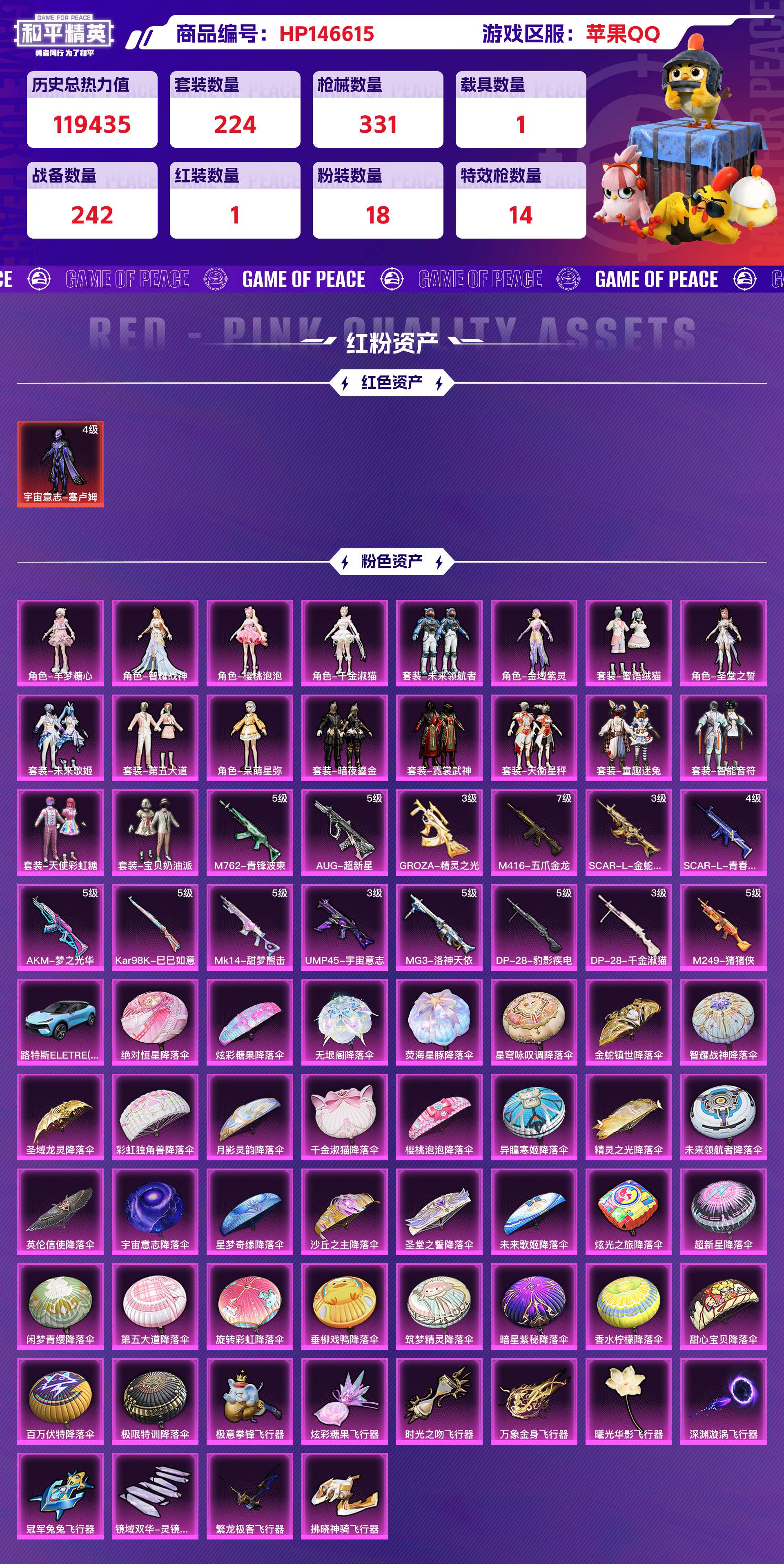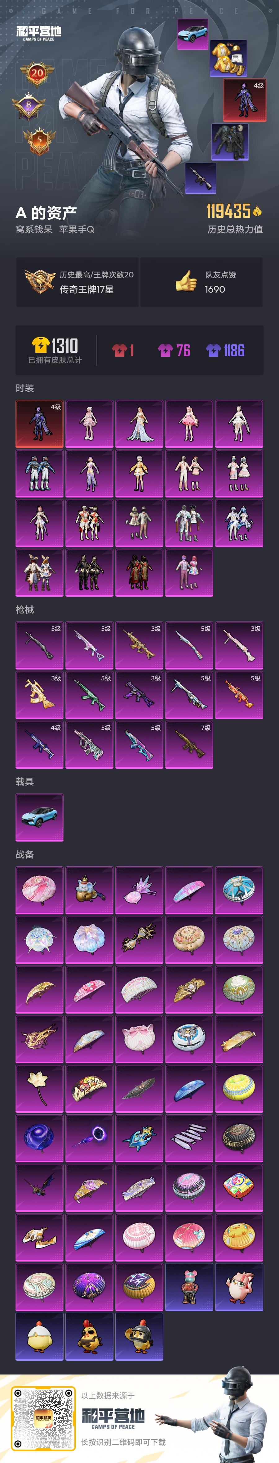 2310297-苹果qq 历史总热力值:119435 红装数量:1 粉装数量:18 特效呛数量:14 载具数量:1 王牌印记:20 历史最高段位:传奇王牌17星 套装数量:224 时装数量:833 呛械数量:331 战备数量:242 装备数量:512 载具:路特斯eletre冰川蓝 时装:宇宙意志-塞卢姆4级套装-天使彩虹糖套装-天衡星秤套装-宝贝奶油派套装-智能音符套装-